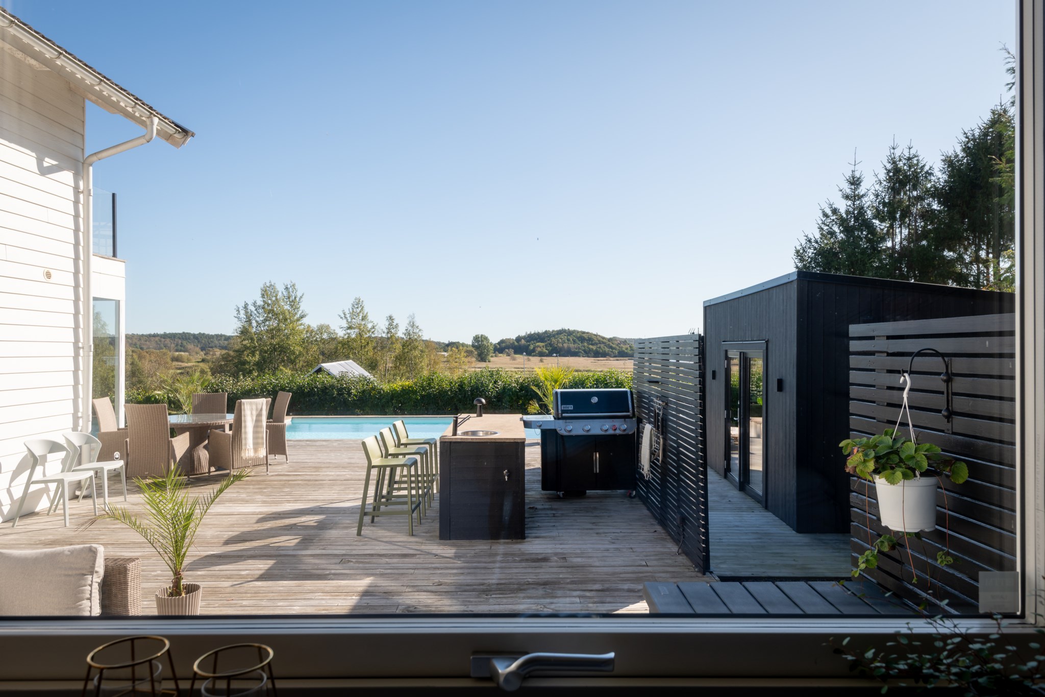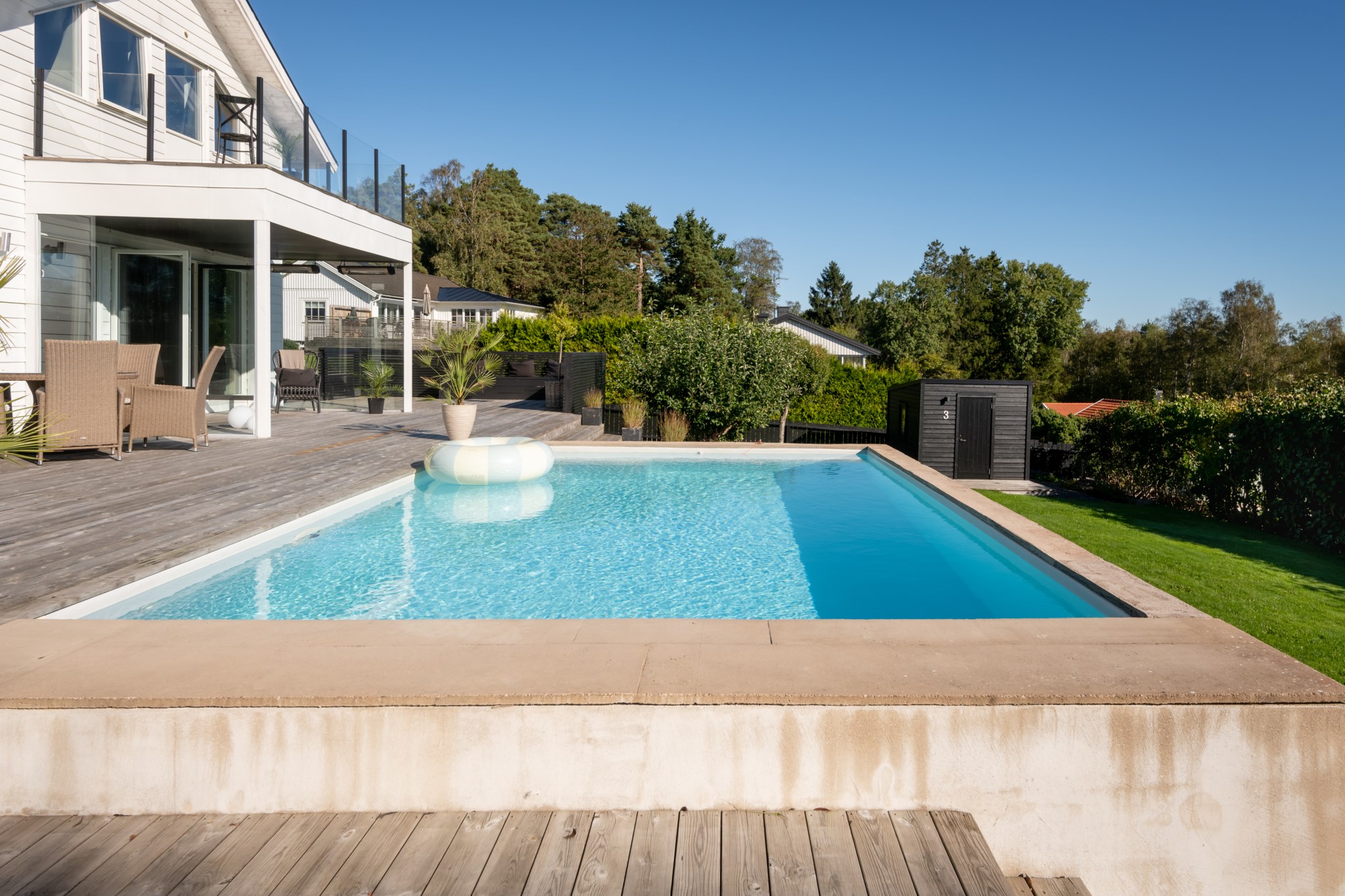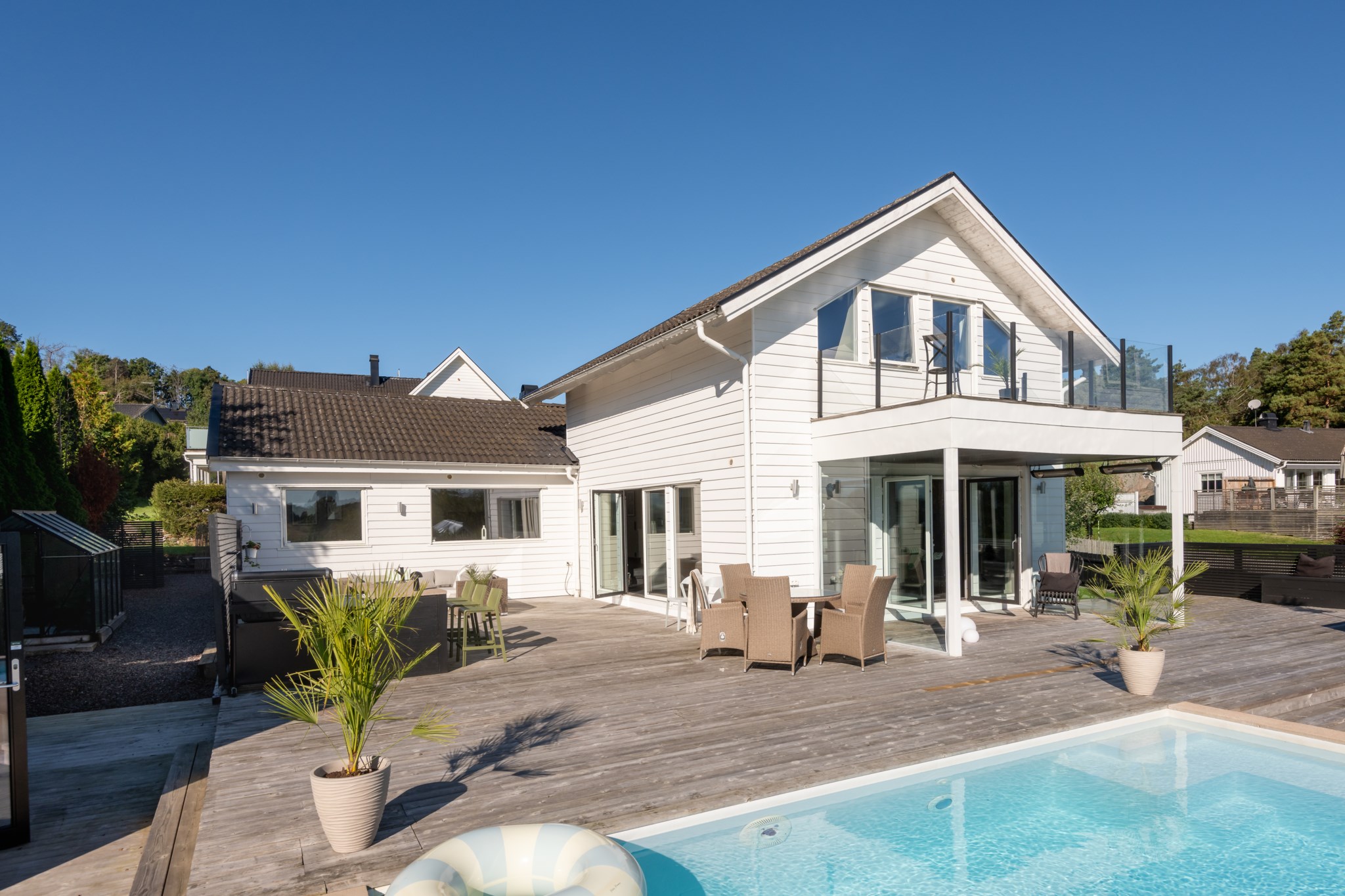 Utemiljön är skapt för livsnjutning året om. Här samsas den gjutna poolen, altaner i flera nivåer, växthus och gröna ytor med gästhus, garage och förråd. Gästhuset/poolhuset med egen utedusch ger extra komfort för boende eller avskildhet. Varje detalj andas omtanke och kvalitet.