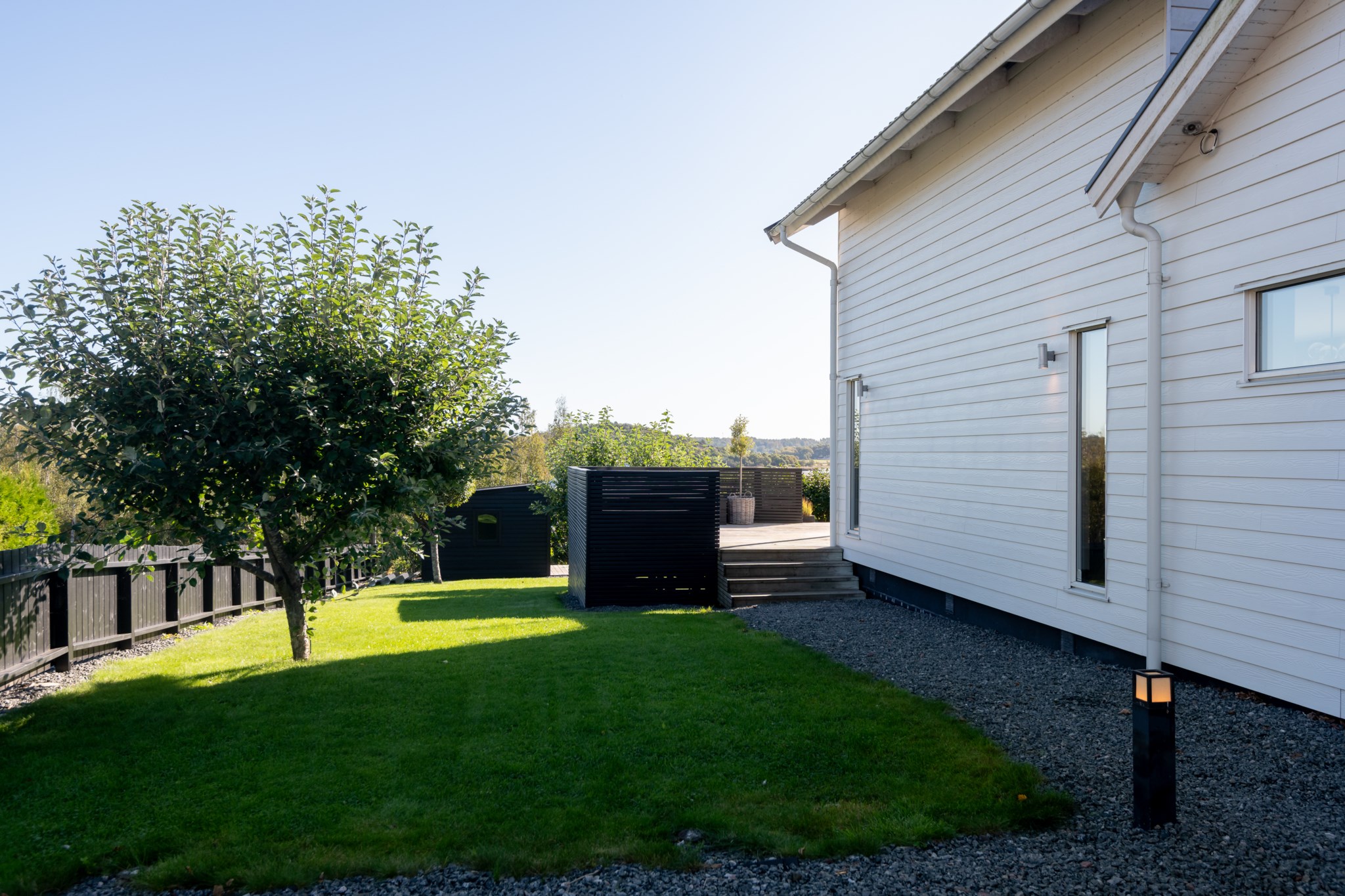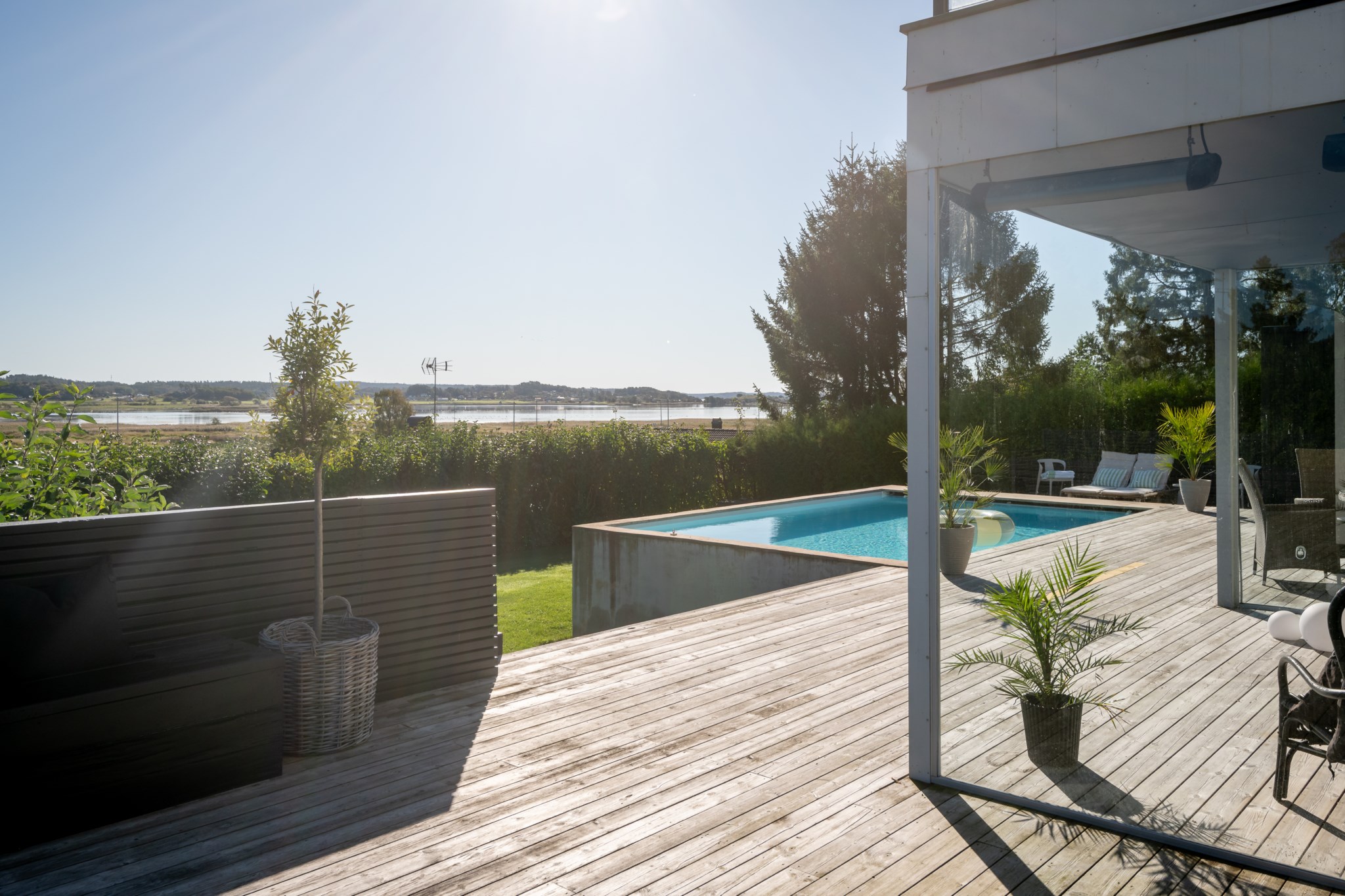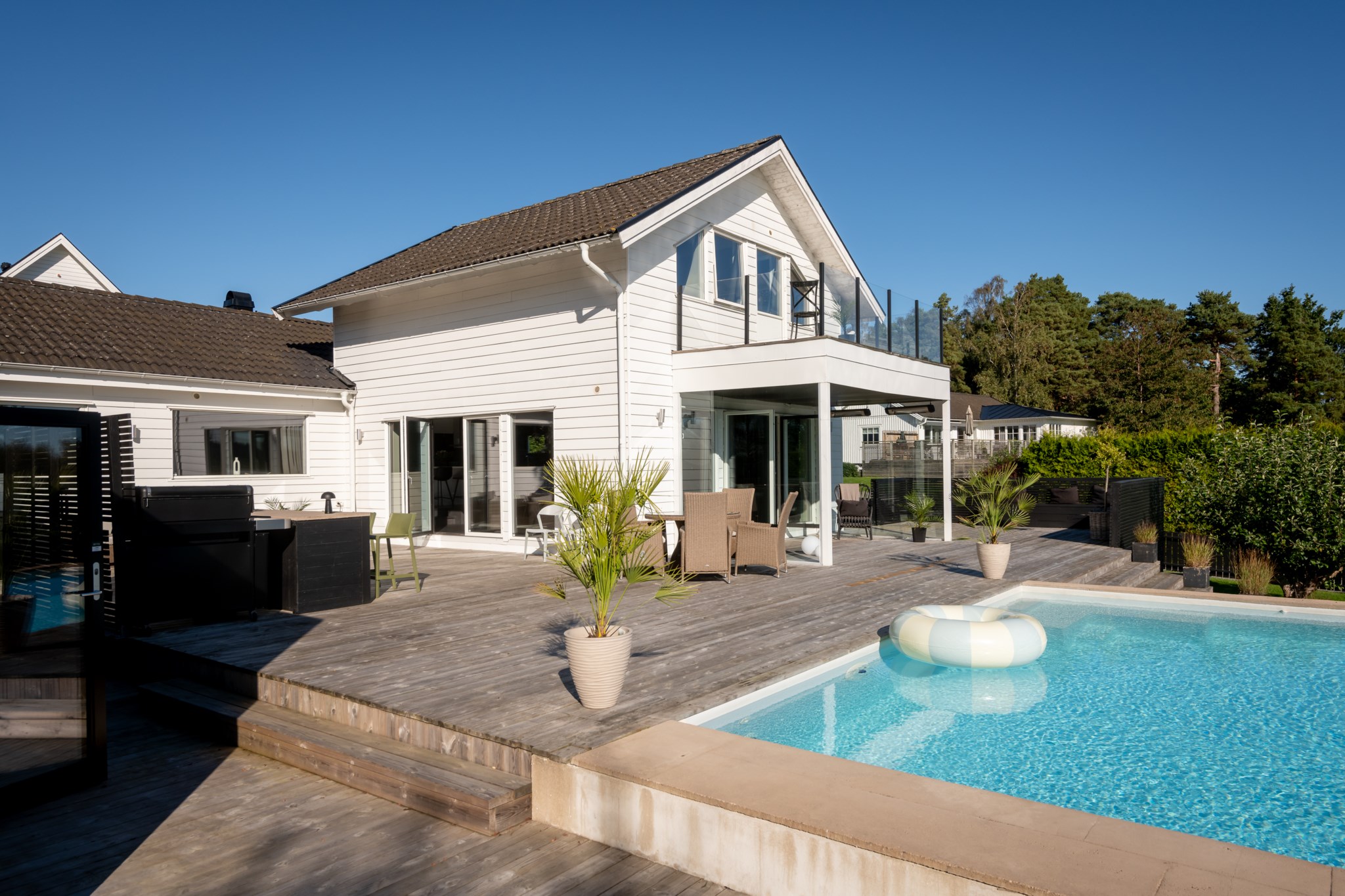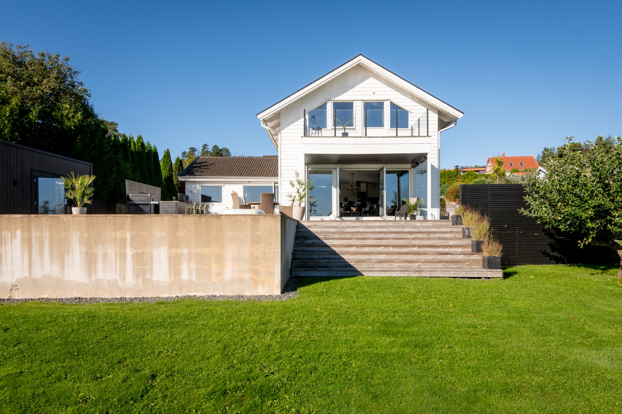 Tomten är utformad för att skapa harmoni mellan insynsskyddad grönska och öppna vyer mot fjorden. Den gjutna poolen blir sommarens mittpunkt, medan flera altaner, utekök, växthus och gräsytor inbjuder till både stilla stunder och livliga samlingar. Här ryms barnens lek, vännernas långmiddagar och kvällar där solen dröjer sig kvar över havet.