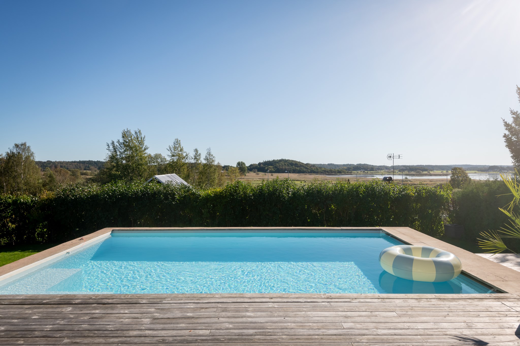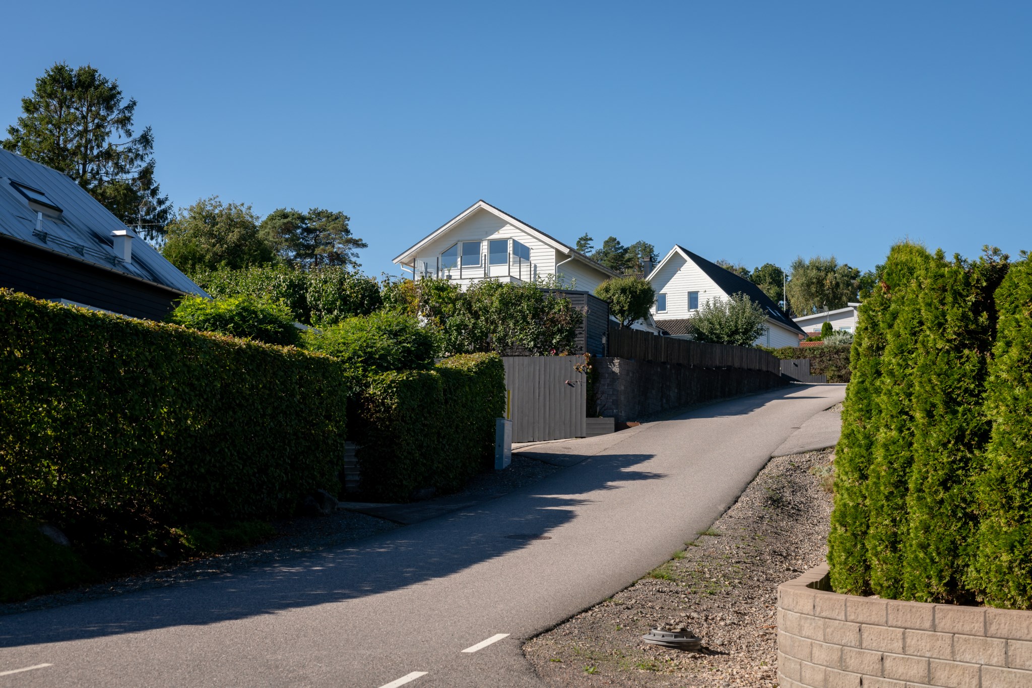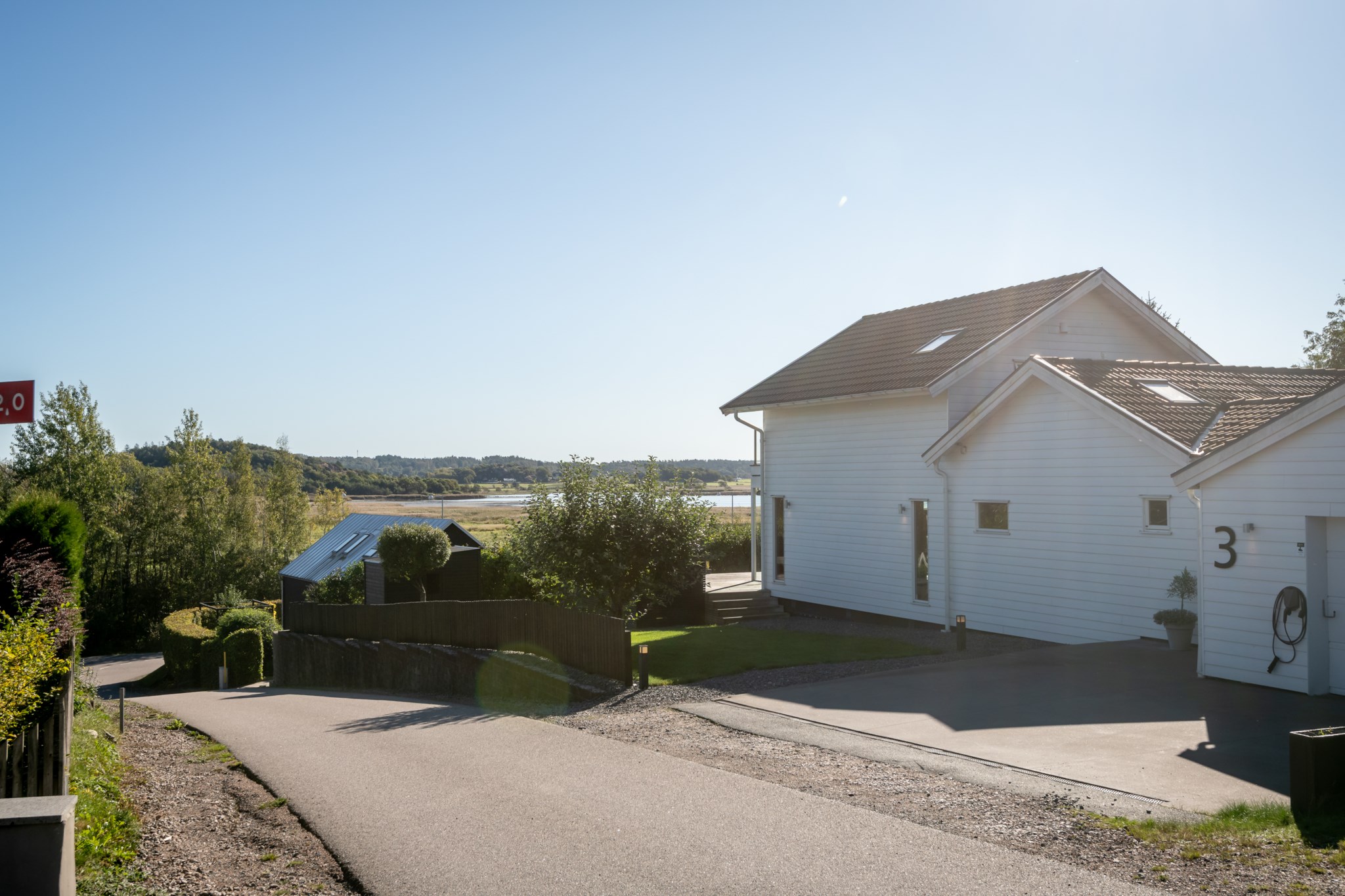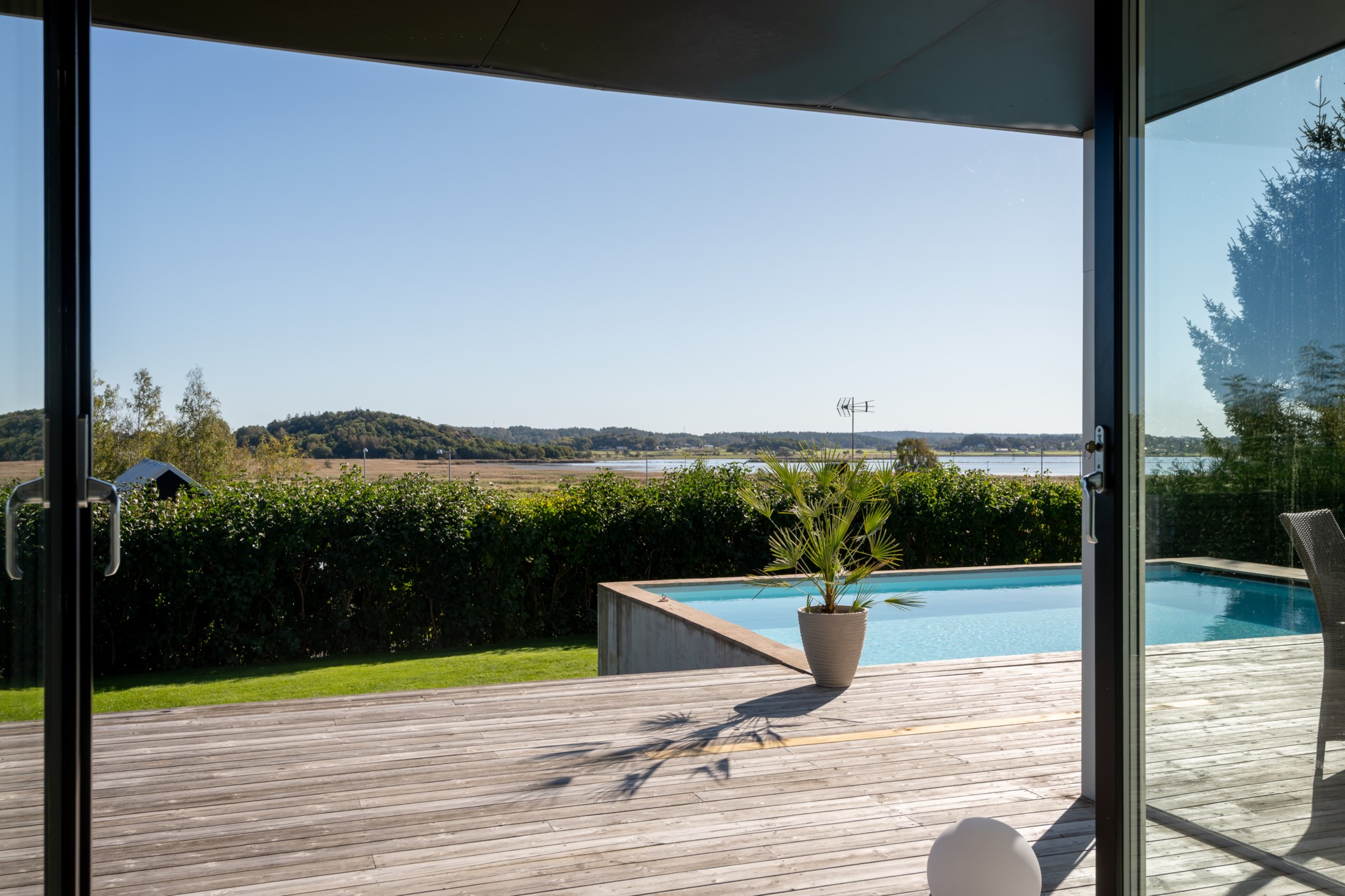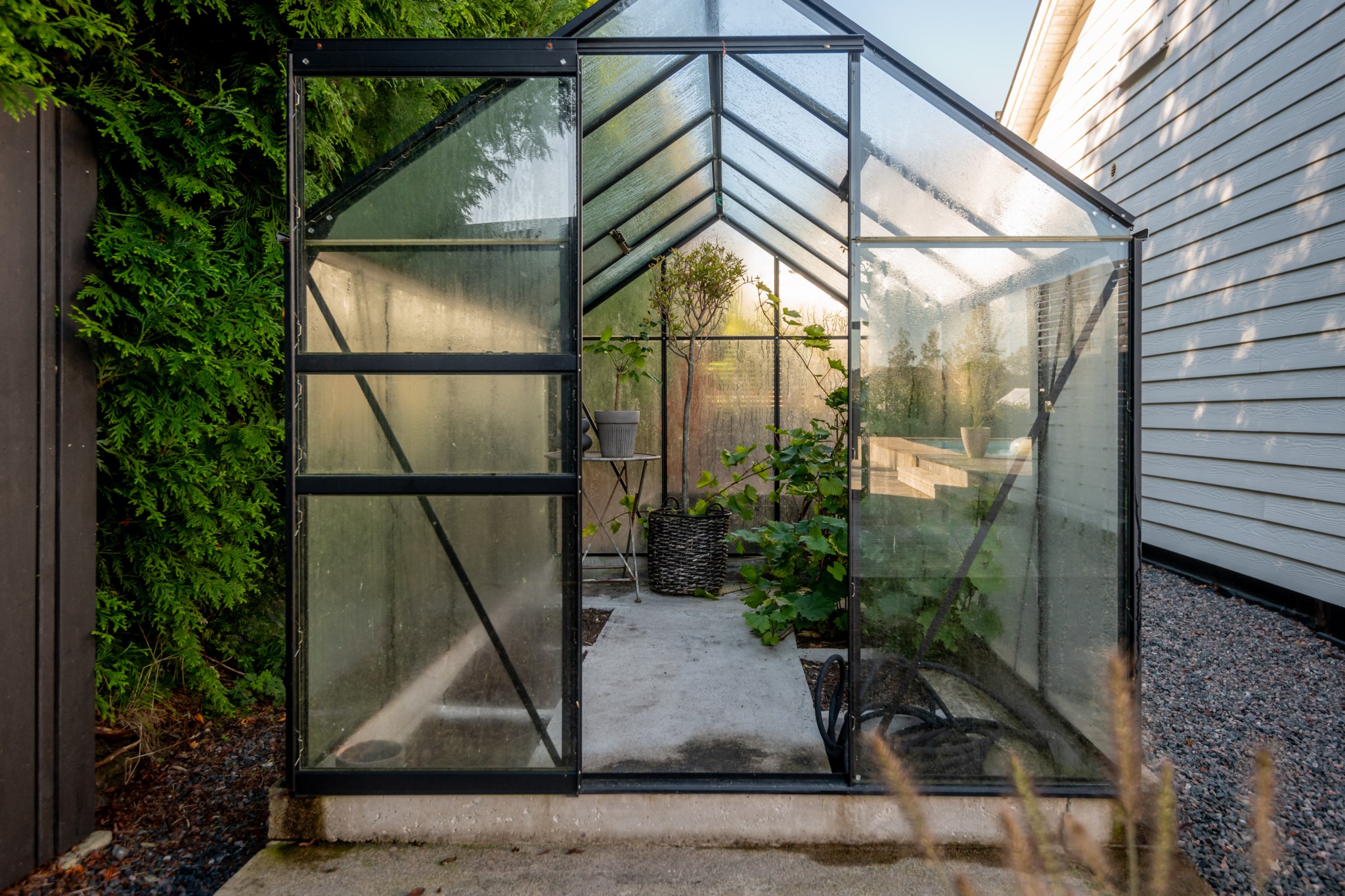 Tomten är utformad för att skapa harmoni mellan insynsskyddad grönska och öppna vyer mot fjorden. Den gjutna poolen blir sommarens mittpunkt, medan flera altaner, utekök, växthus och gräsytor inbjuder till både stilla stunder och livliga samlingar. Här ryms barnens lek, vännernas långmiddagar och kvällar där solen dröjer sig kvar över havet.