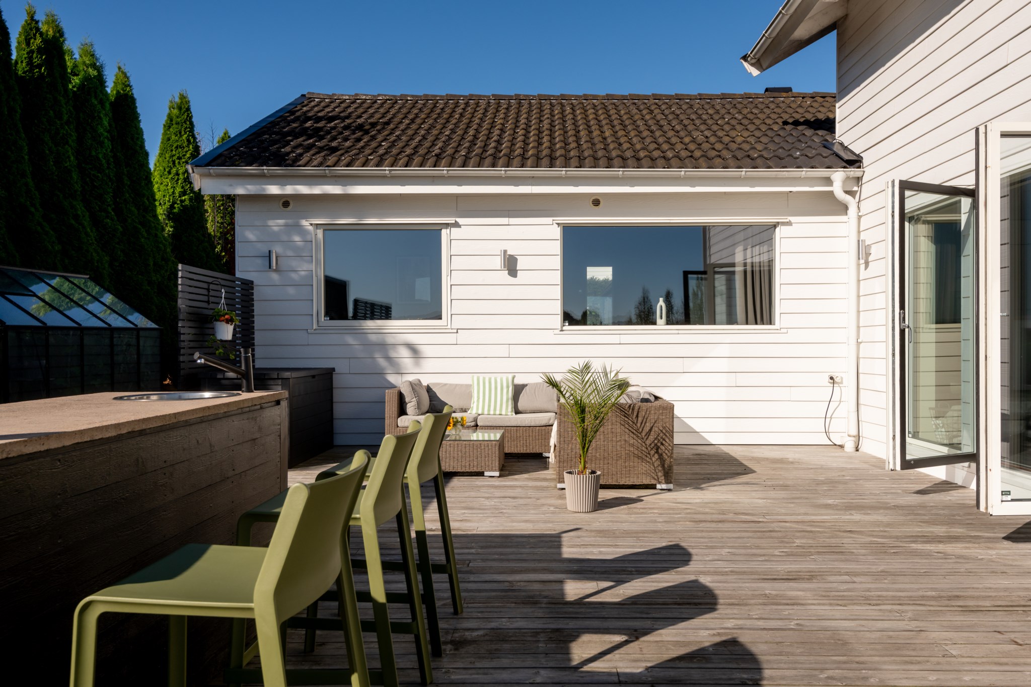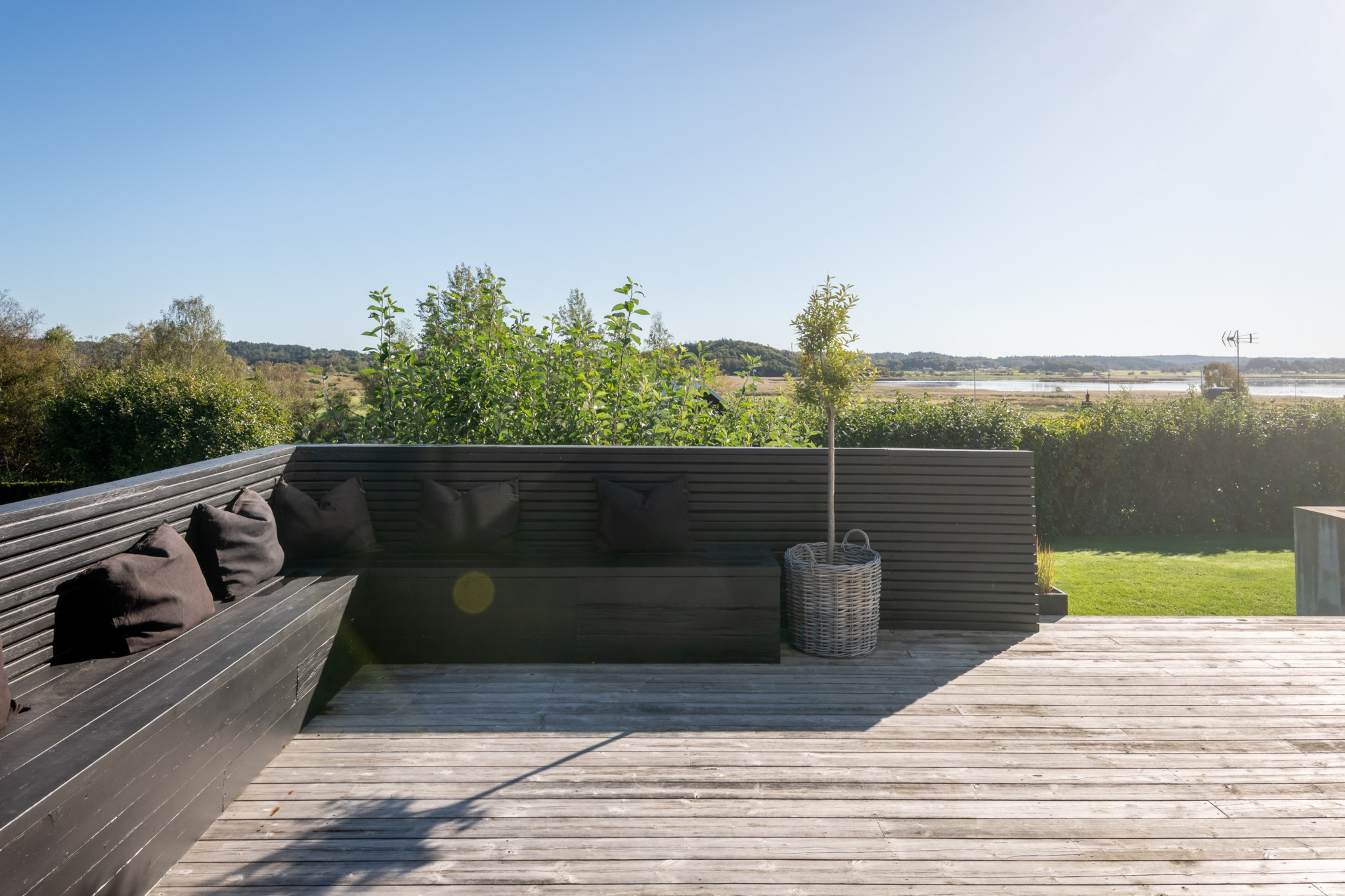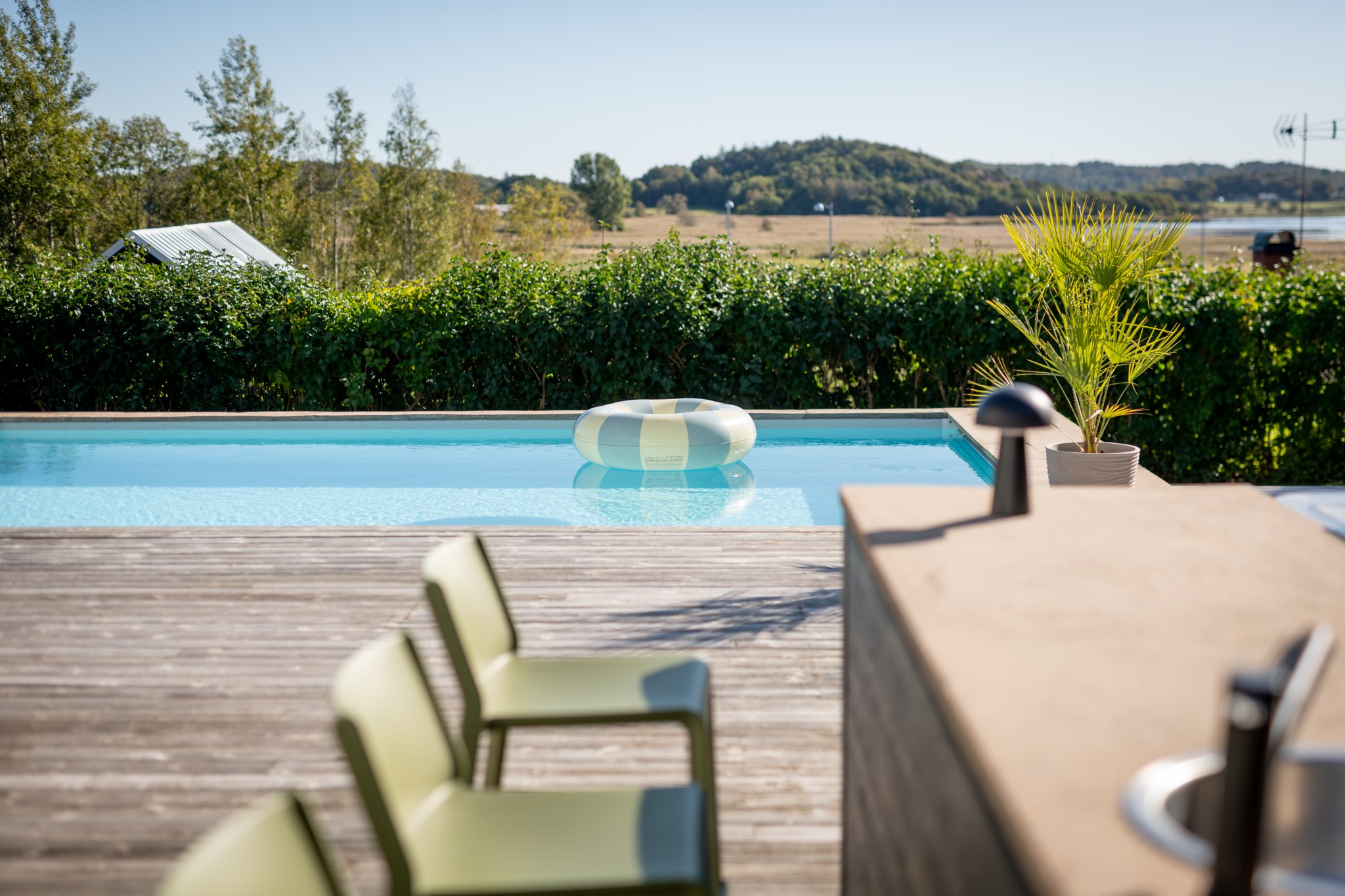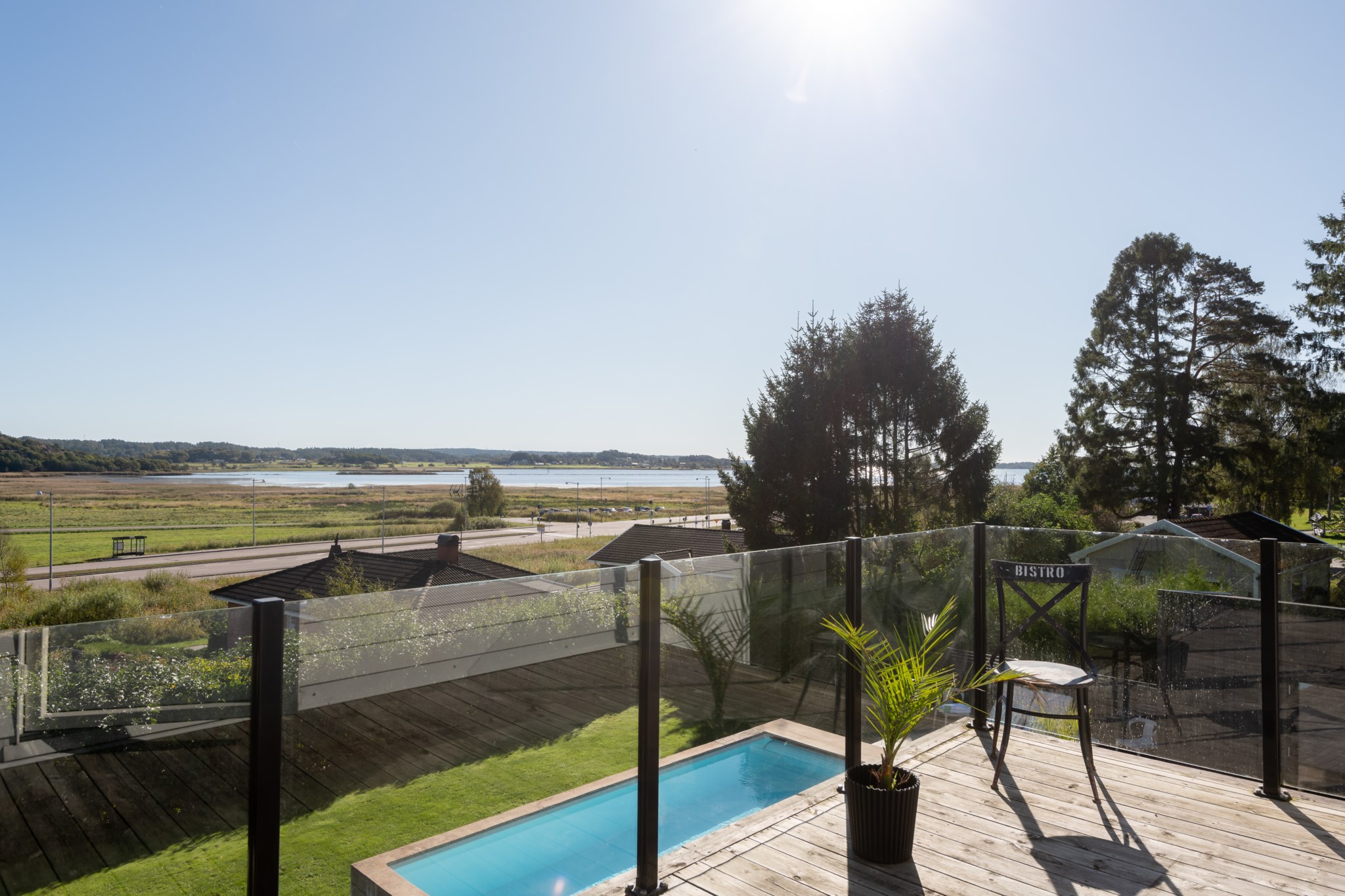 Tomten är utformad för att skapa harmoni mellan insynsskyddad grönska och öppna vyer mot fjorden. Den gjutna poolen blir sommarens mittpunkt, medan flera altaner, utekök, växthus och gräsytor inbjuder till både stilla stunder och livliga samlingar. Här ryms barnens lek, vännernas långmiddagar och kvällar där solen dröjer sig kvar över havet.