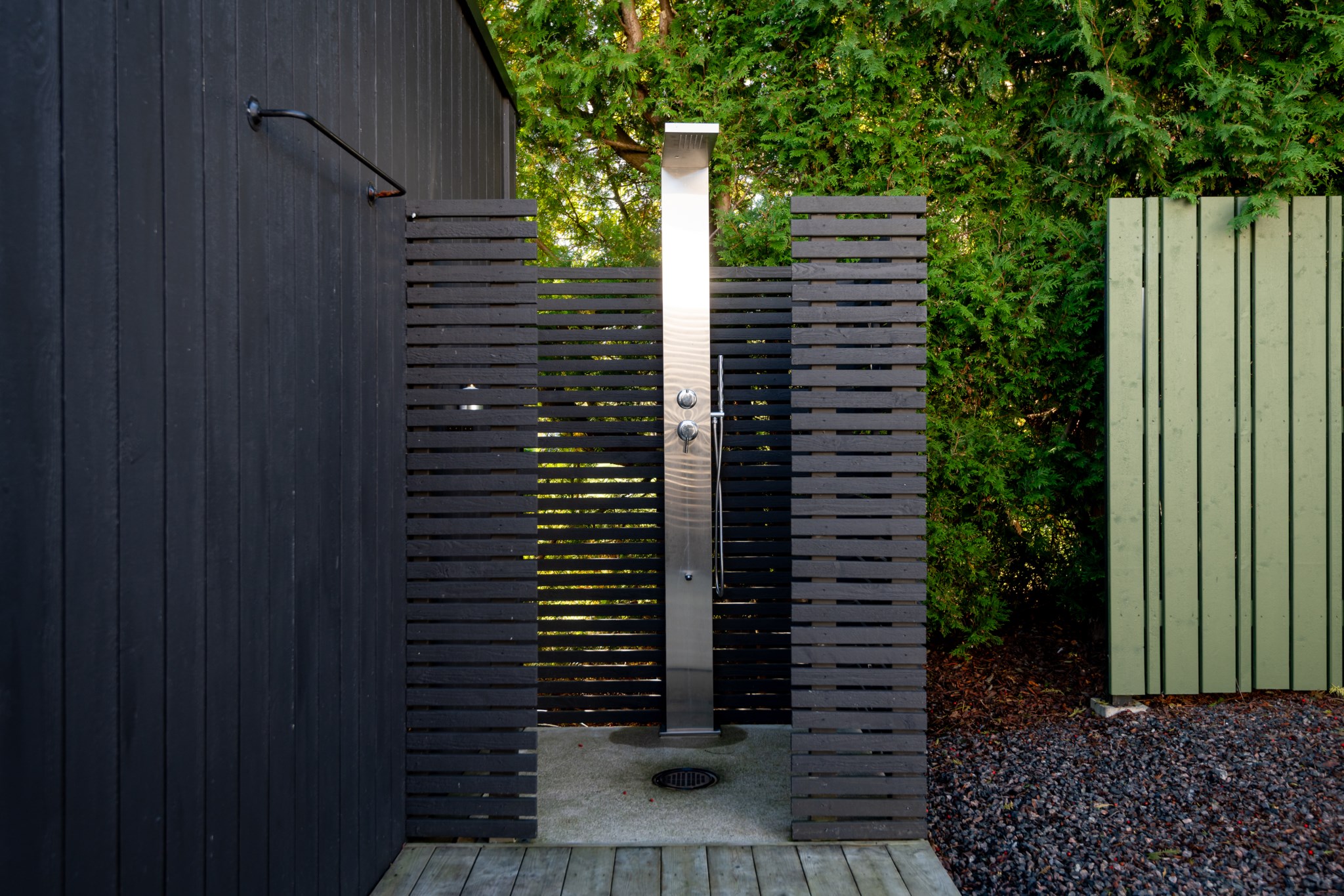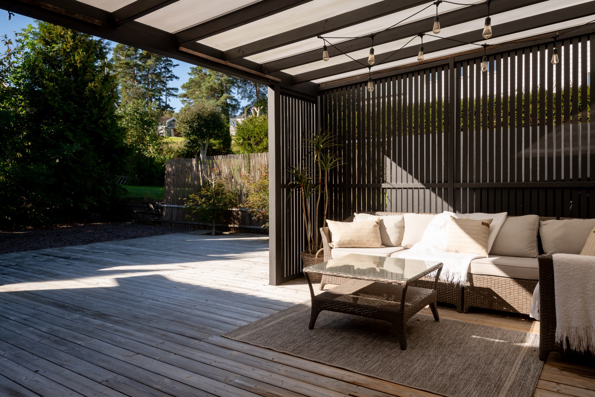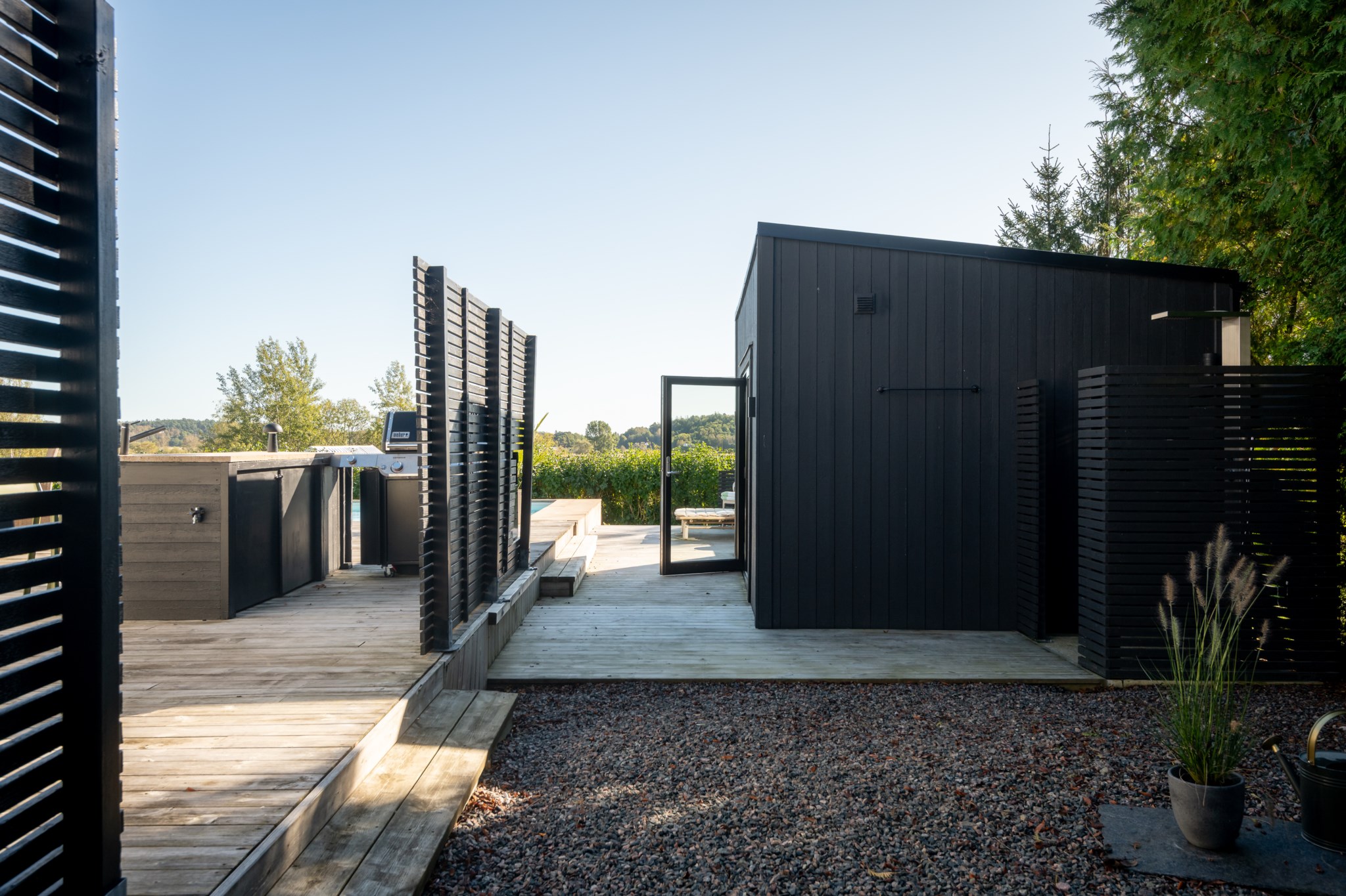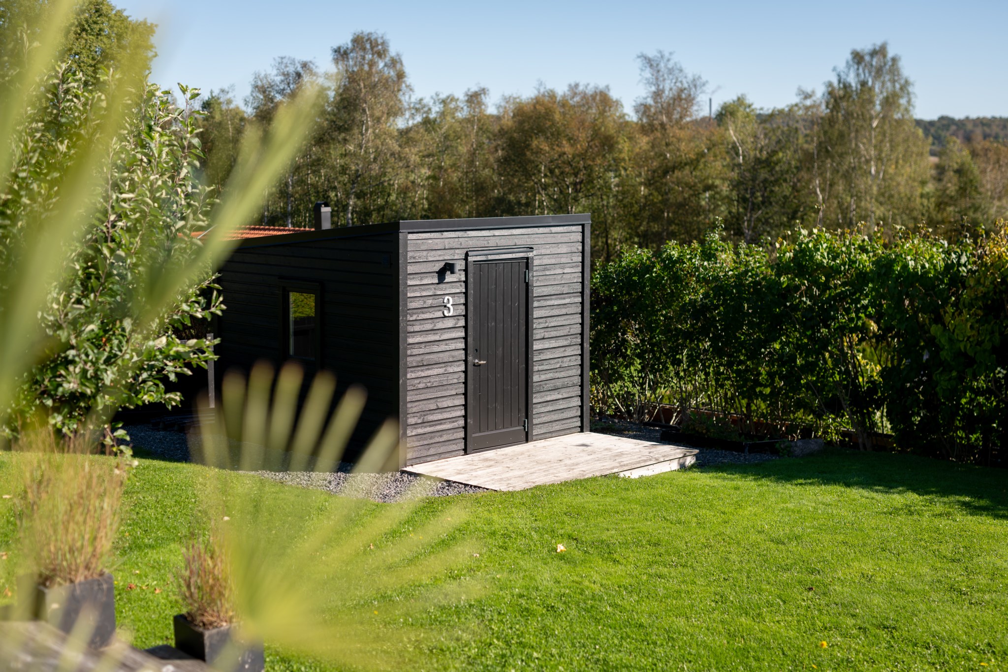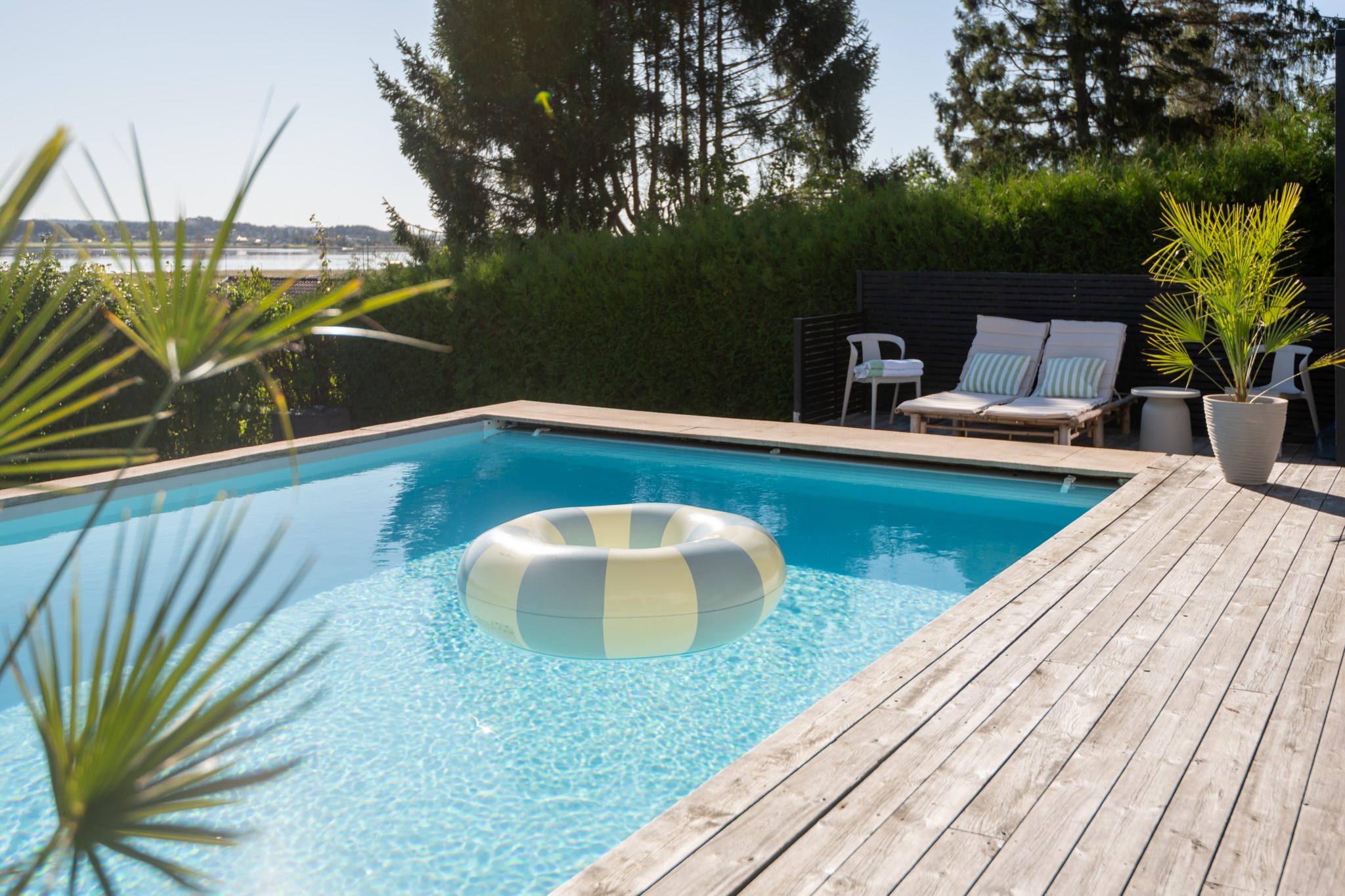 Tomten är utformad för att skapa harmoni mellan insynsskyddad grönska och öppna vyer mot fjorden. Den gjutna poolen blir sommarens mittpunkt, medan flera altaner, utekök, växthus och gräsytor inbjuder till både stilla stunder och livliga samlingar. Här ryms barnens lek, vännernas långmiddagar och kvällar där solen dröjer sig kvar över havet.