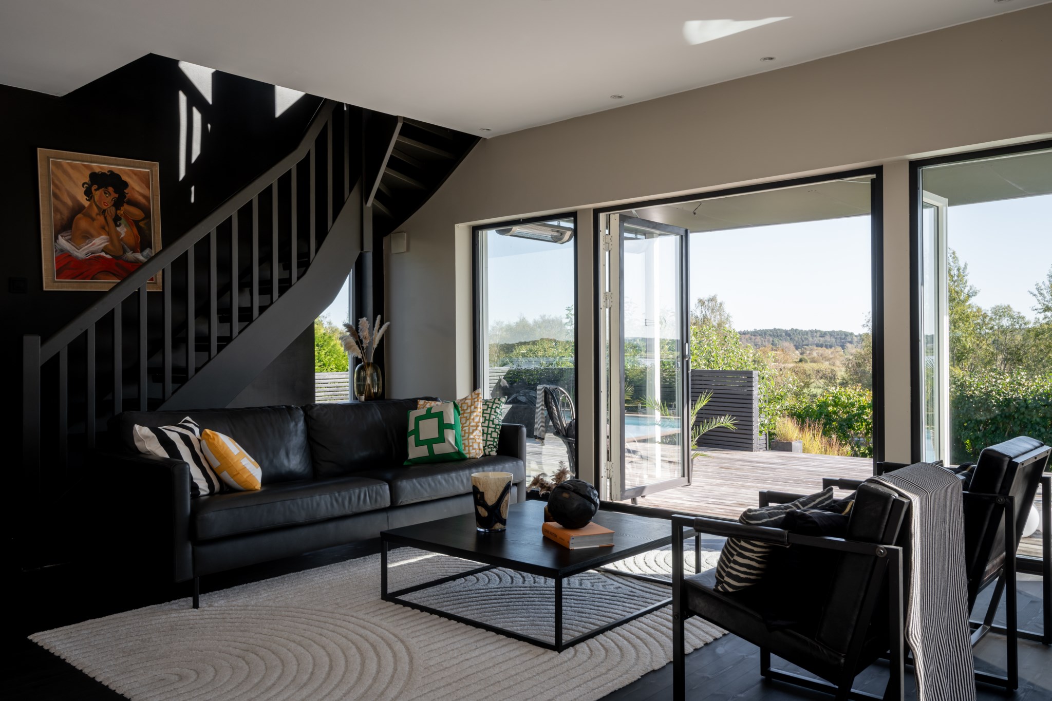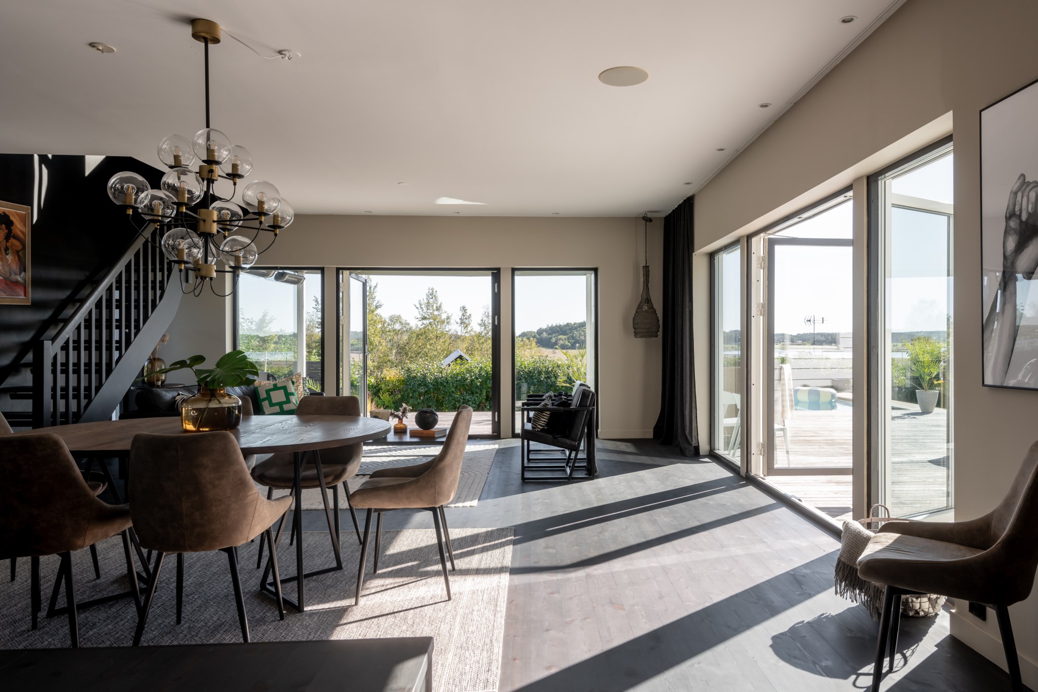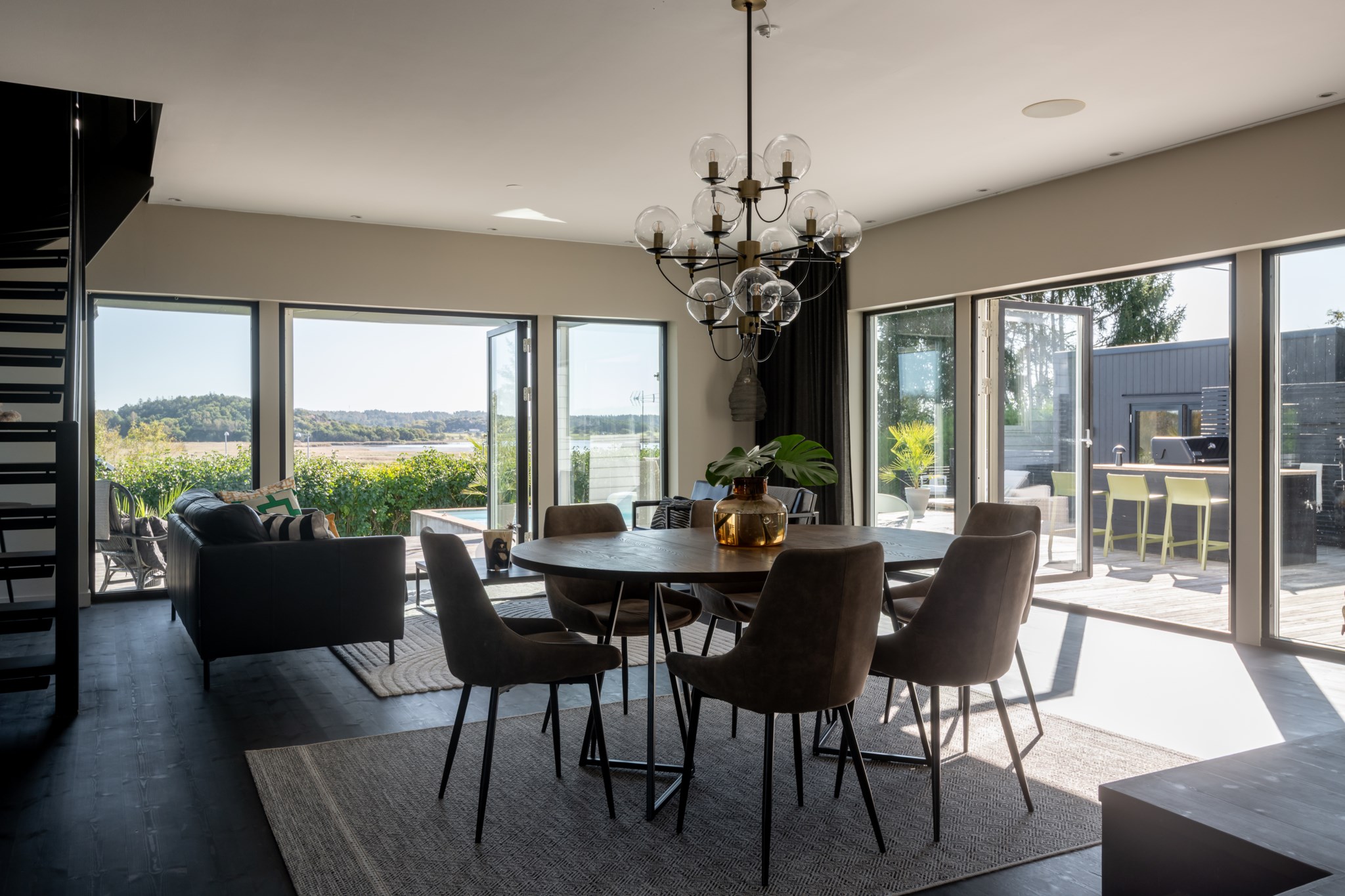 Sällskapsytorna är flera och kompletterar varandra – vardagsrummet med täljstenskamin bjuder in till samvaro, medan ytterligare en exklusiv sällskapsdel öppnar sig direkt mot poolområdet.