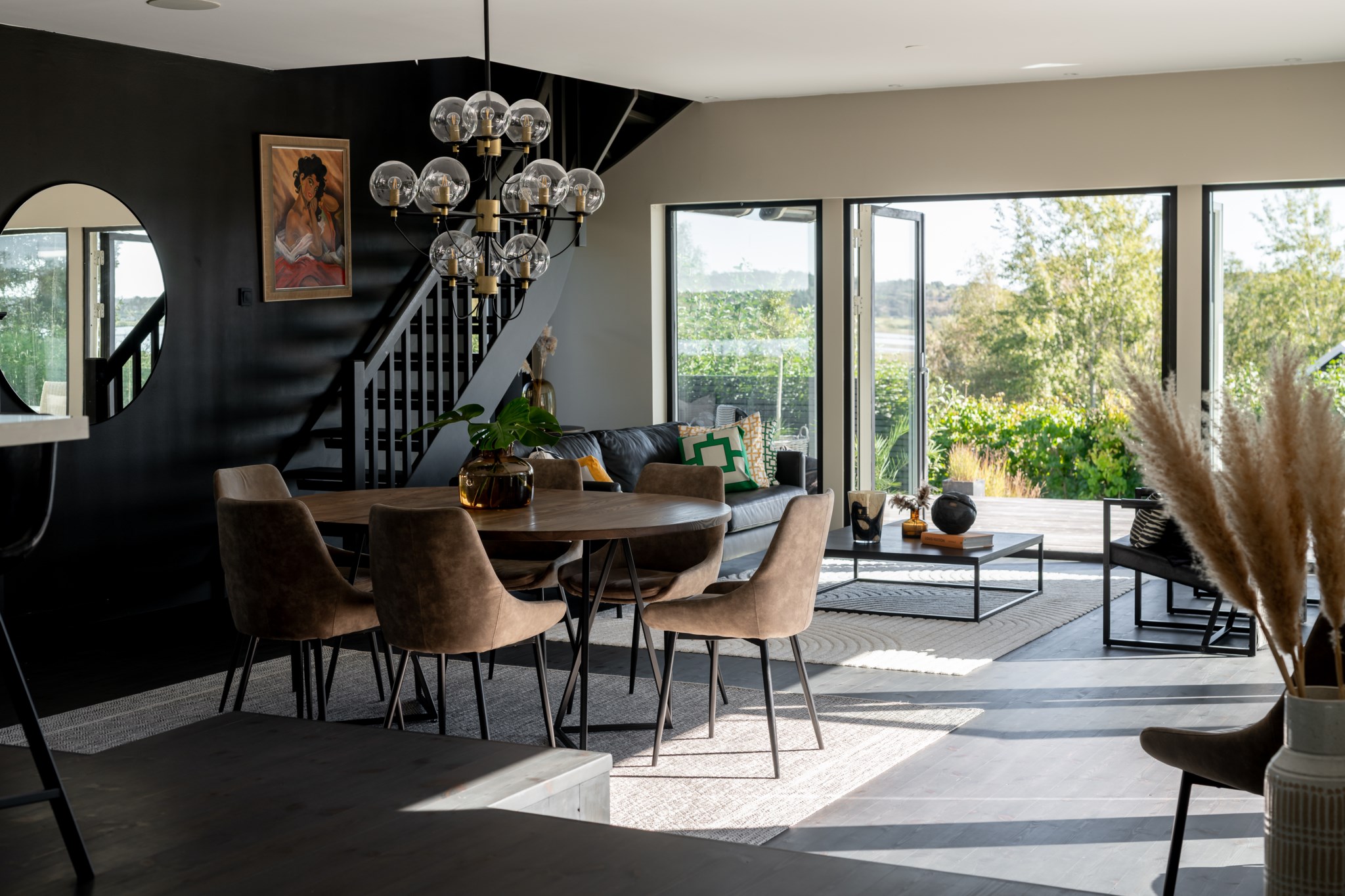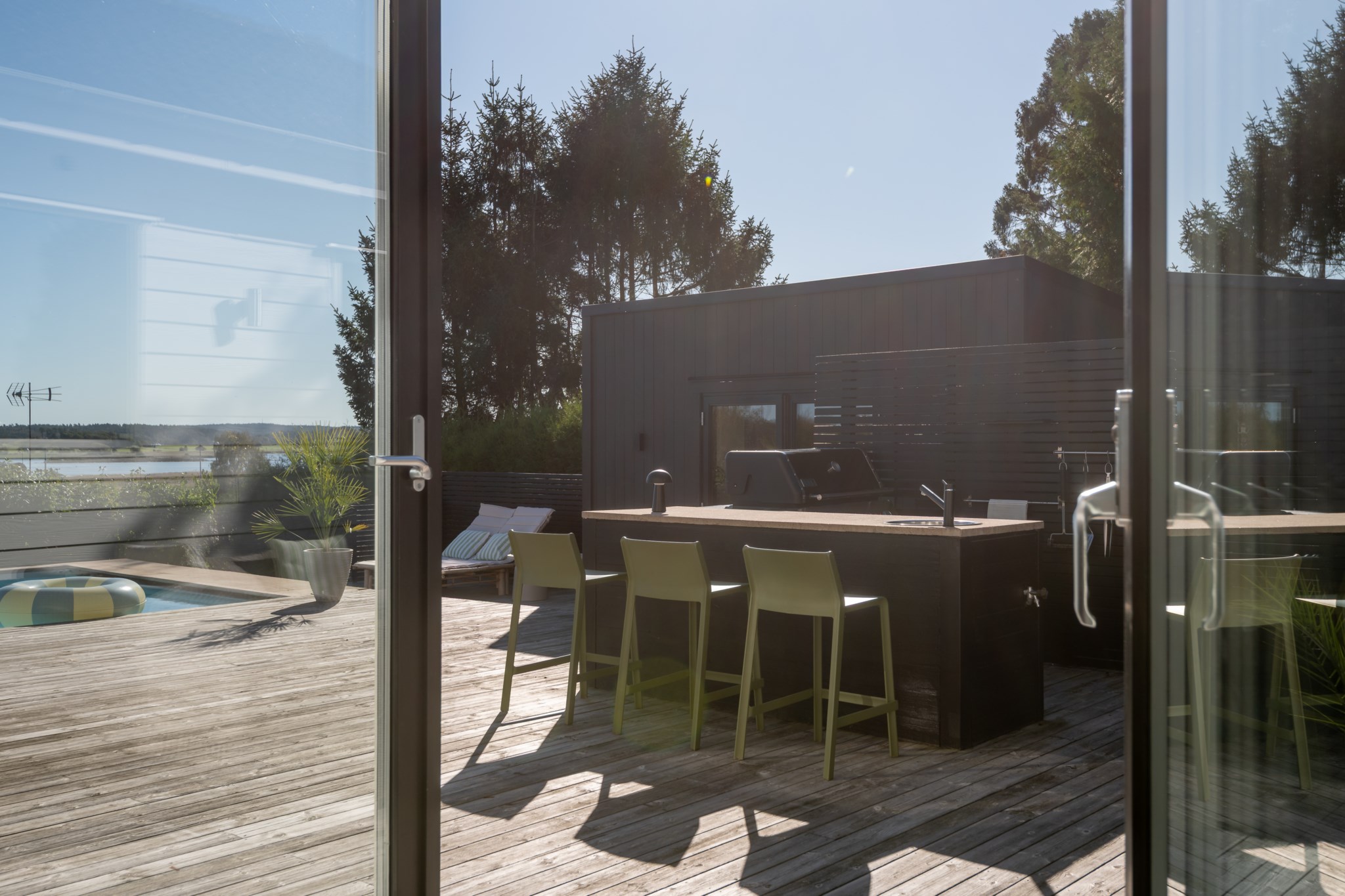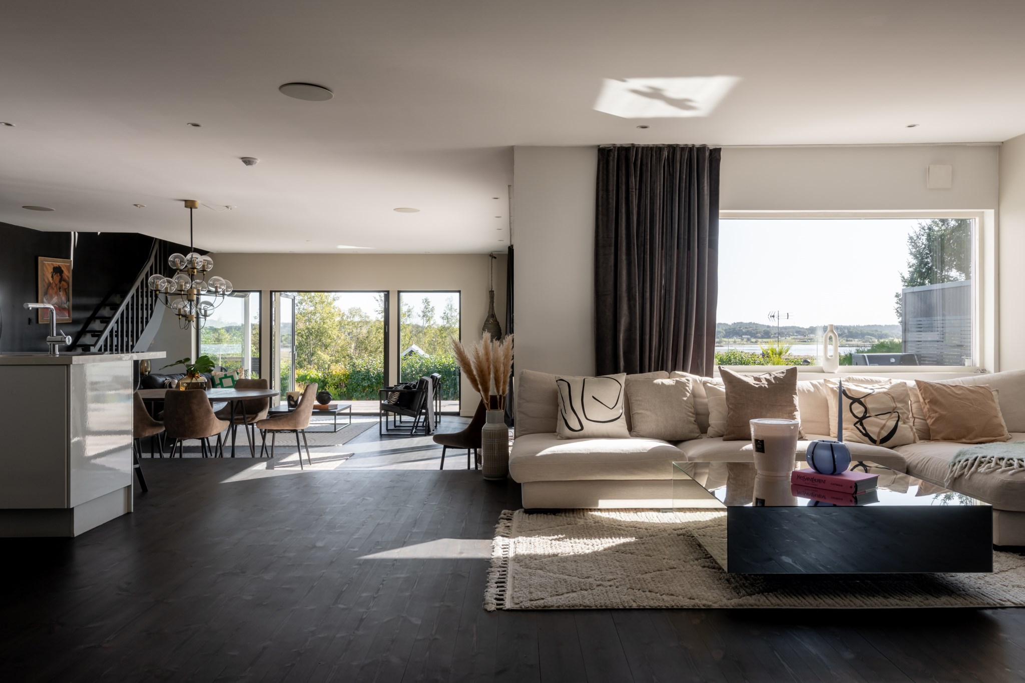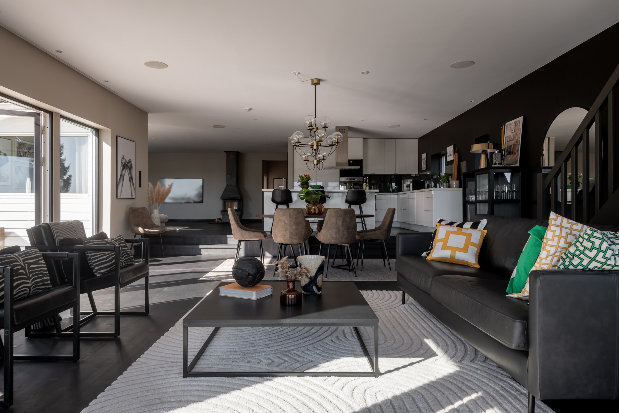 Sällskapsytorna är flera och kompletterar varandra – vardagsrummet med täljstenskamin bjuder in till samvaro, medan ytterligare en exklusiv sällskapsdel öppnar sig direkt mot poolområdet.