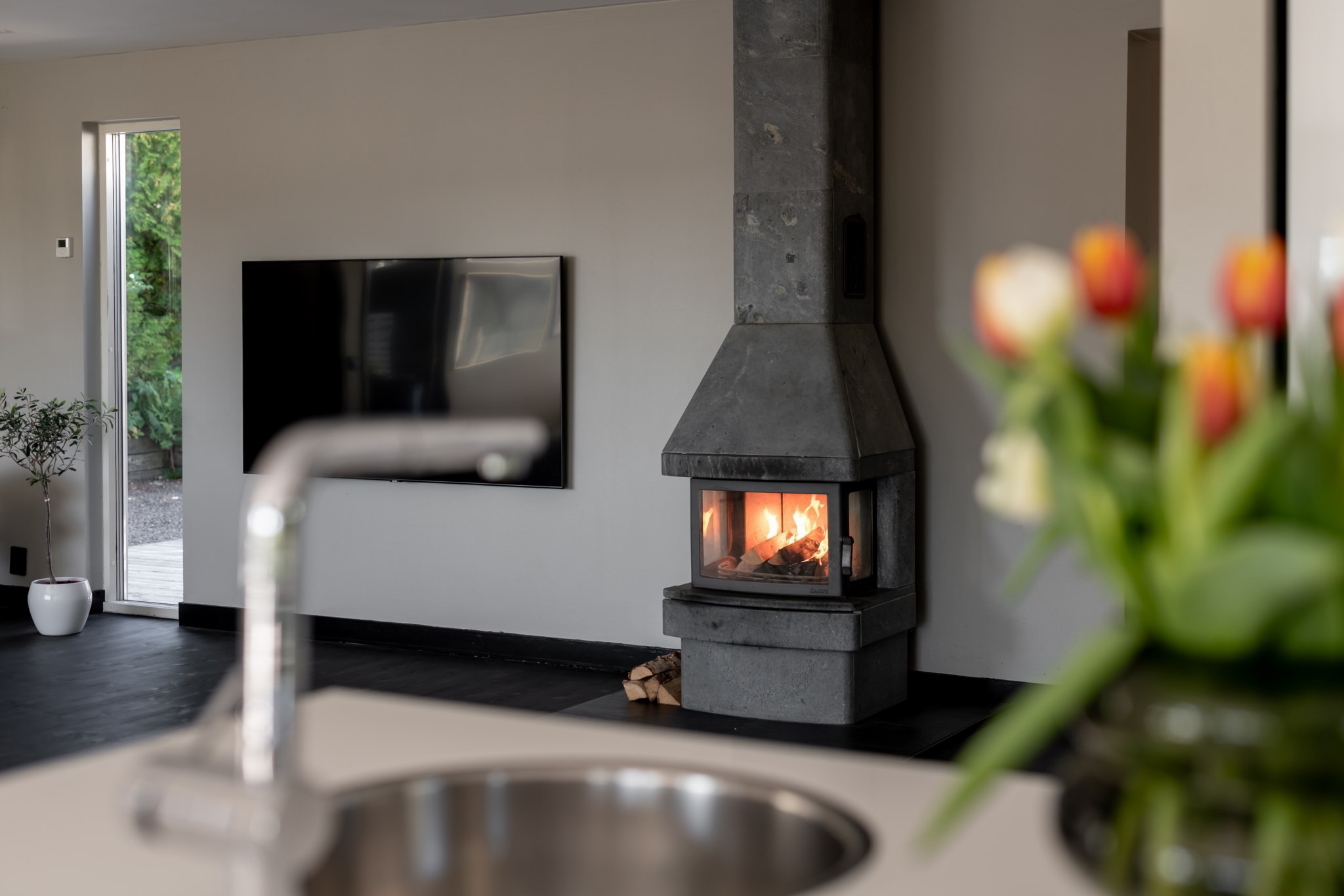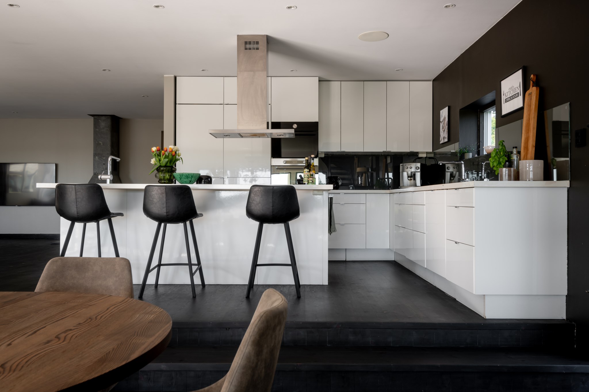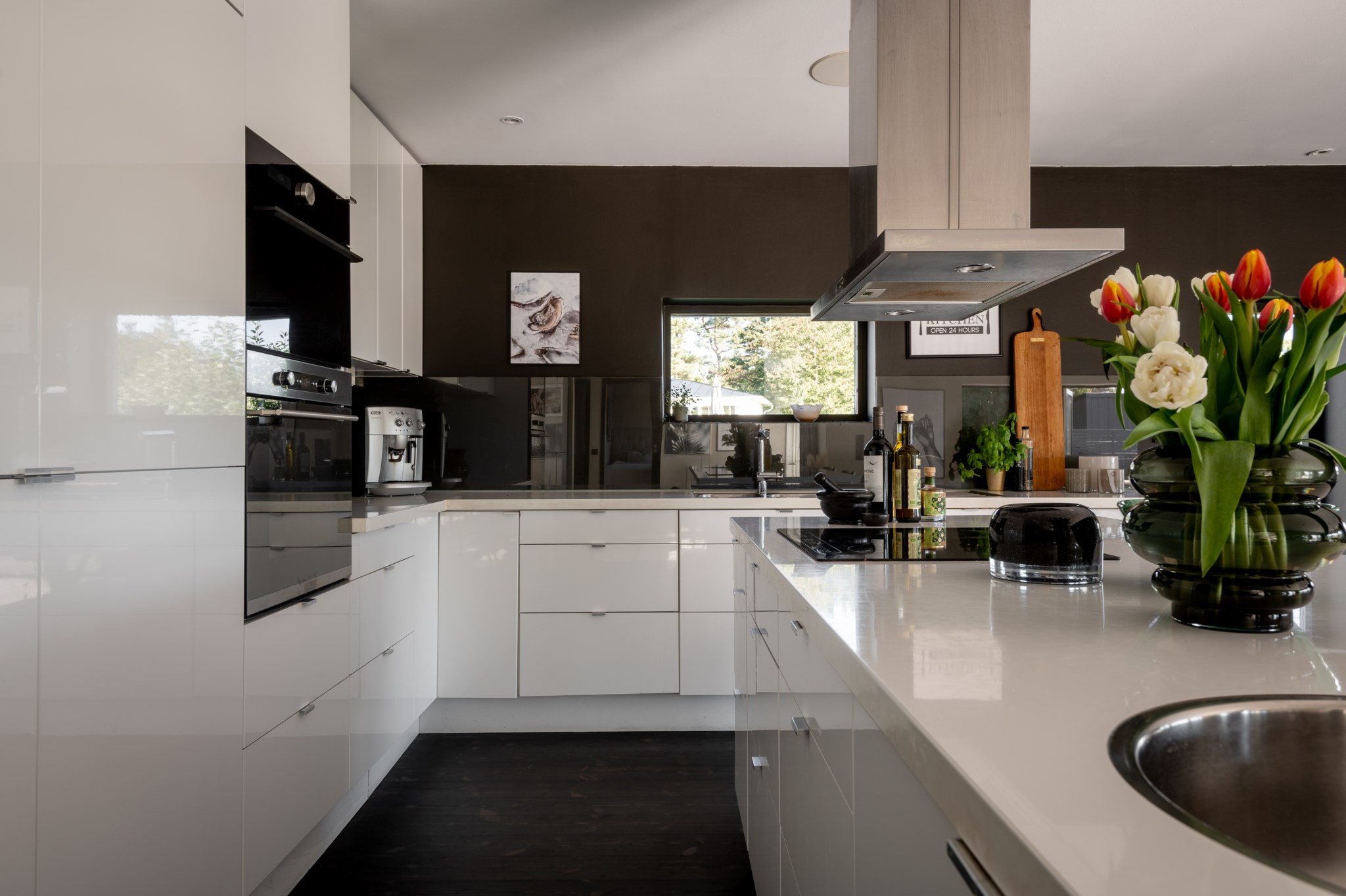 Köket är ljust och modernt med smakfulla materialval och utgång mot altanen.