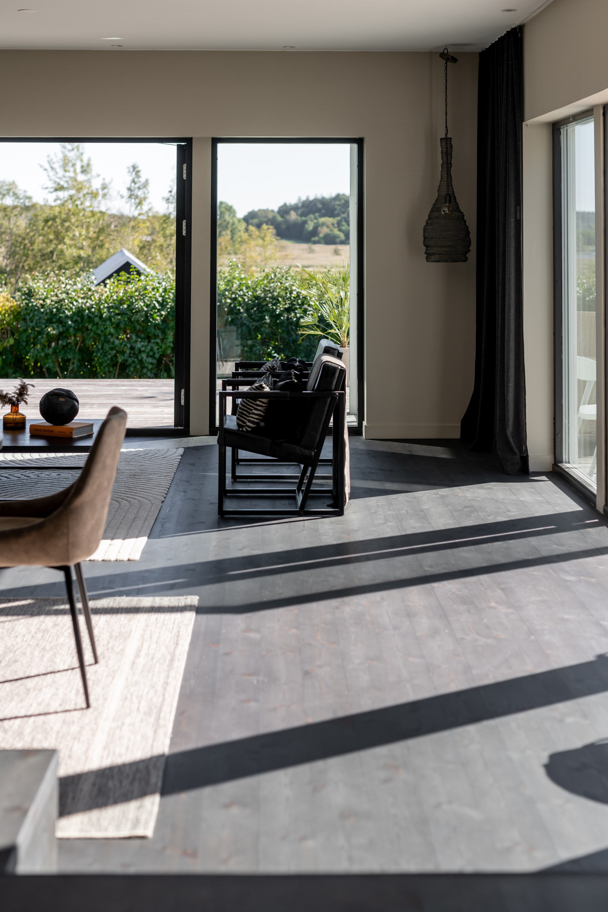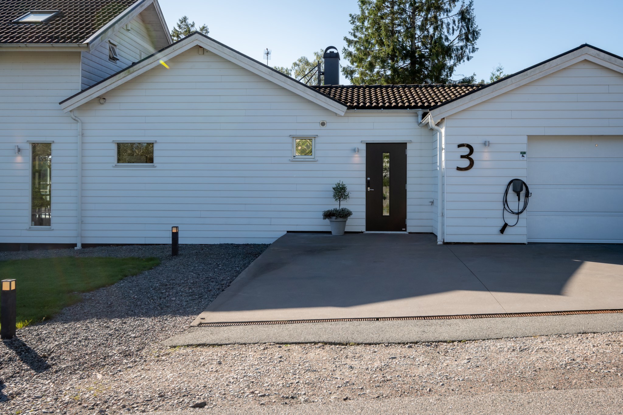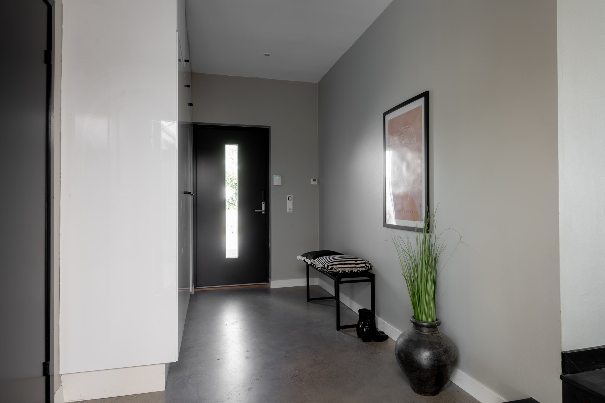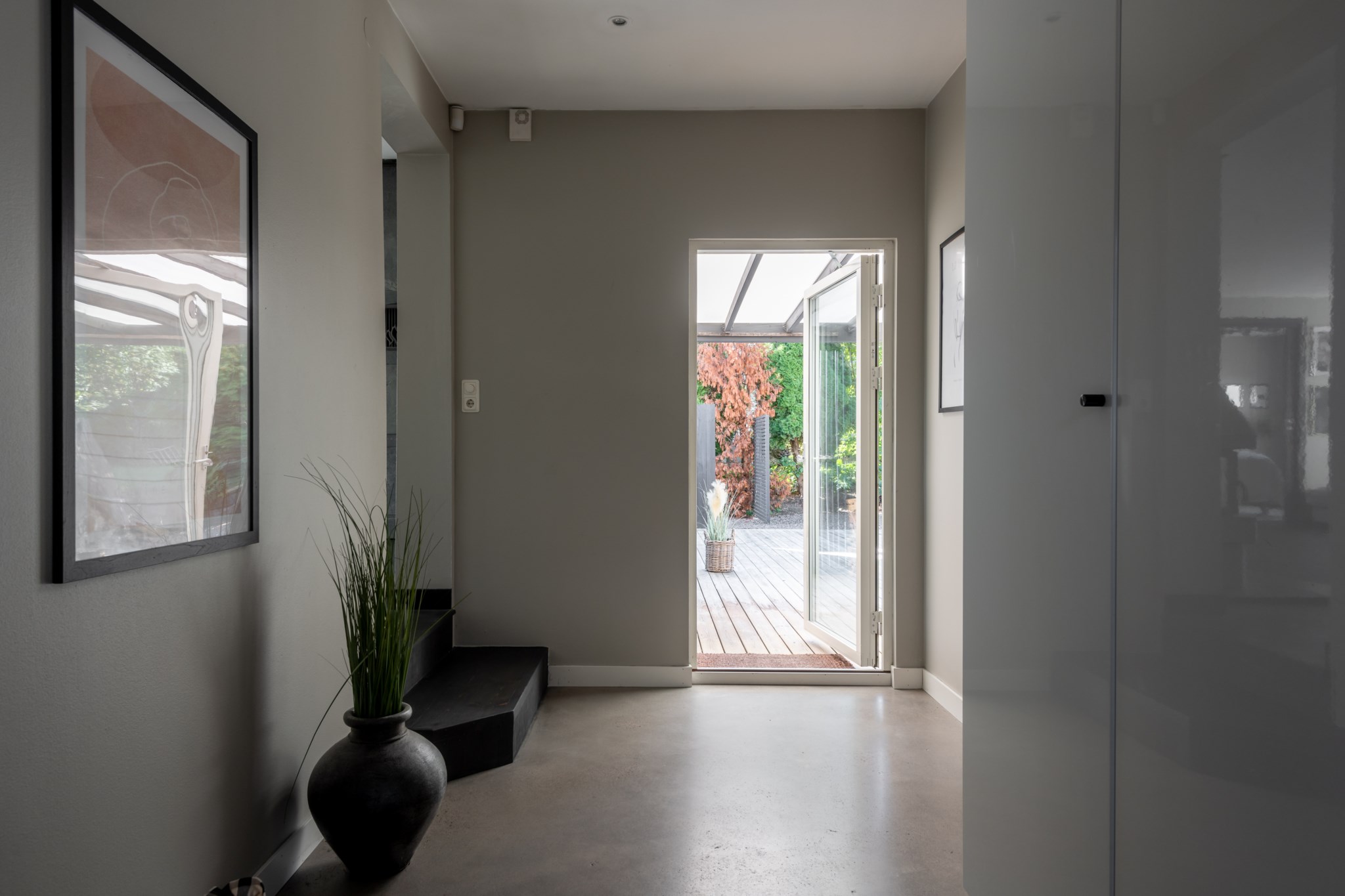 Entrén välkomnar med betonggolv, stilren arkitektur och en liten uteplats/vinterträdgård som förstärker känslan av rymd.