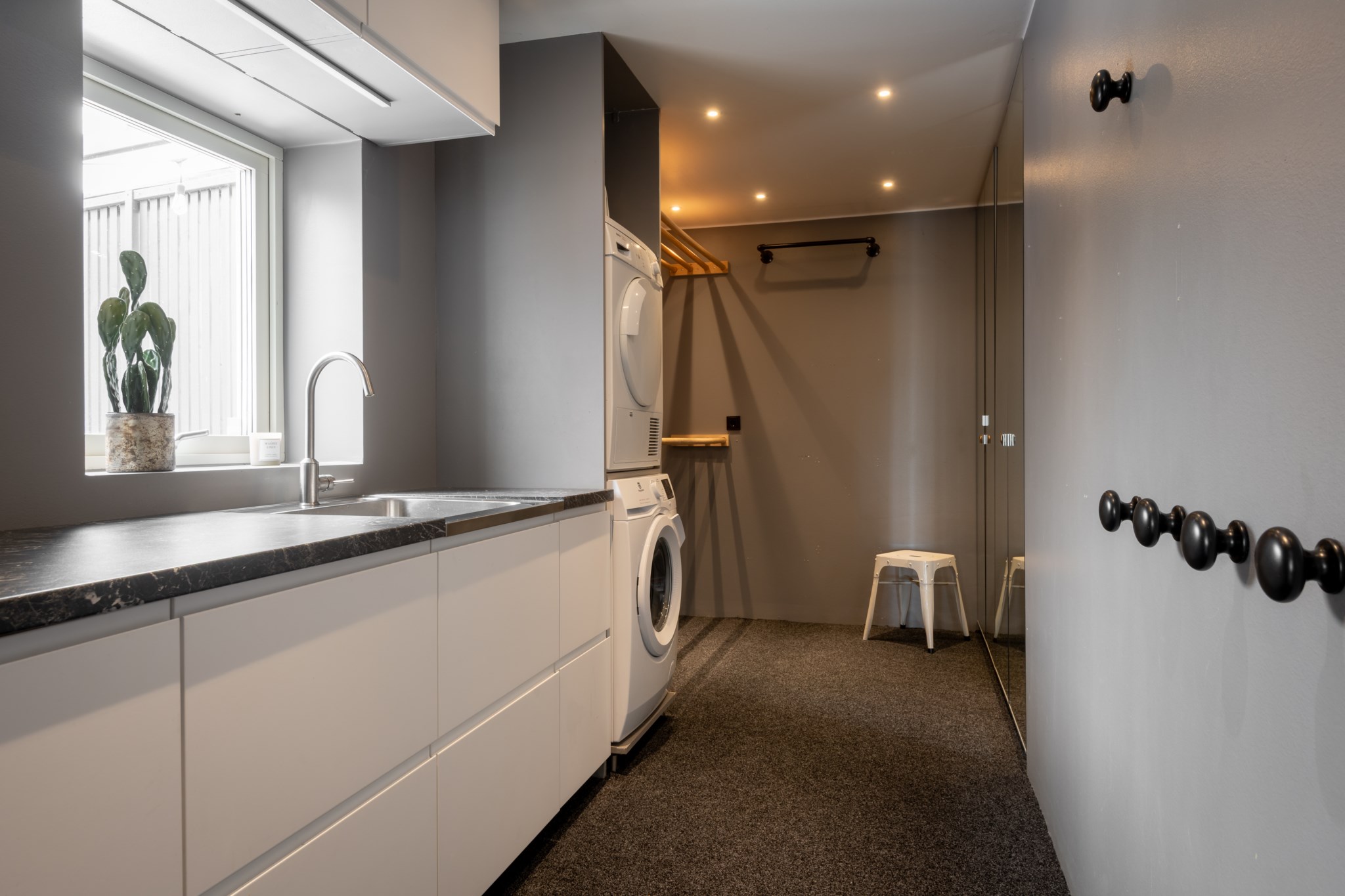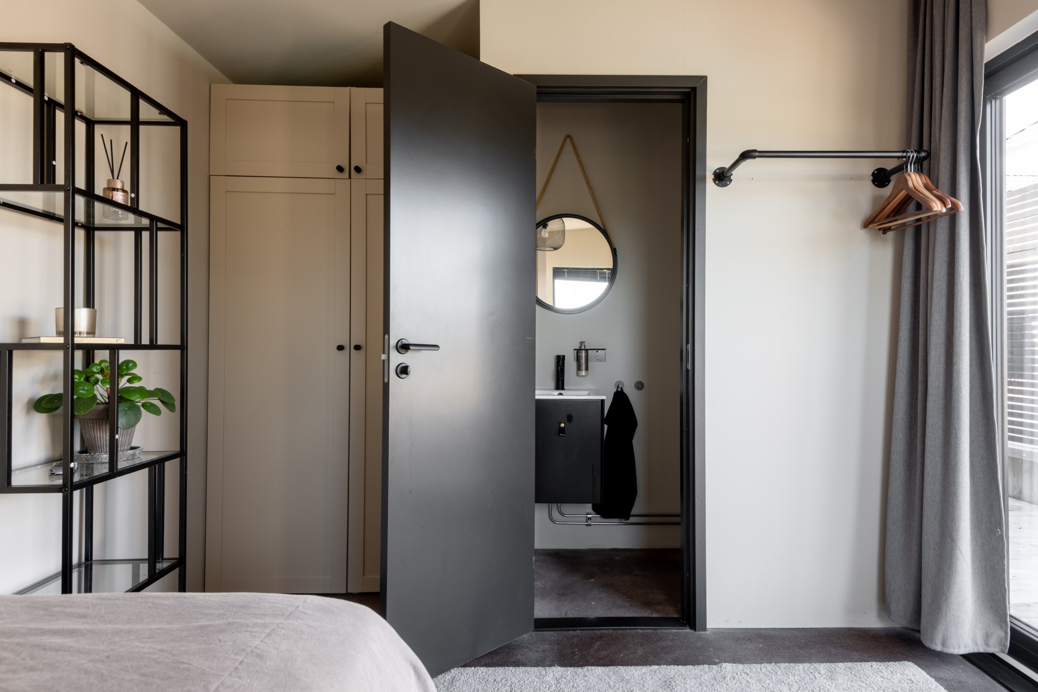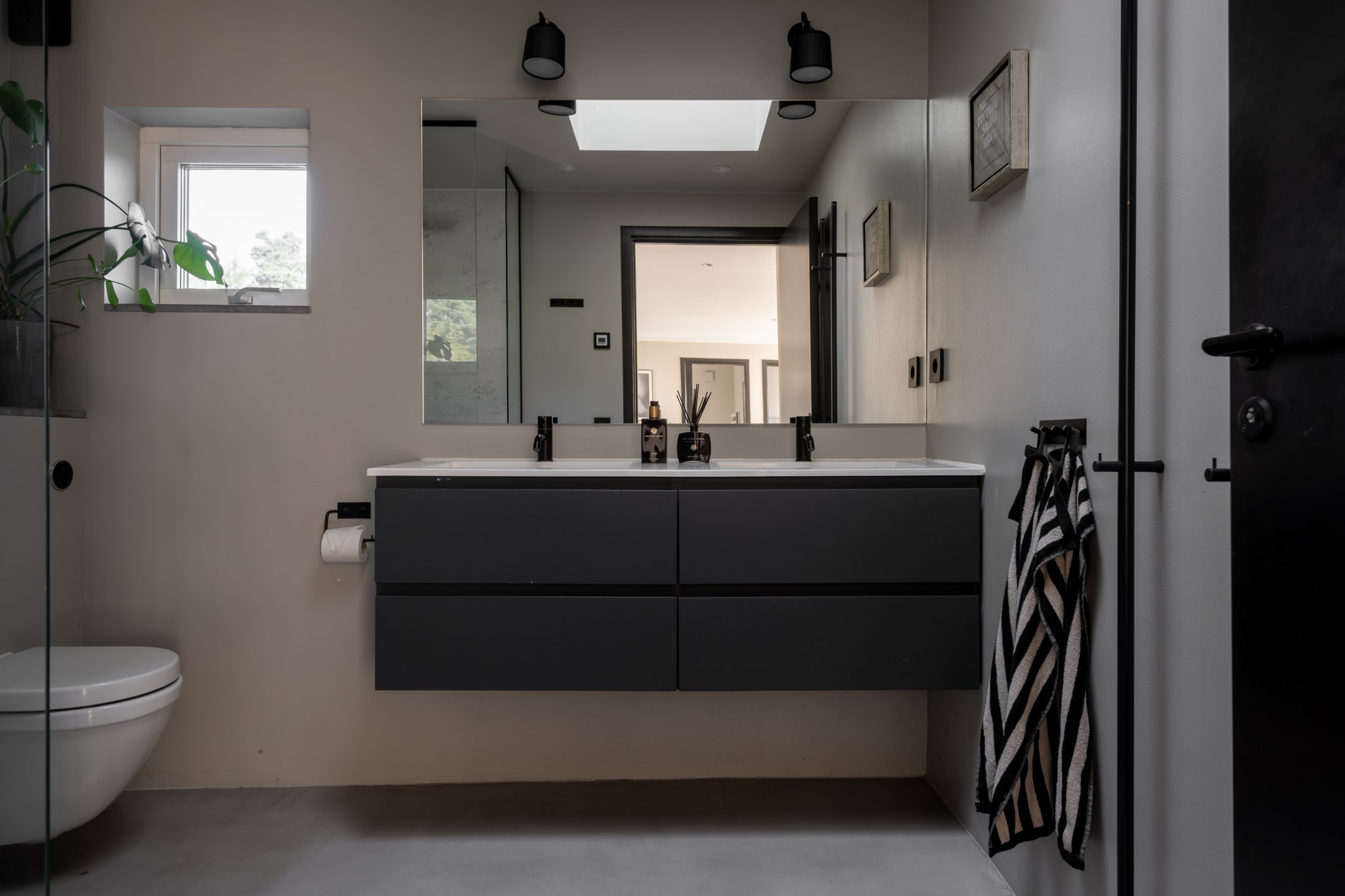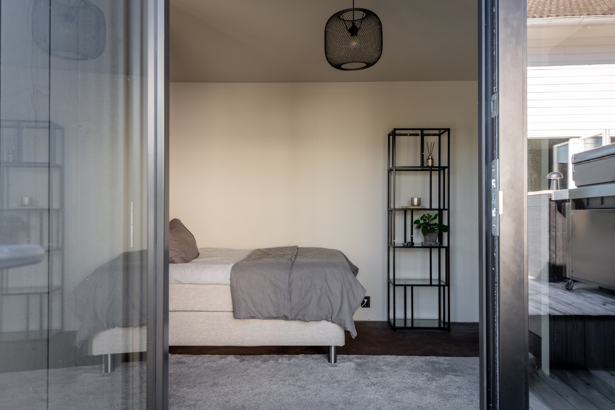 Entrén välkomnar med betonggolv, stilren arkitektur och en liten uteplats/vinterträdgård som förstärker känslan av rymd.