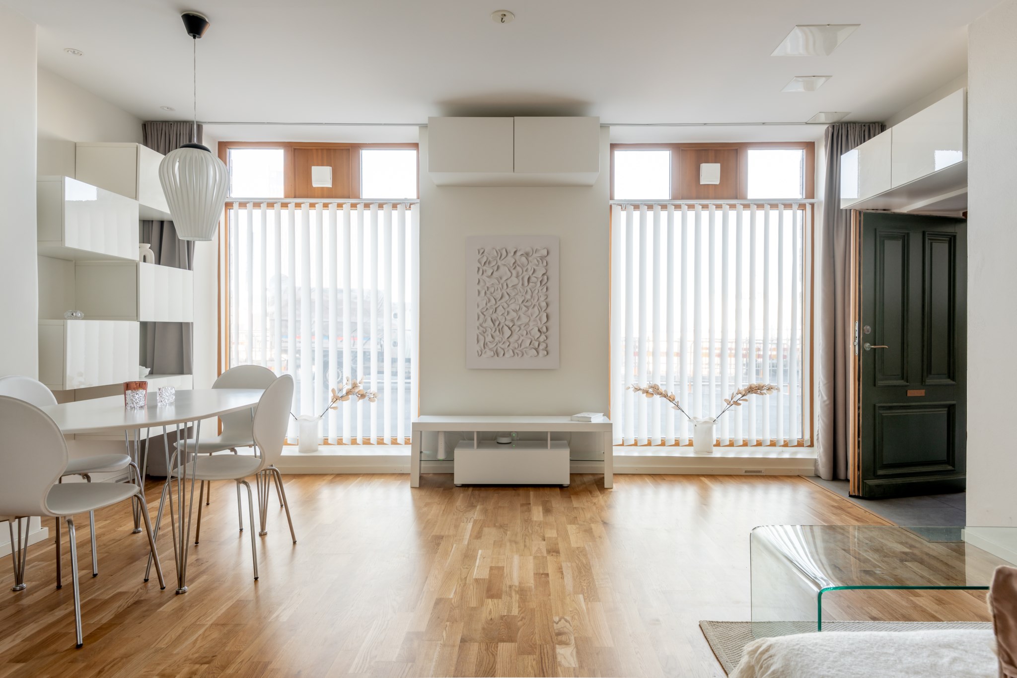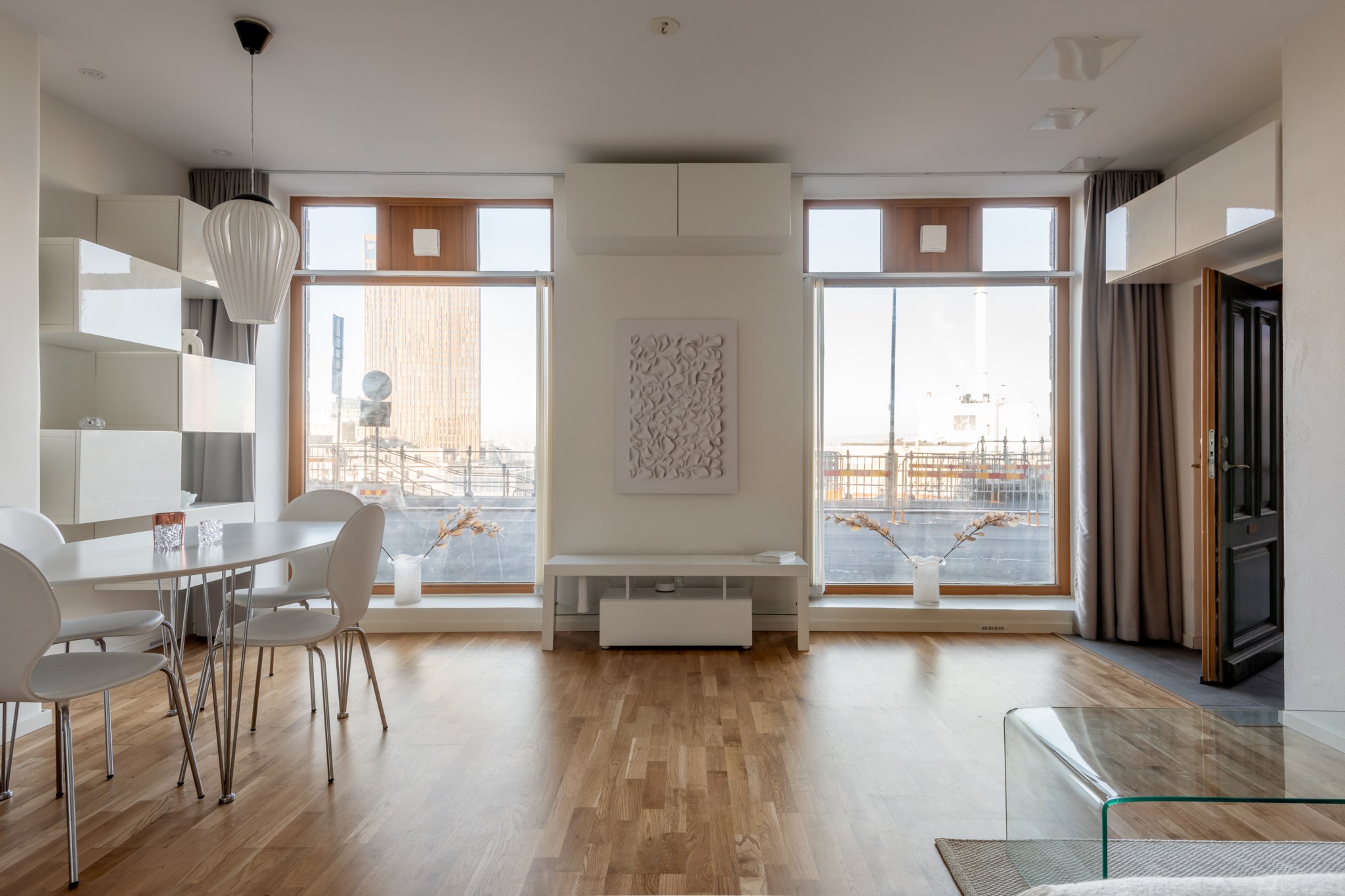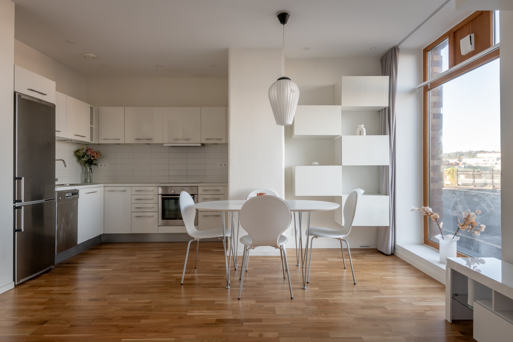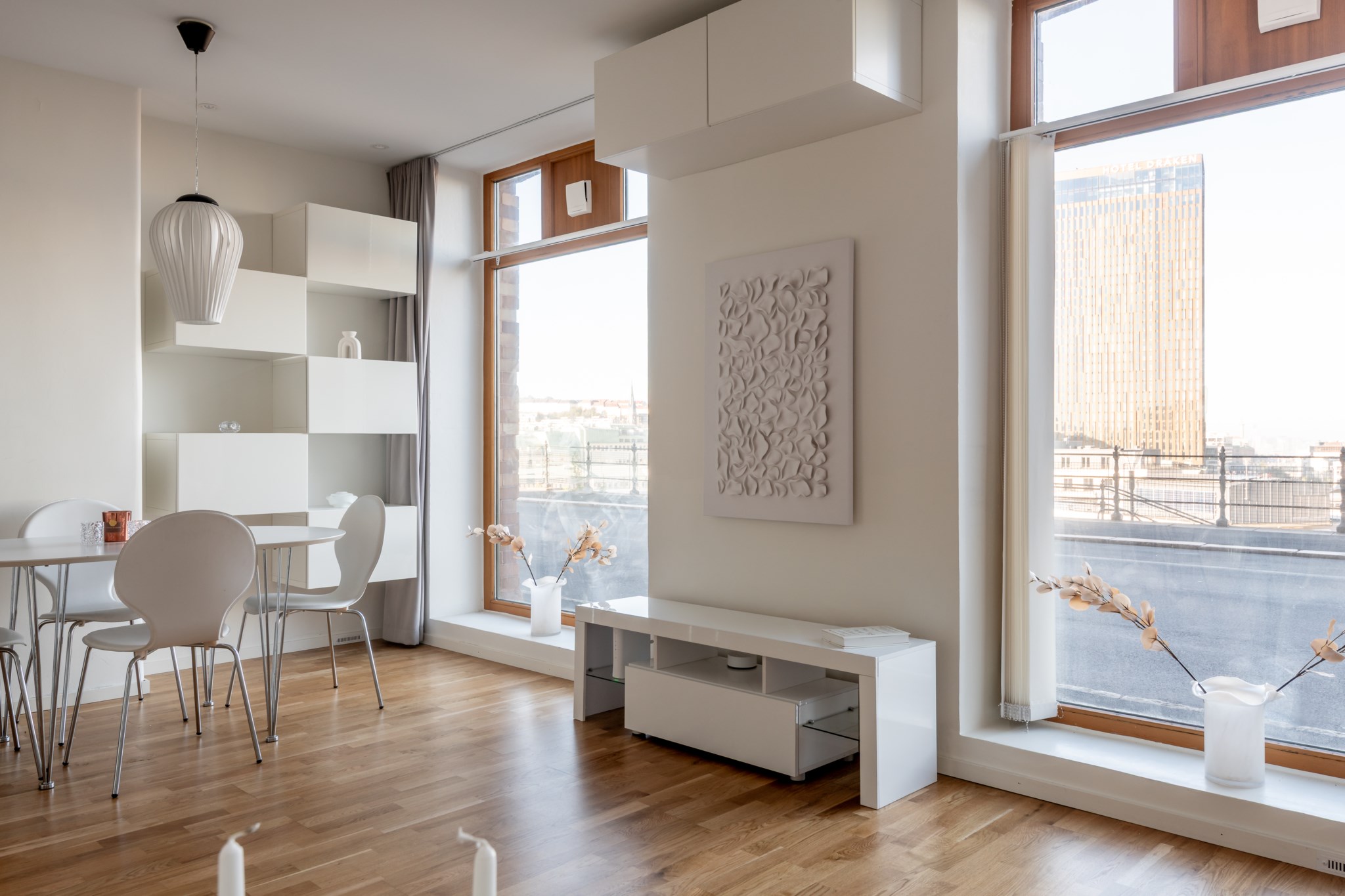 vardagsrummet – hemmets givna samlingspunkt. De stora fönstren sträcker sig nästan från golv till tak och låter ljuset flöda in, medan de ljusa väggarna och parkettgolvet skapar en inbjudande atmosfär. Rummet rymmer både en bekväm soffhörna och ett matbord där vänner