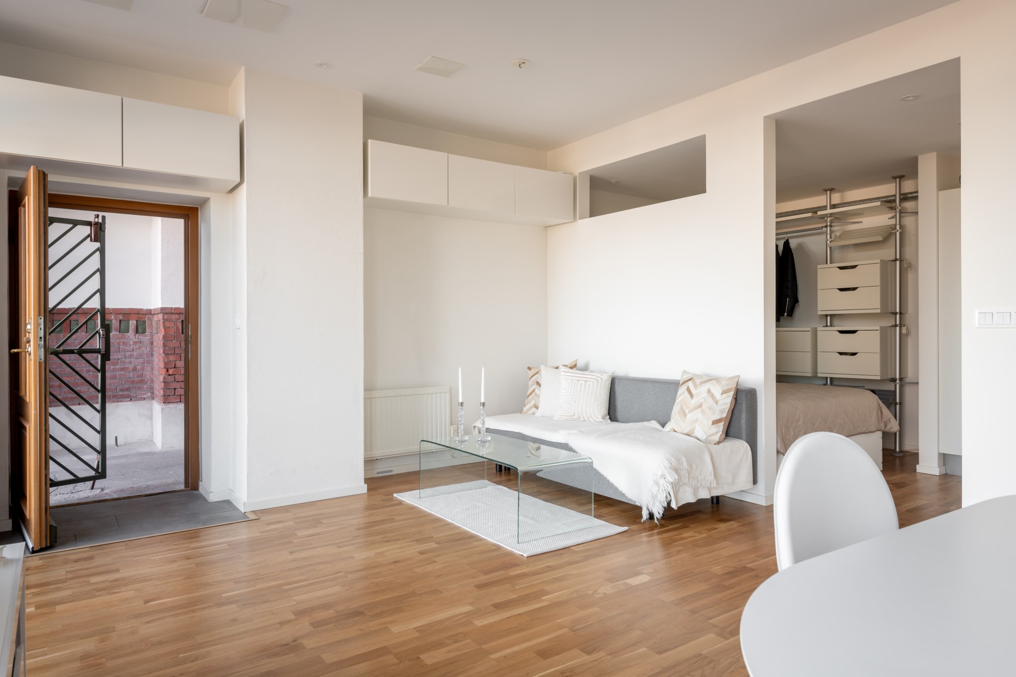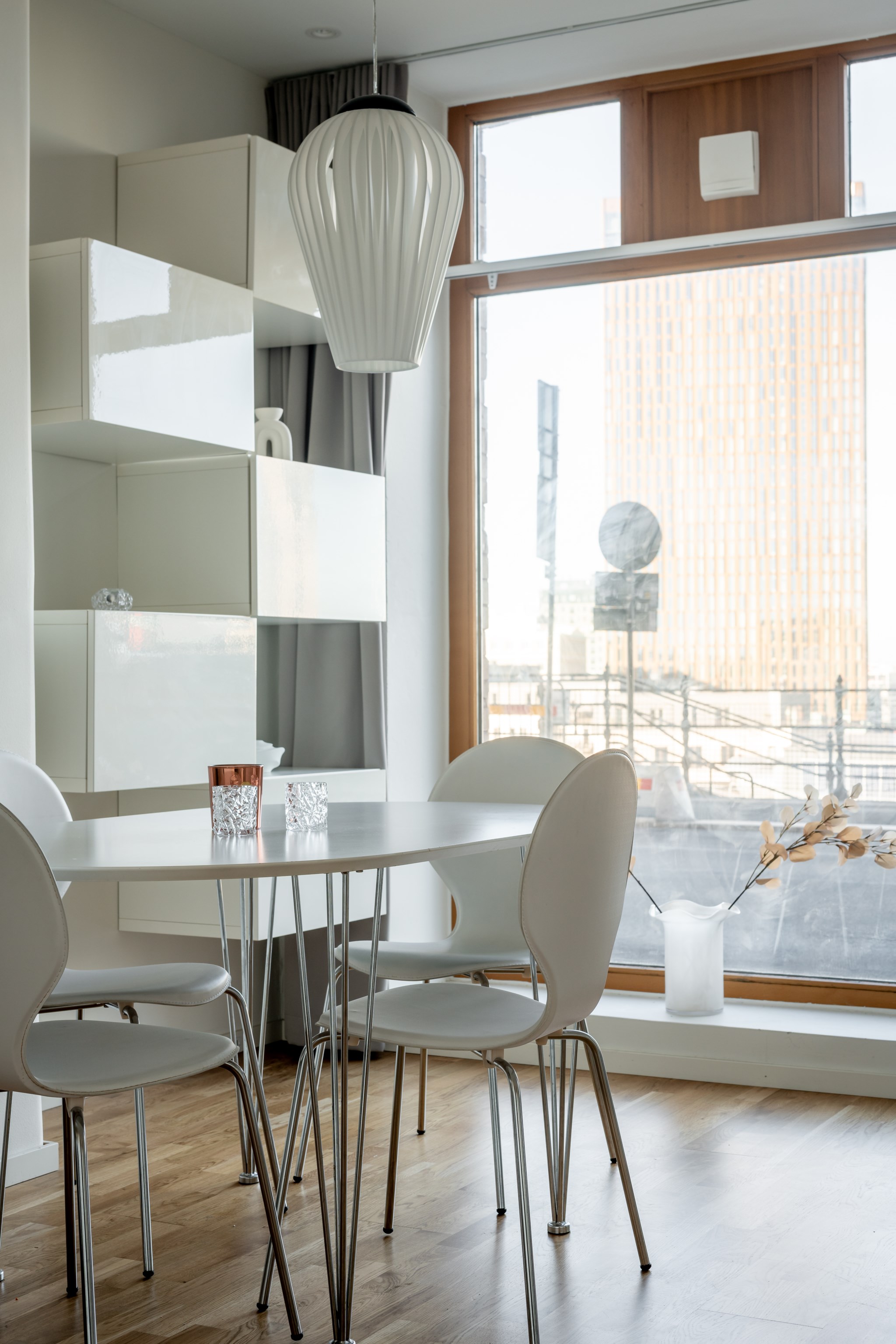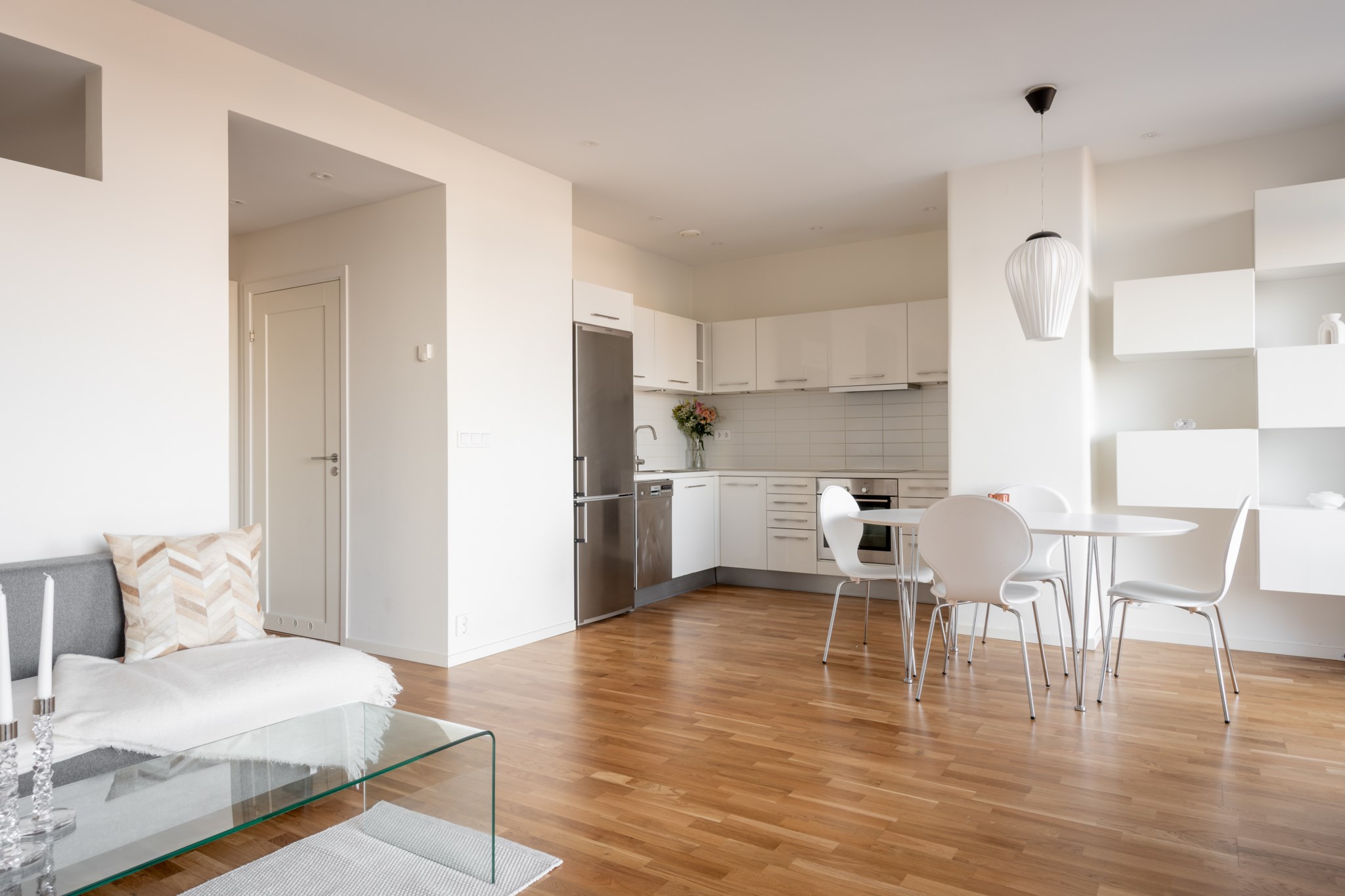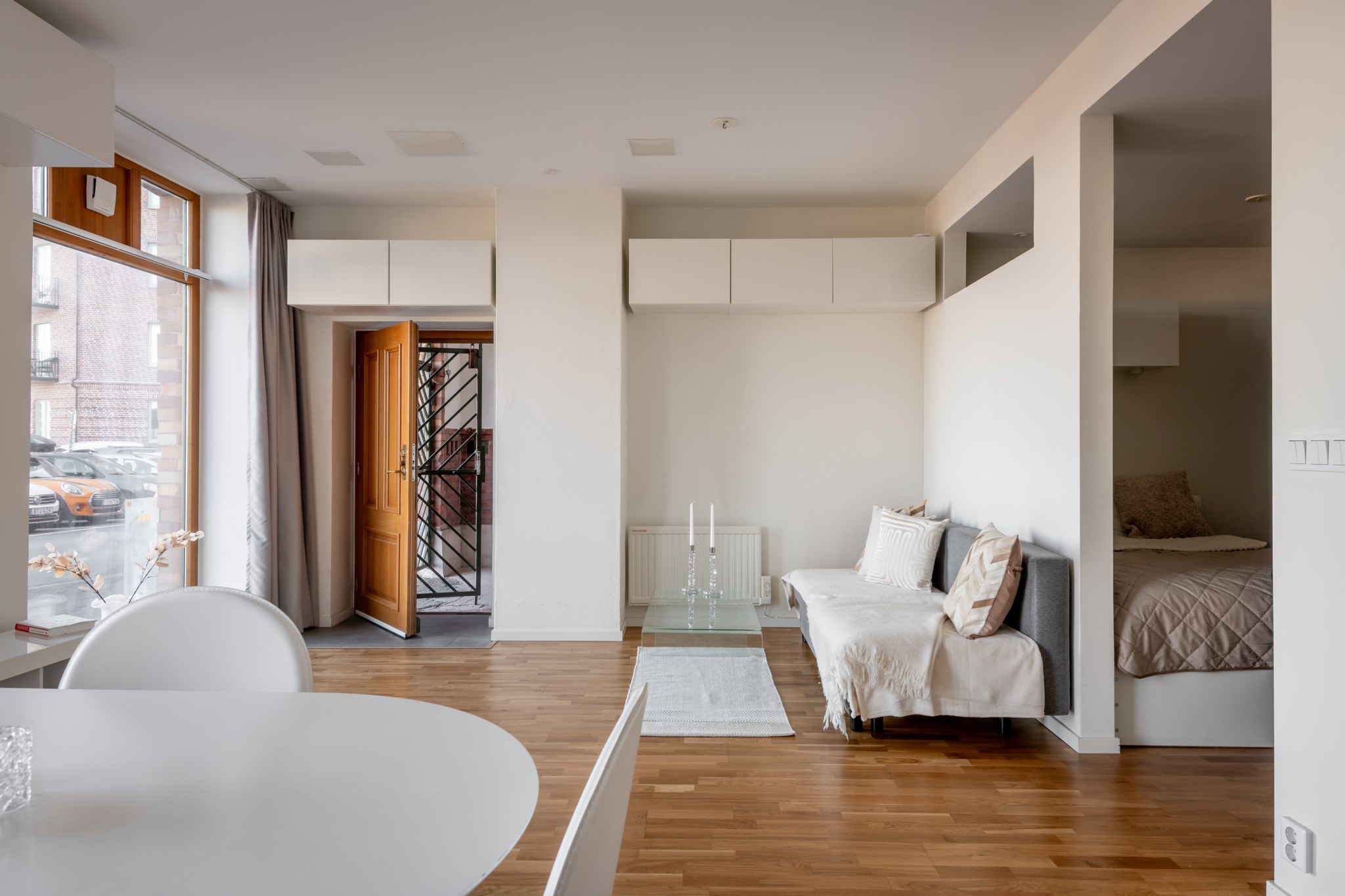 vardagsrummet – hemmets givna samlingspunkt. De stora fönstren sträcker sig nästan från golv till tak och låter ljuset flöda in, medan de ljusa väggarna och parkettgolvet skapar en inbjudande atmosfär. Rummet rymmer både en bekväm soffhörna och ett matbord där vänner