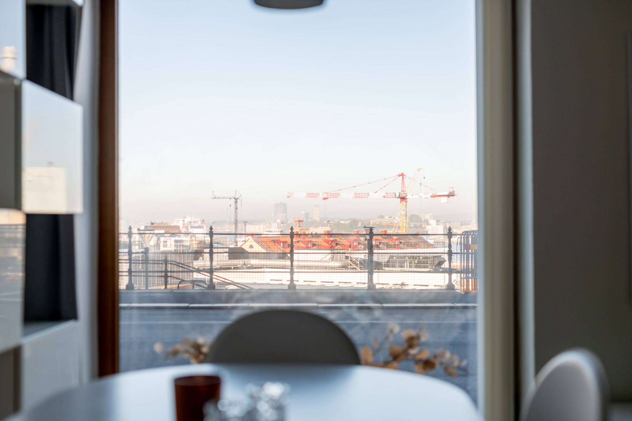 Den öppna planlösningen gör att rummet känns större än sina kvadrat, och de vackra stora fönstren bjuder in himlen och takåsarna över Göteborg. En alldeles underbar frihetskänsla. Här är vardagsrummet en självklar samlingspunkt – en plats för middagar, för samtal som dröjer sig kvar och för stilla kvällar i mjukt ljus.