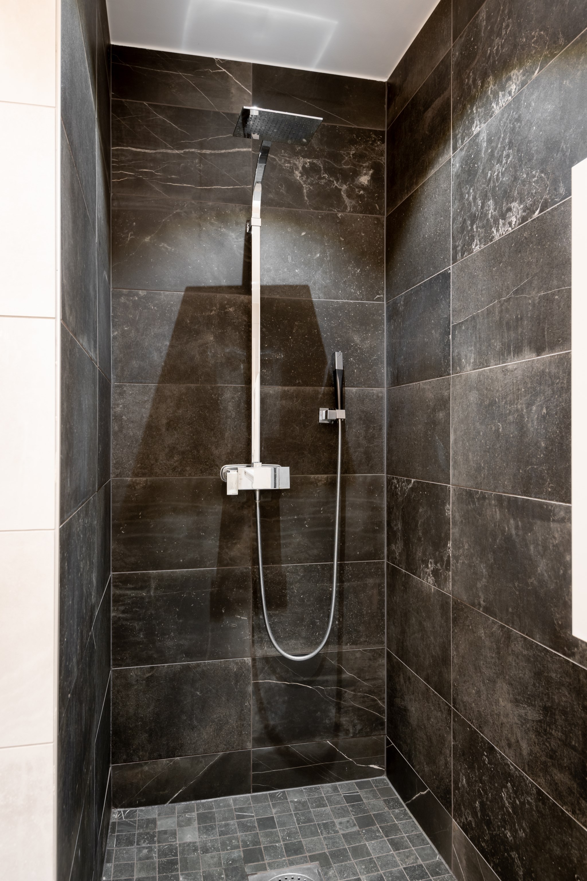 Badrummet är rymligt och helkaklat i sobra grå toner. Här har man inte kompromissat –
