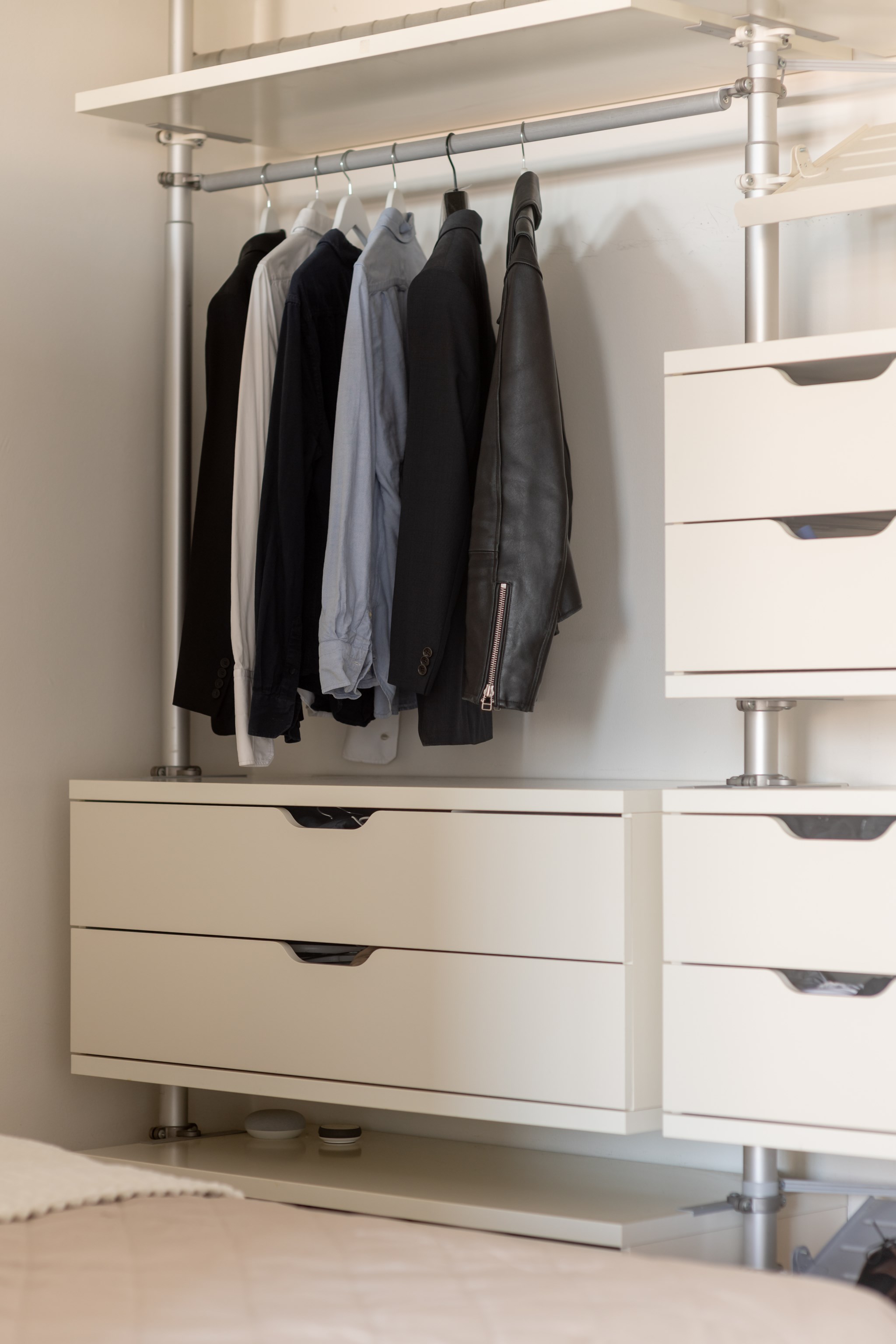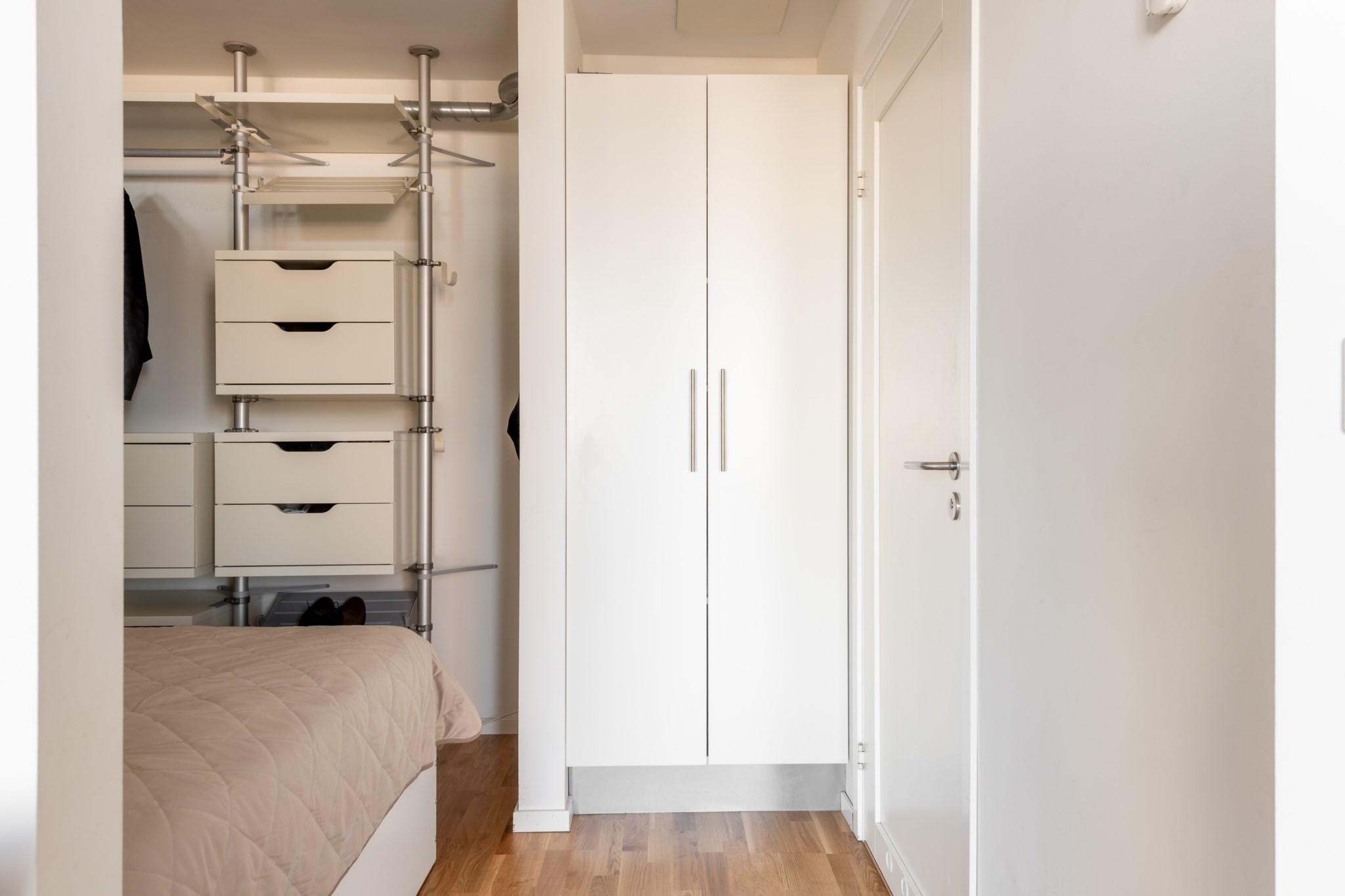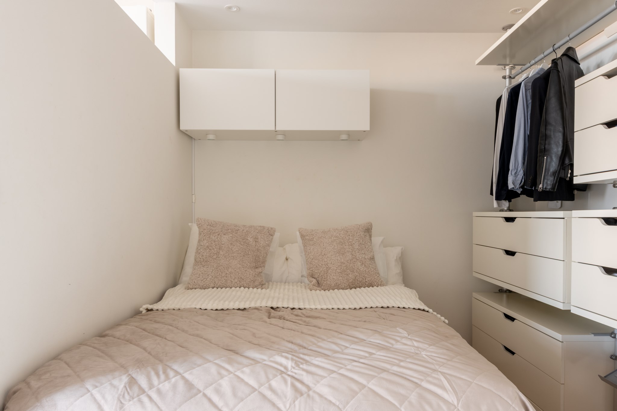 Sovrummet är en privat vrå, rogivande och välplanerat. Här finns förvaring både i garderober och i öppen lösning, och platsen lämpar sig lika väl för lugna kvällar som för tidiga morgnar i en stilla start.