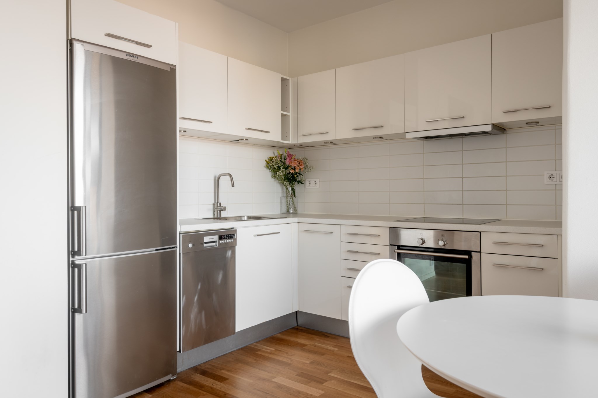 umgänget. Inredningen i vitt, med kakel ovan arbetsytorna, är både stilren och tidlös. Här finns allt du behöver – spishäll, ugn, kyl/frys och diskmaskin – och ytorna är smart disponerade för att göra matlagningen både enkel och inspirerande.