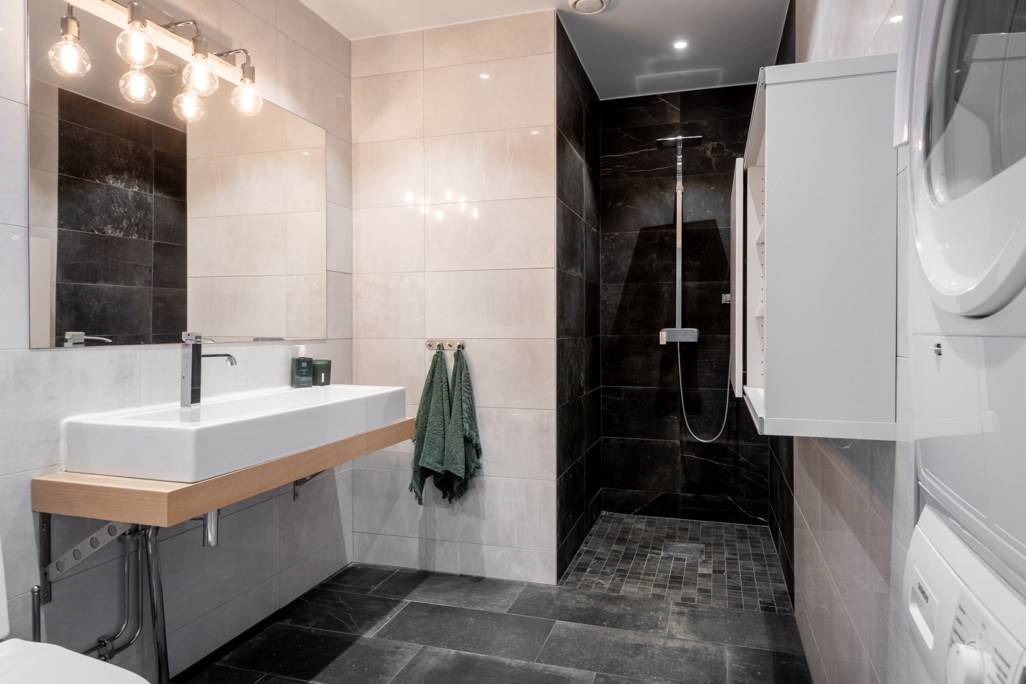 förutom dusch med glasväggar finns både tvättmaskin och torktumlare, vilket gör vardagen betydligt smidigare. Golvvärme och infällda spotlights ger en exklusiv känsla, medan den genomgående stilen gör att badrummet upplevs harmoniskt och lyxigt på samma gång.