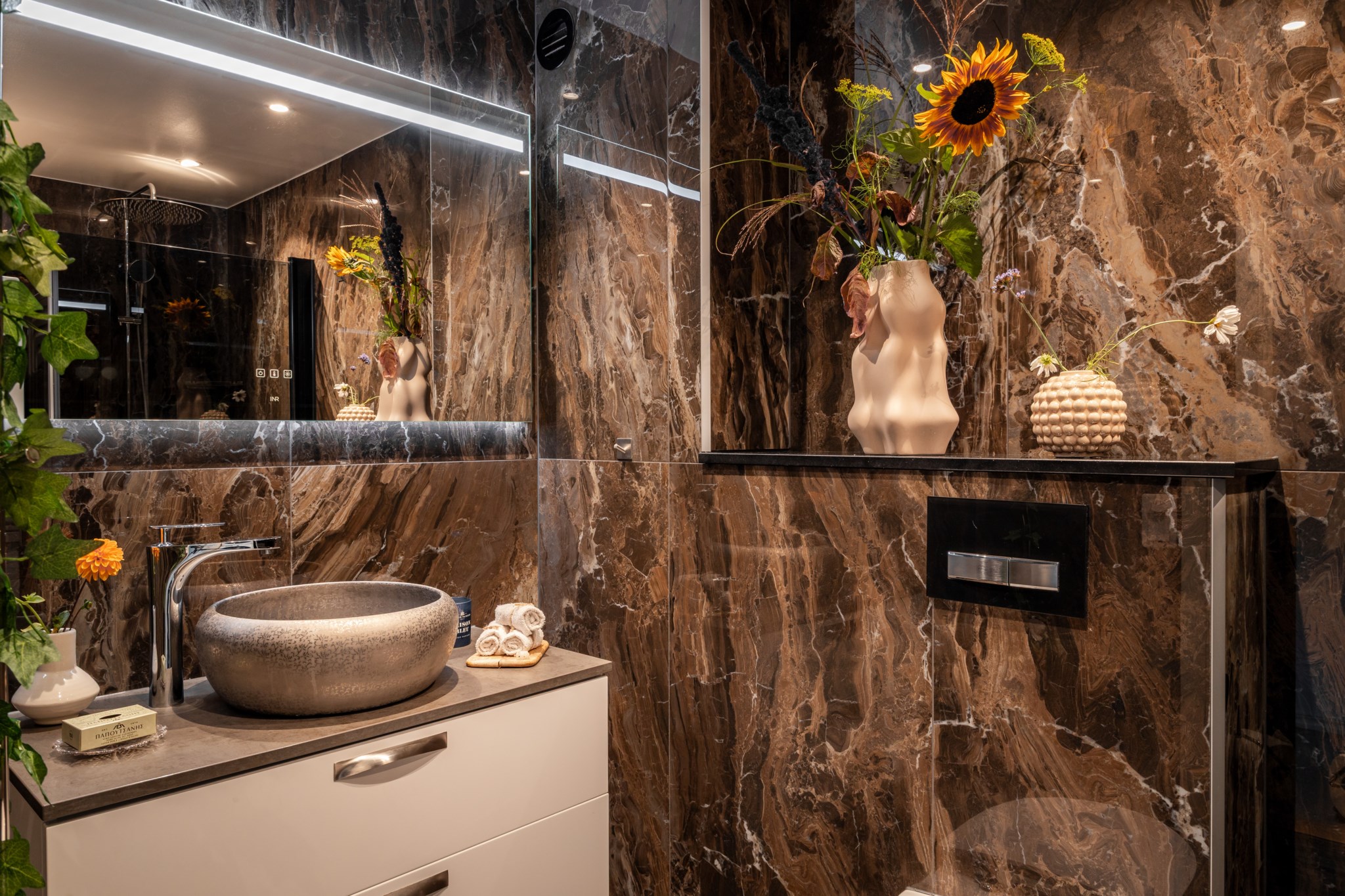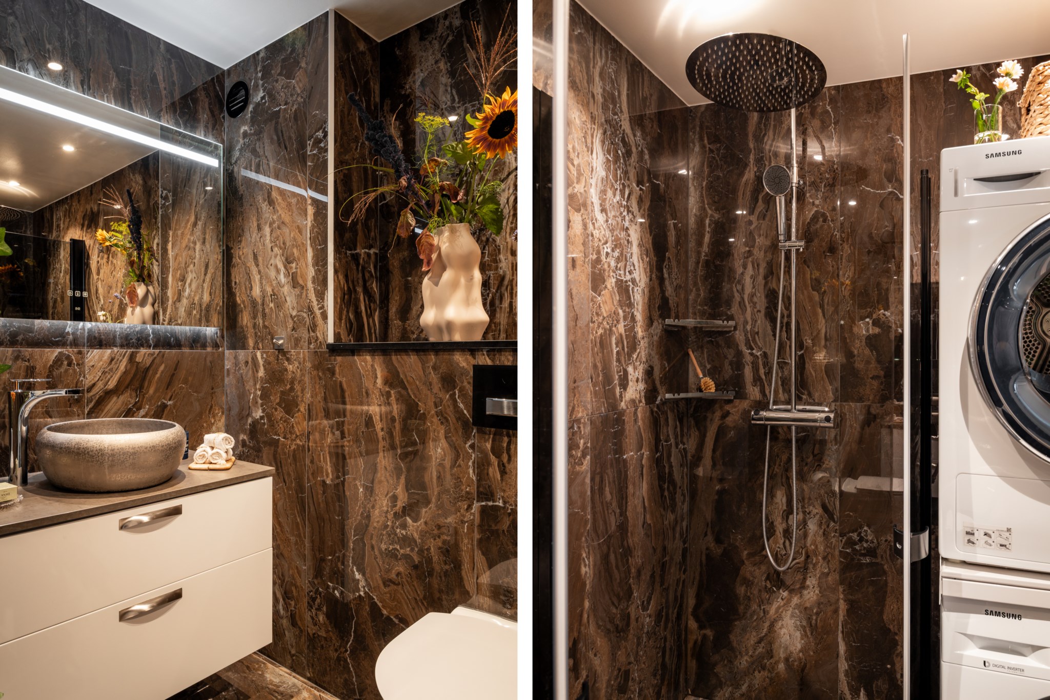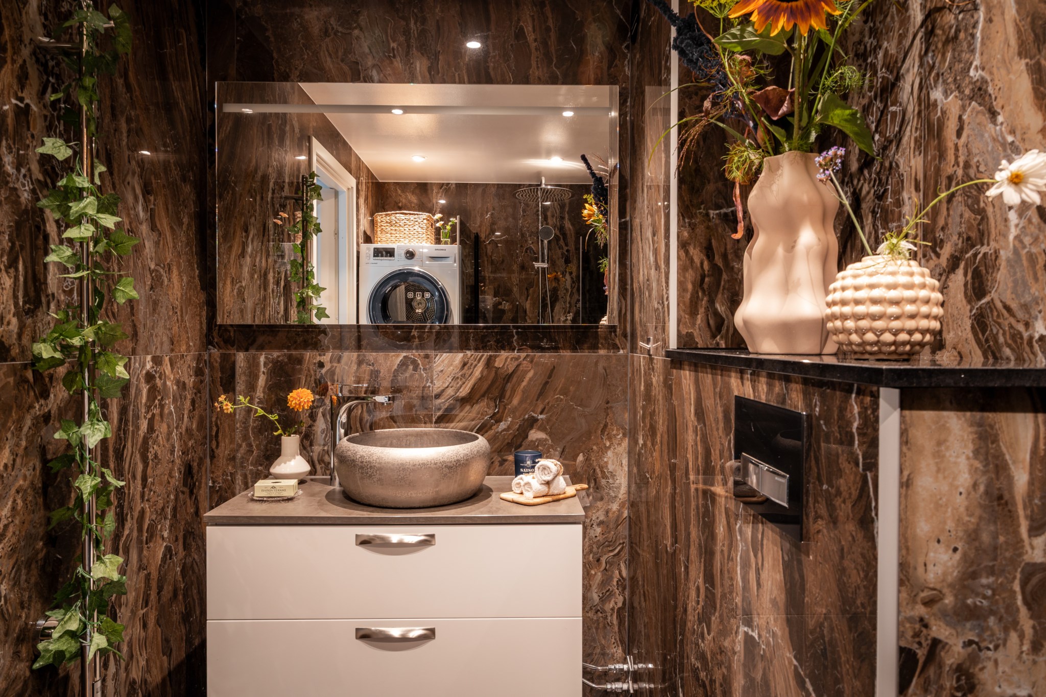 Badrummet är påkostat och helkaklat i jordnära, brunaktiga nyanser som skapar en lugn och harmonisk känsla. Förutom dusch med glasväggar, vägghängd WC samt stilrent tvättställ finns här även tvättpelare med tvättmaskin och torktumlare – allt för att förenkla din vardag.