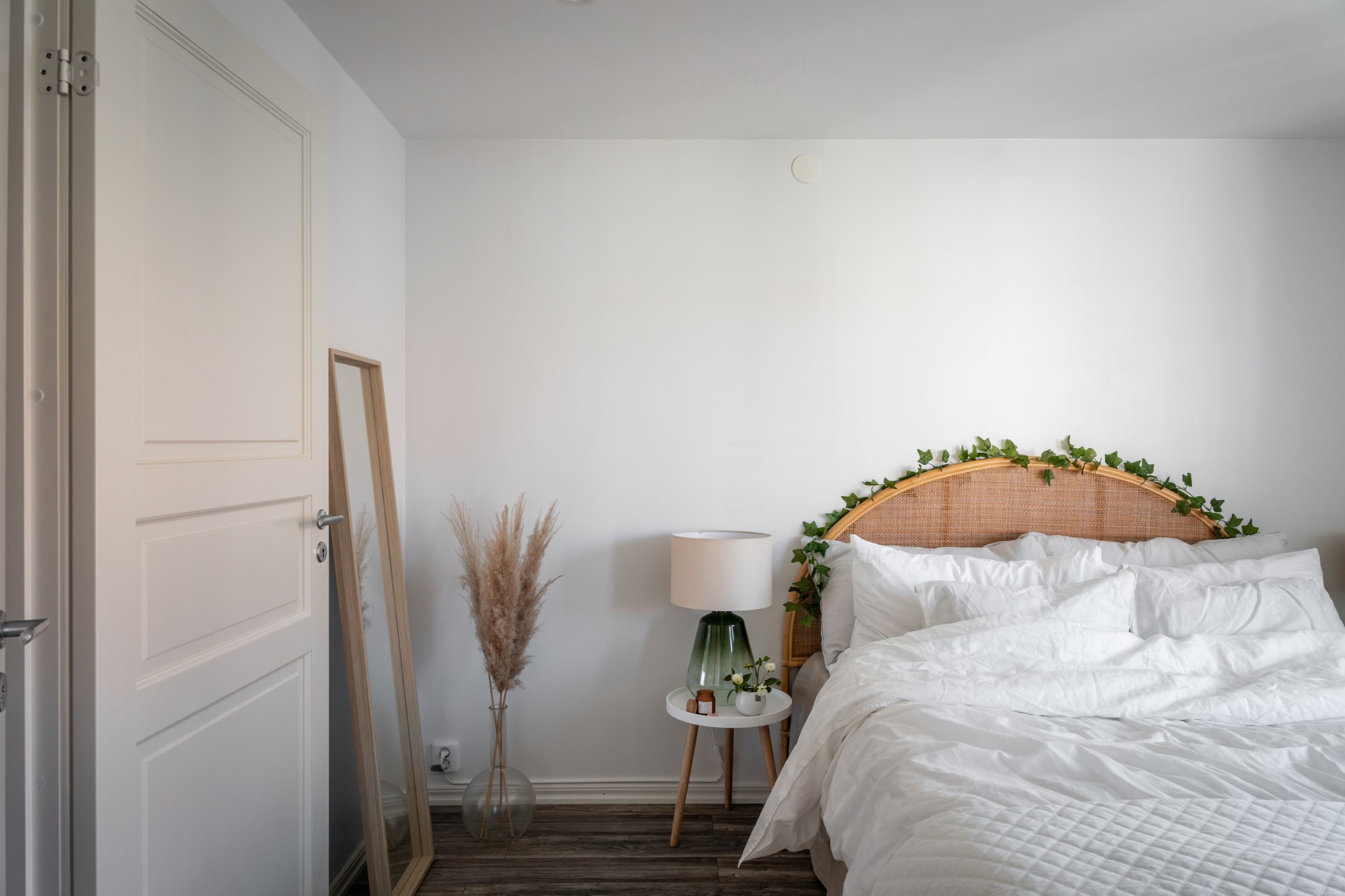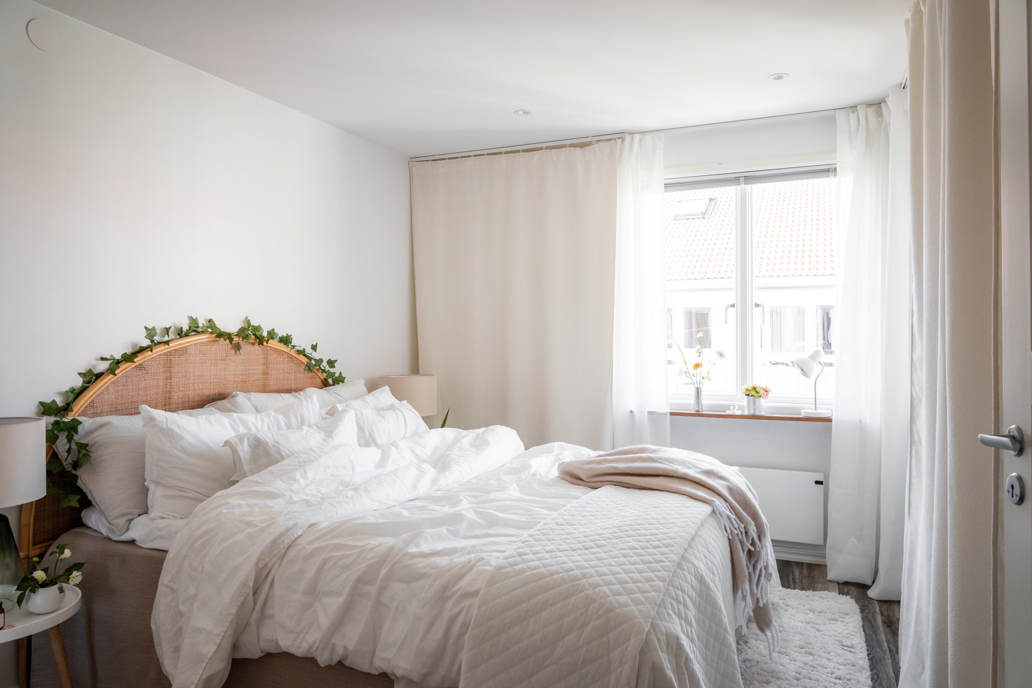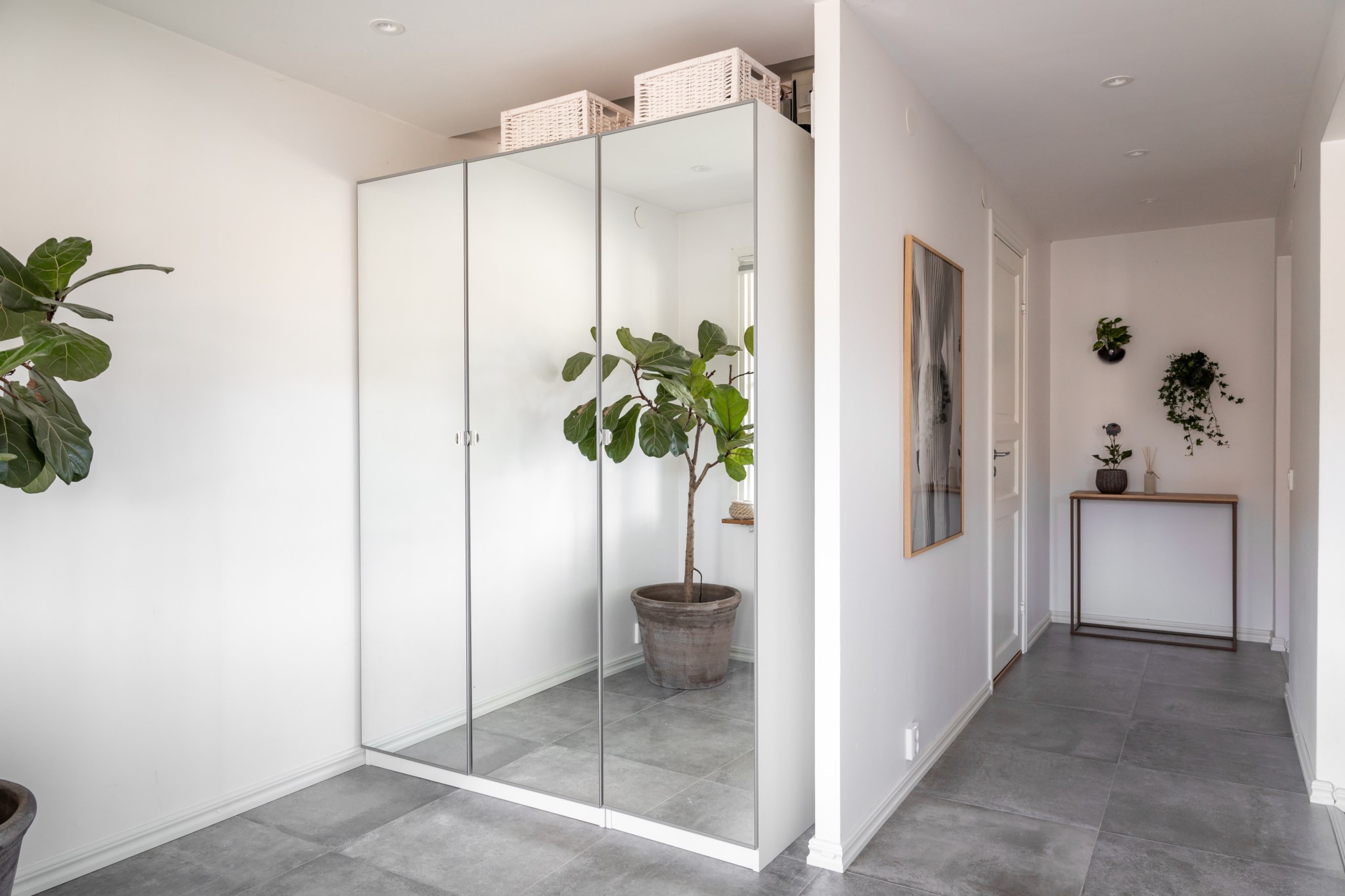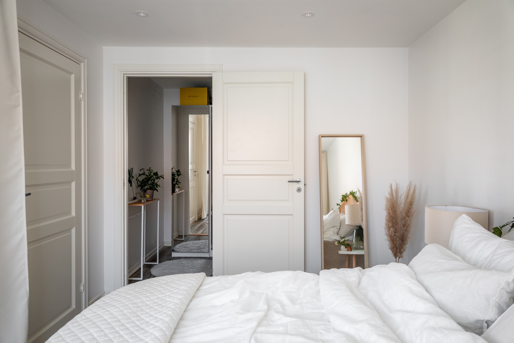 Sovrummet är tyst och privat – en perfekt plats för återhämtning. Här finns en generös walk-in closet med plats för både kläder, skor och extra förvaring. Ett sällsynt lyxigt inslag i en tvåa!