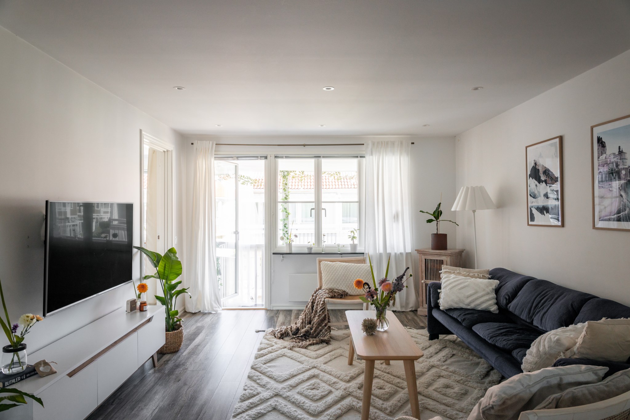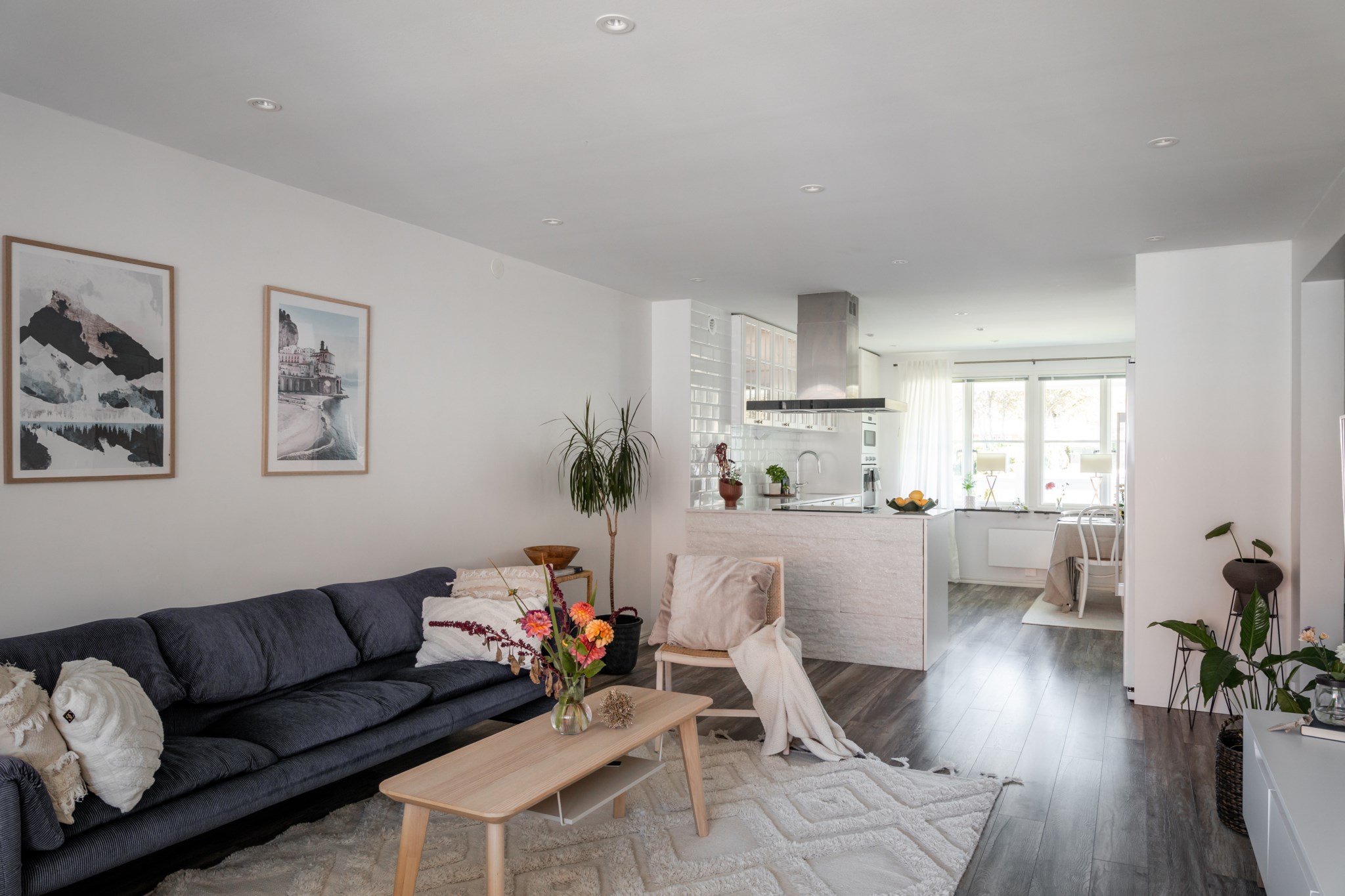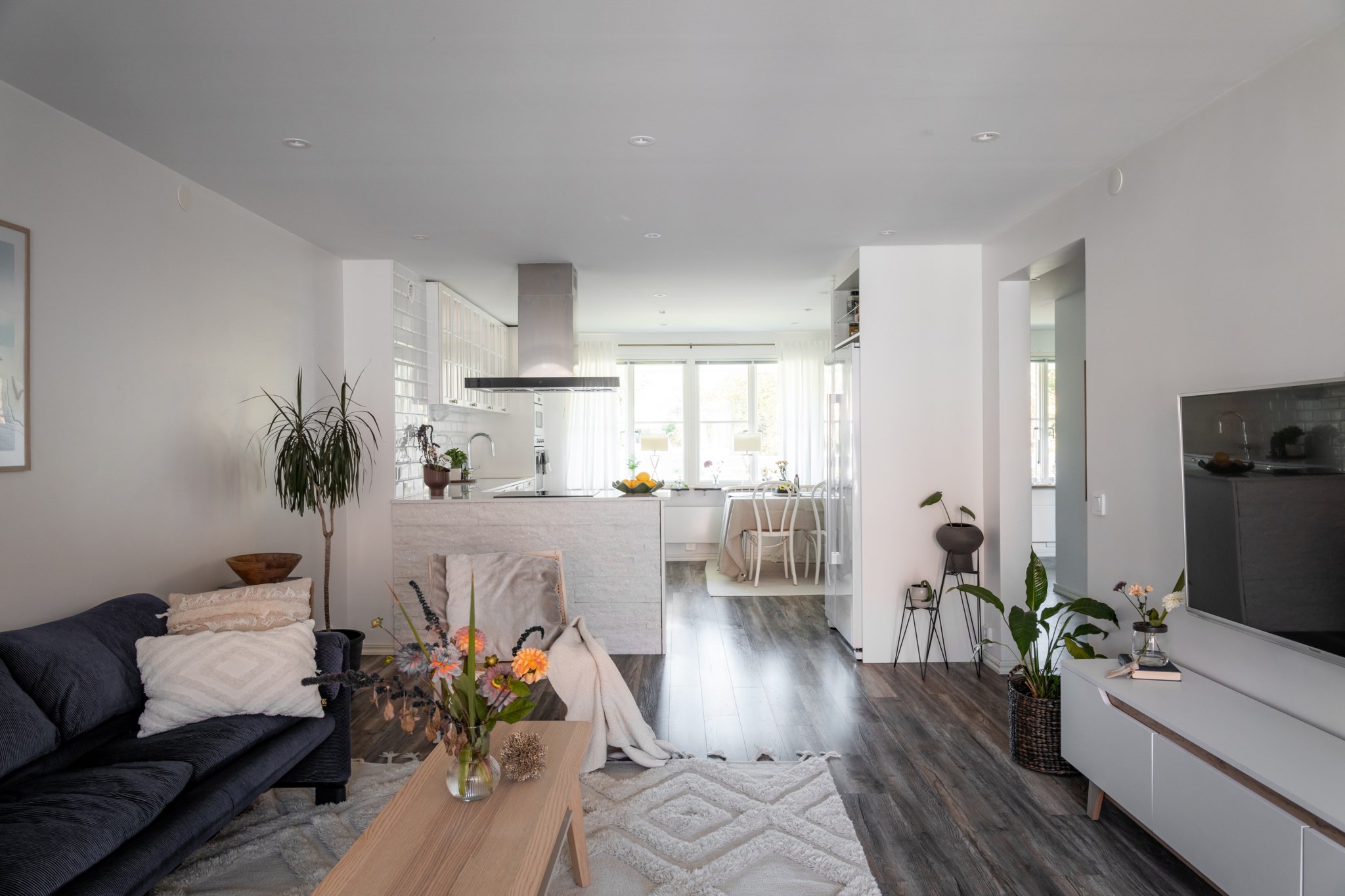 Den öppna planlösningen mellan kök och vardagsrum skapar en inbjudande och social yta. Stora fönster och en västvänd balkong bjuder på generöst ljusinsläpp under större delen av dagen – och här kan du njuta av eftermiddagssolen.