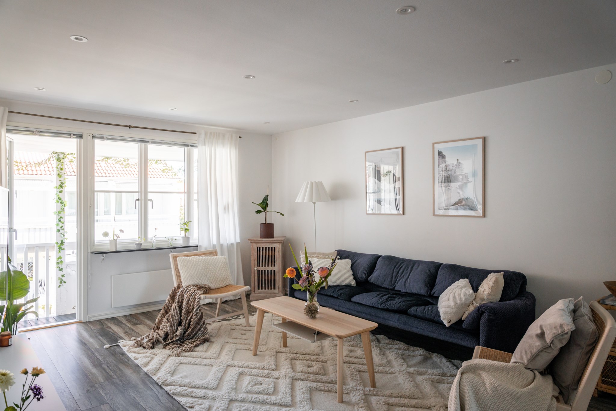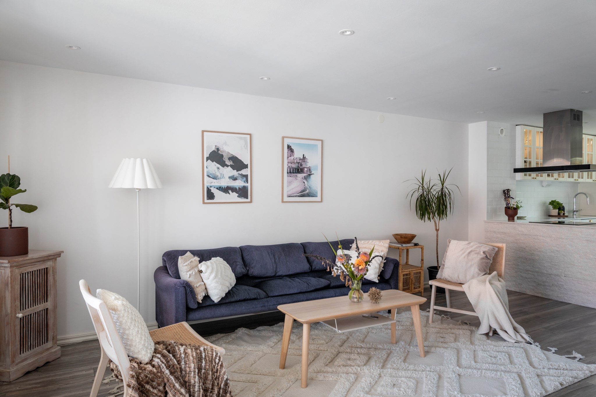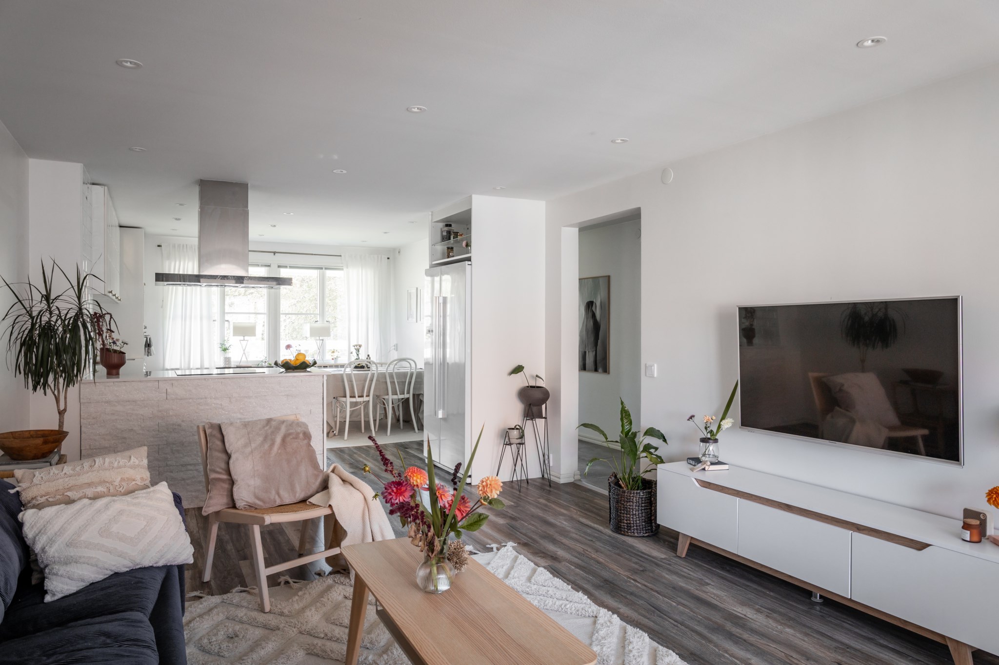 Den öppna planlösningen mellan kök och vardagsrum skapar en inbjudande och social yta. Stora fönster och en västvänd balkong bjuder på generöst ljusinsläpp under större delen av dagen – och här kan du njuta av eftermiddagssolen.