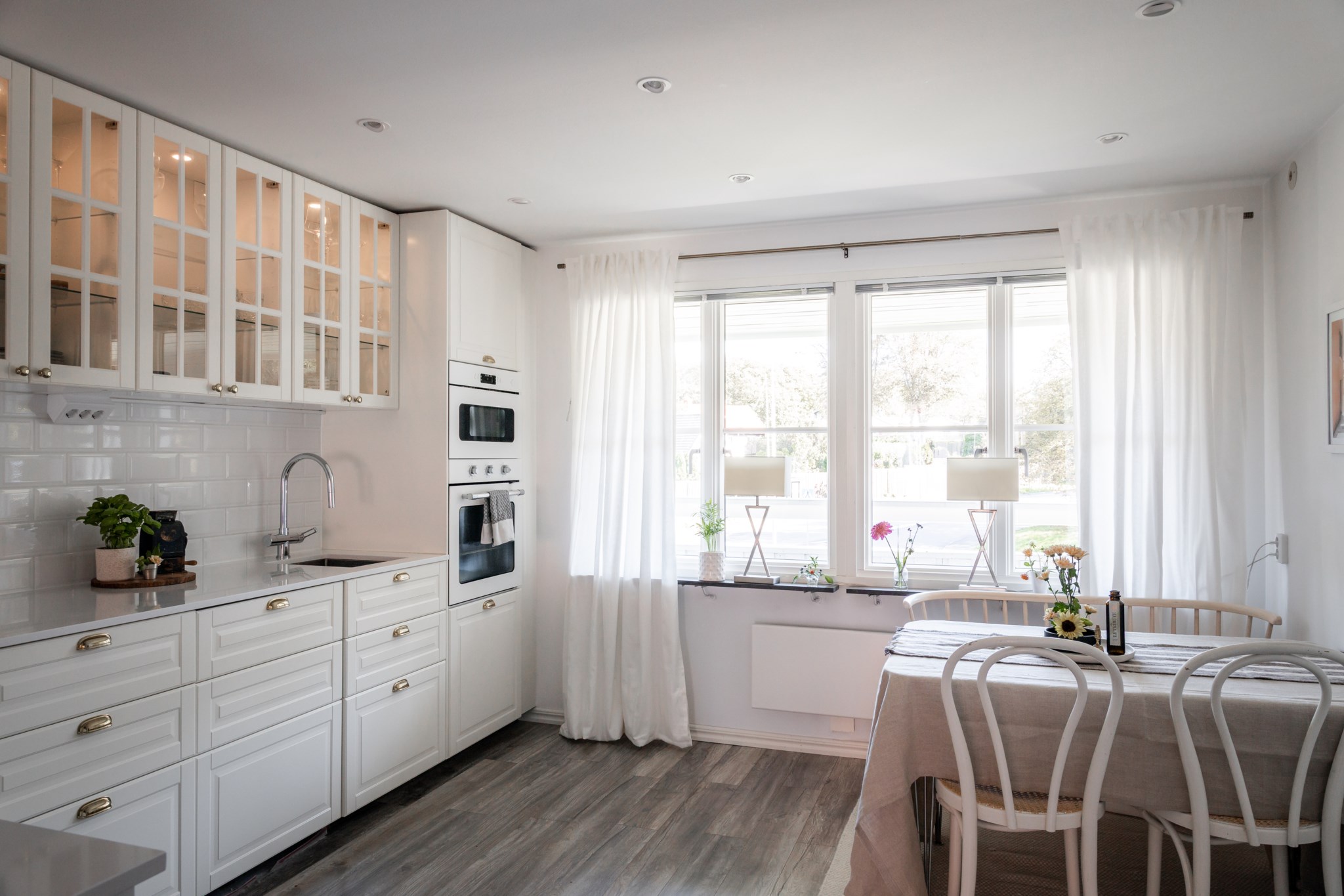 Köket är helrenoverat i klassisk vit design med smakfullt vitt kakel ovan arbetsytorna. Här finns allt du behöver i form av spishäll, ugn, kyl, frys och diskmaskin – smart planerat för att underlätta både vardagsmatlagning och helgmiddag med vänner.