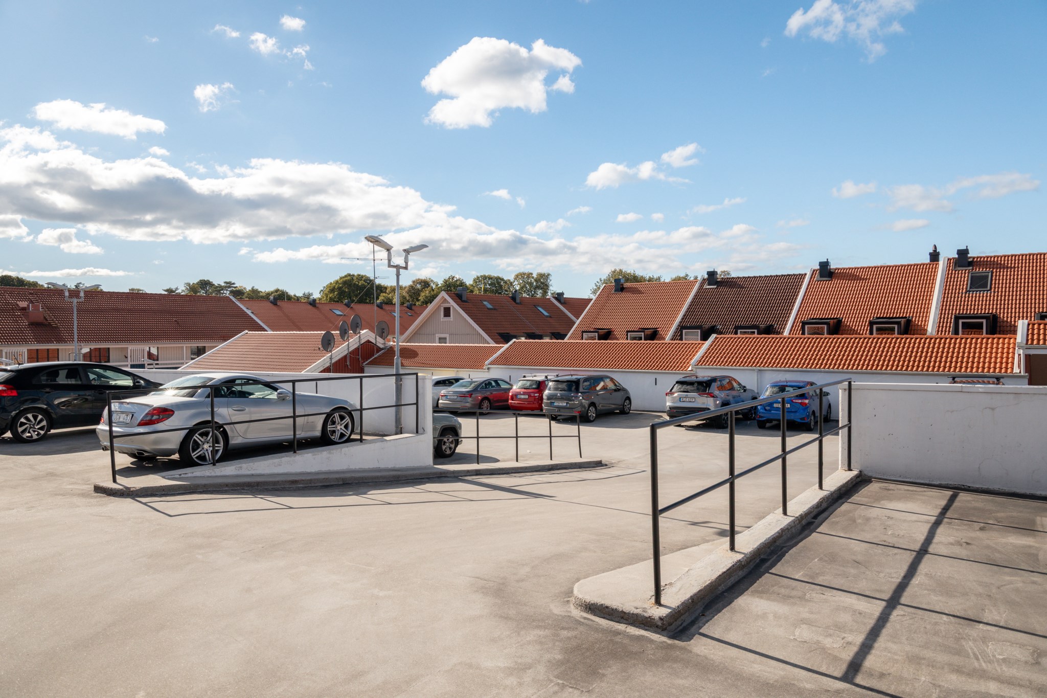 1 st parkeringsplats i garage som låses nattetid ingår i månadsavgiften samt fri parkering i p-huset för övriga i hushållet samt gäster.