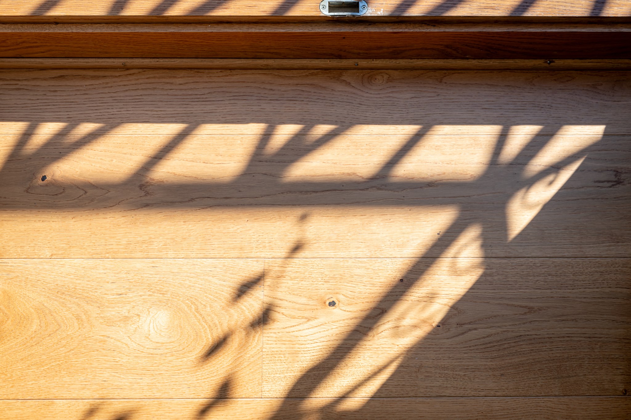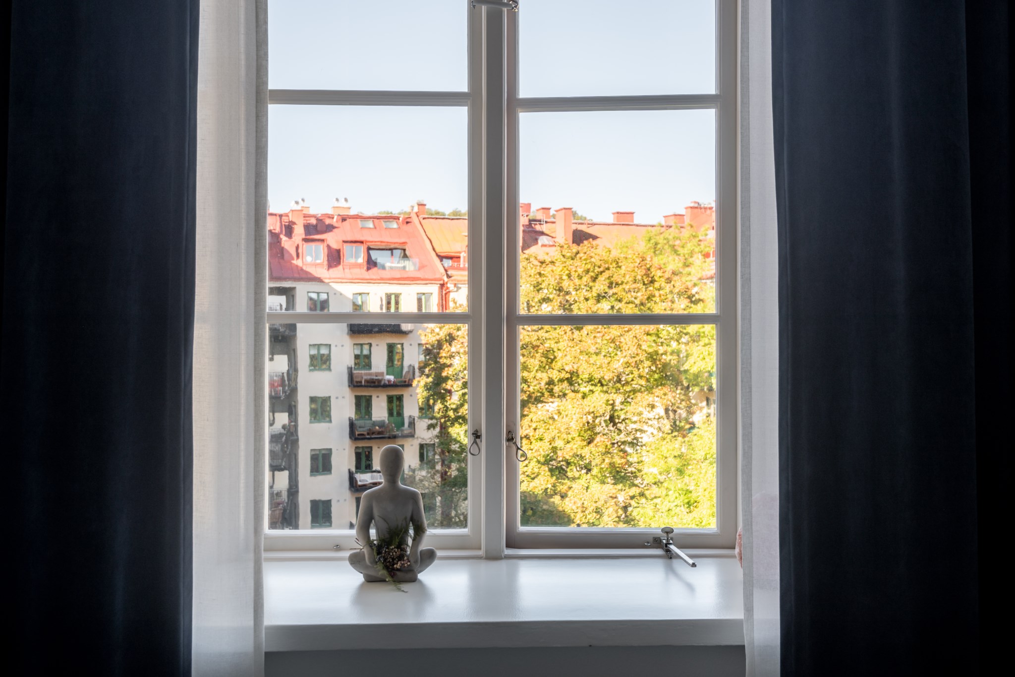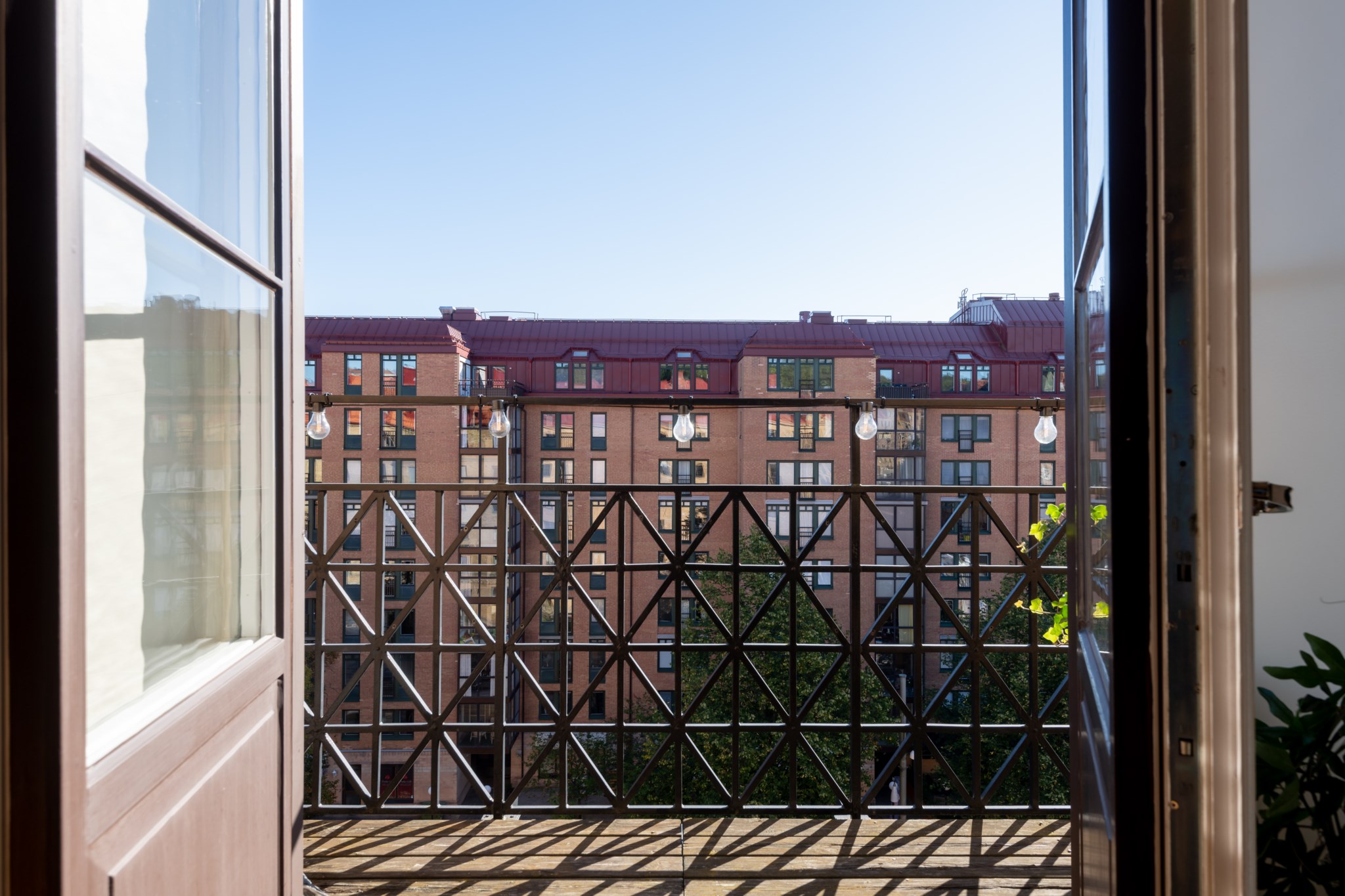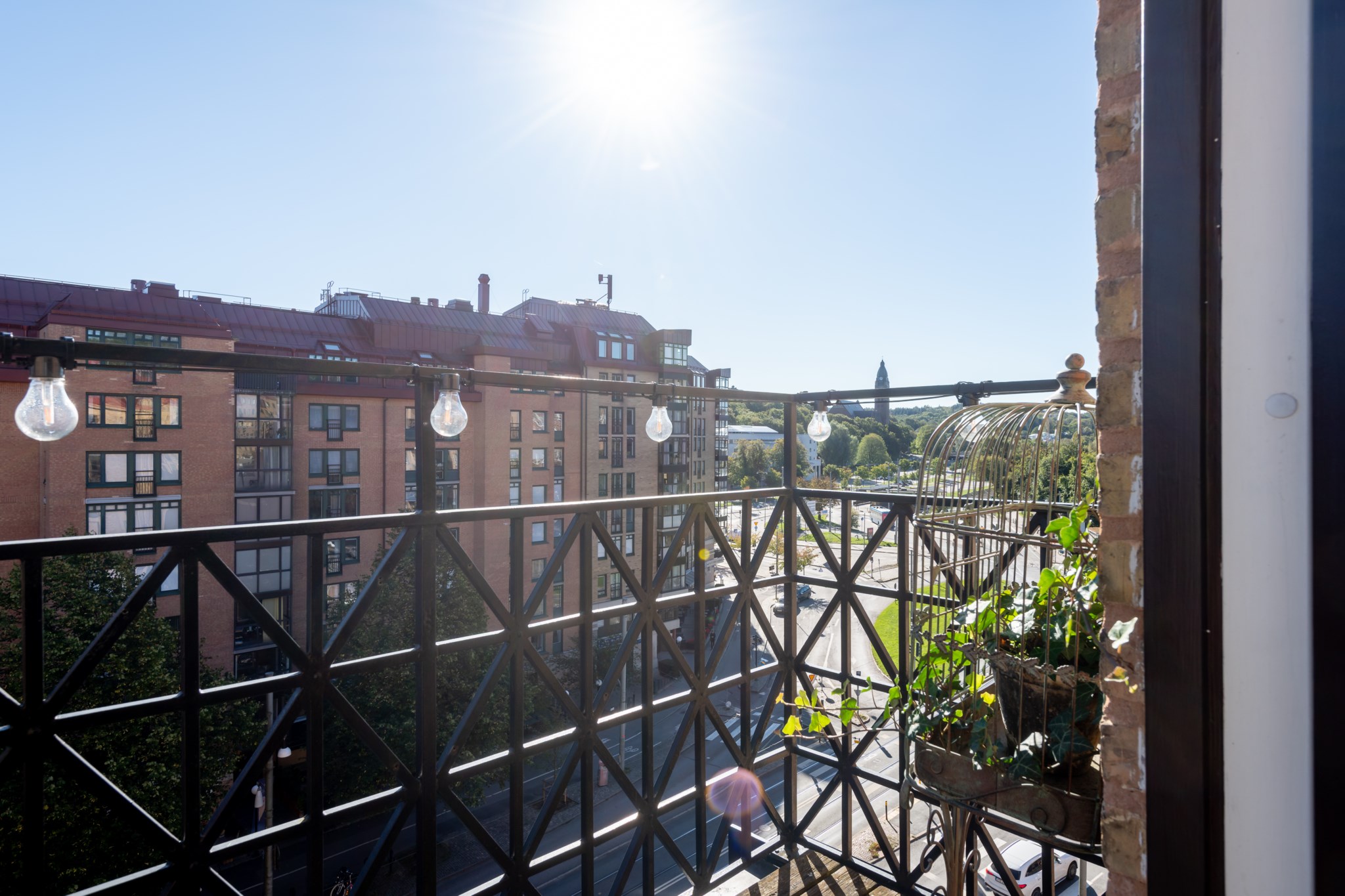 Mot Linnégatan (östläge) – nås från köket via dubbeldörrar. Här njuter man av solen från morgon till tidig eftermiddag och har utsikt över både gatan och Slottsskogen.
