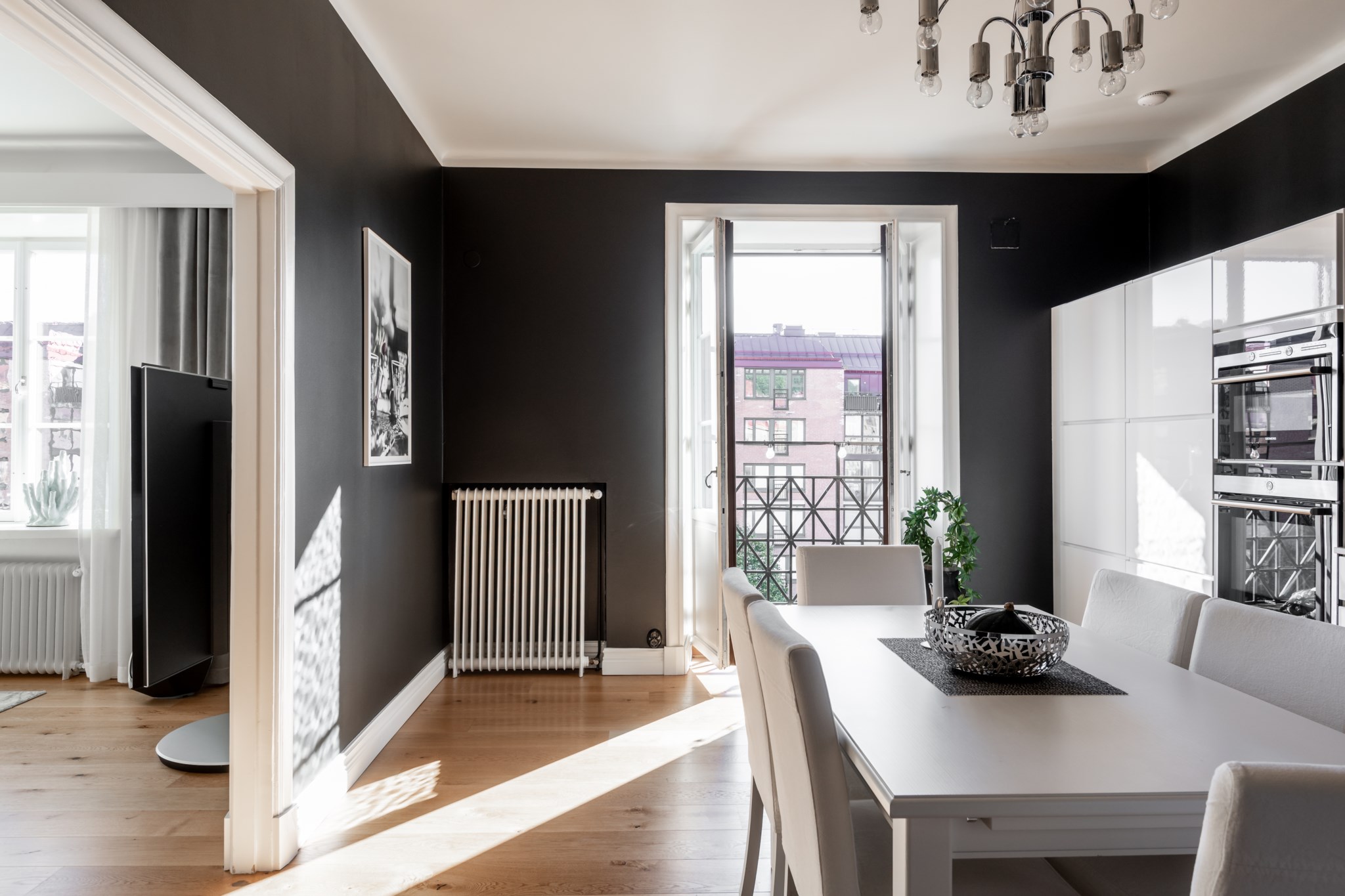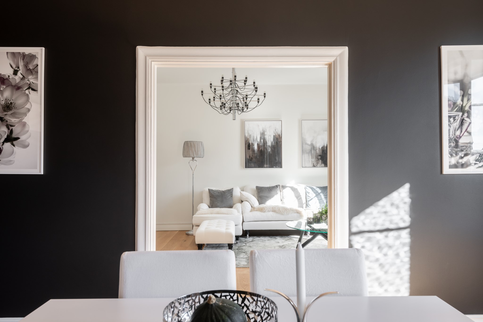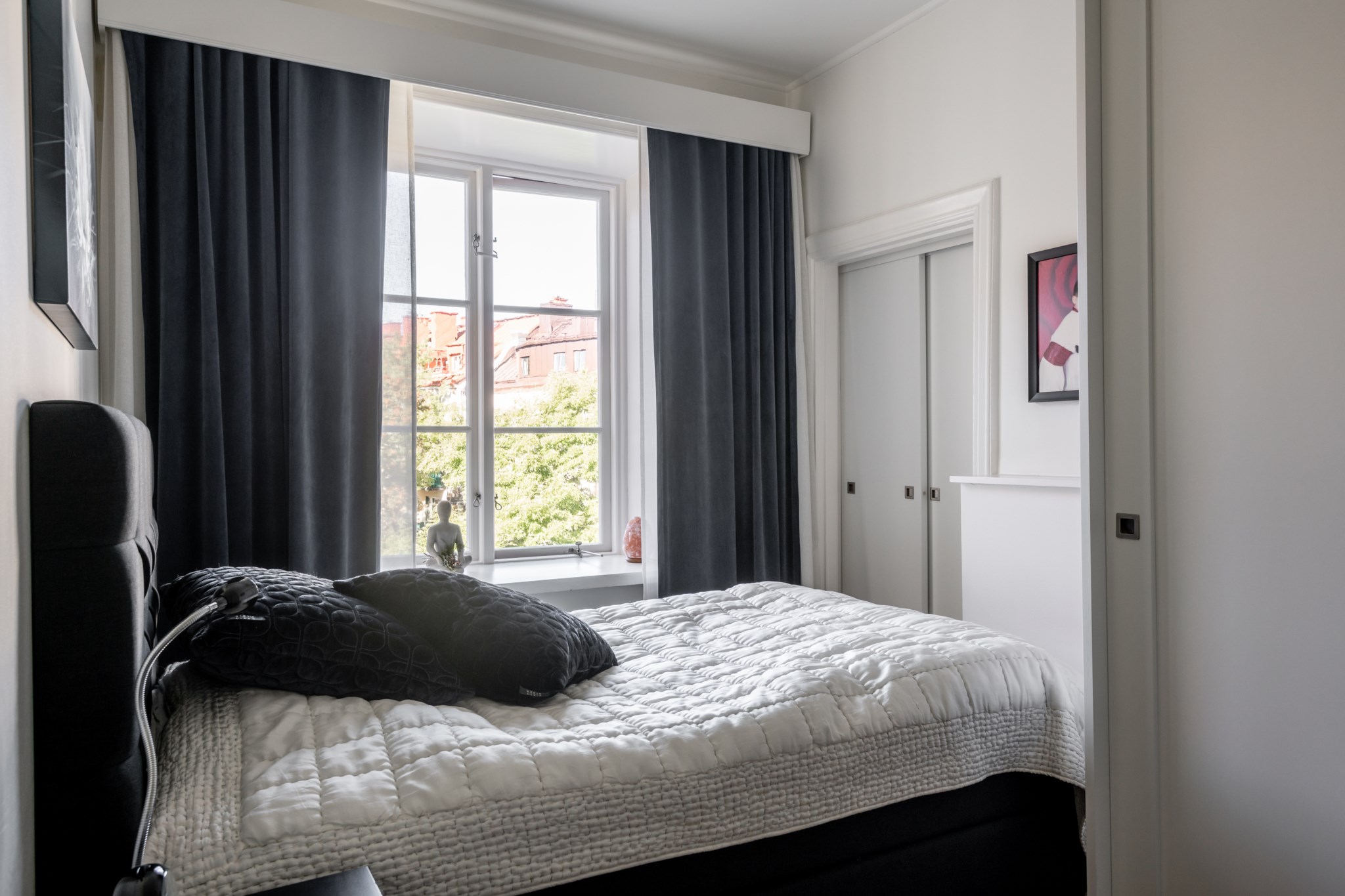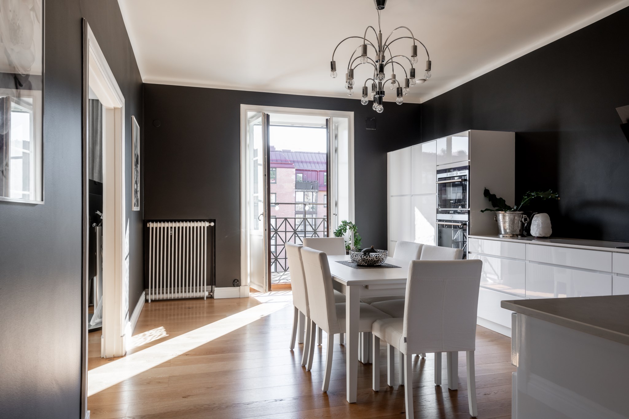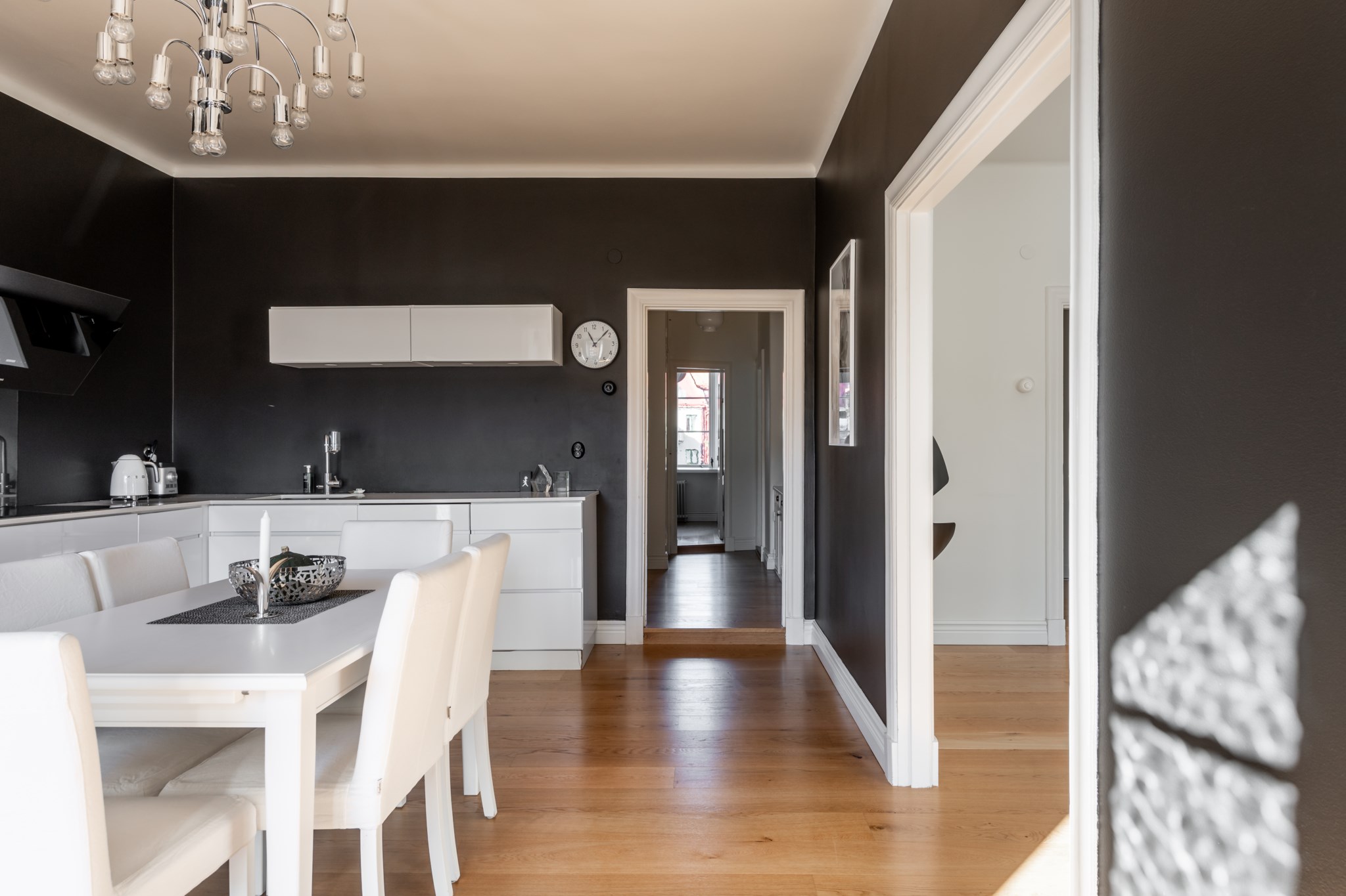 Den klassiska fiskbensparketten fortsätter från vardagsrummet, och väggarna är målade i en djupgrå nyans som framhäver de bevarade snickerierna. Via glasade dubbeldörrar nås balkongen mot Linnégatan med morgonsol fram till tidig eftermiddag.