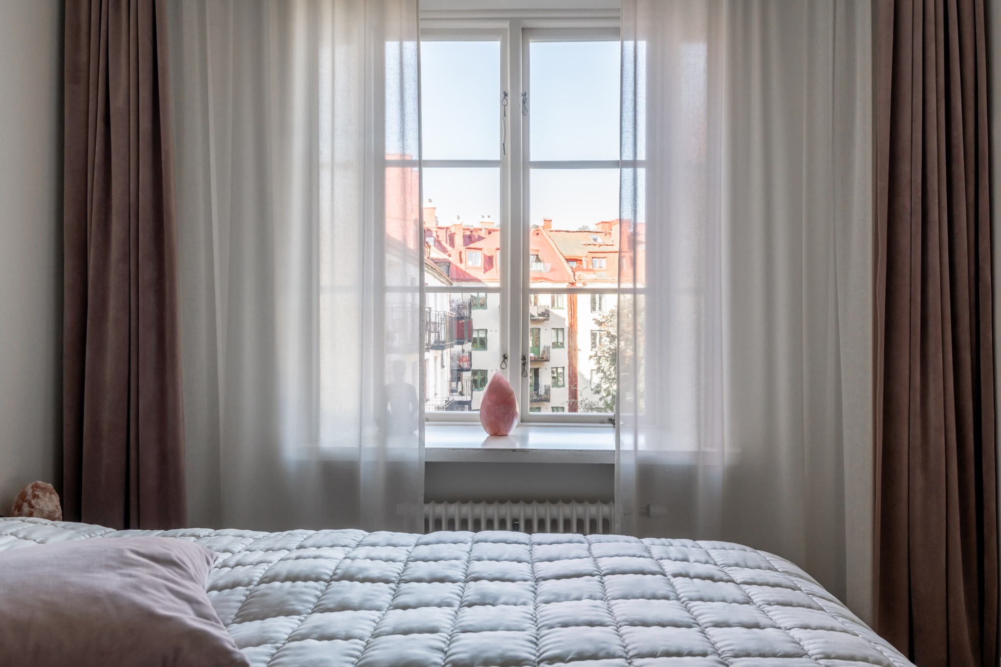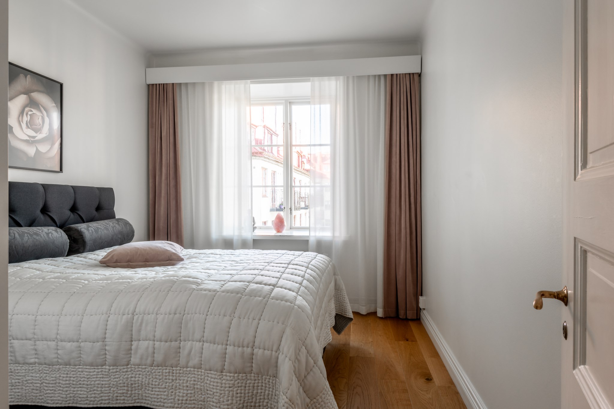 Det gamla köket har förvandlats till ett trivsamt sovrum med utgång till den gemensamma balkongen mot innergården i västerläge – med sol från sen eftermiddag till kväll. Det finns ett pågående intresse i föreningen för att bygga privata balkonger mot gården, men projektet är i ett tidigt skede.