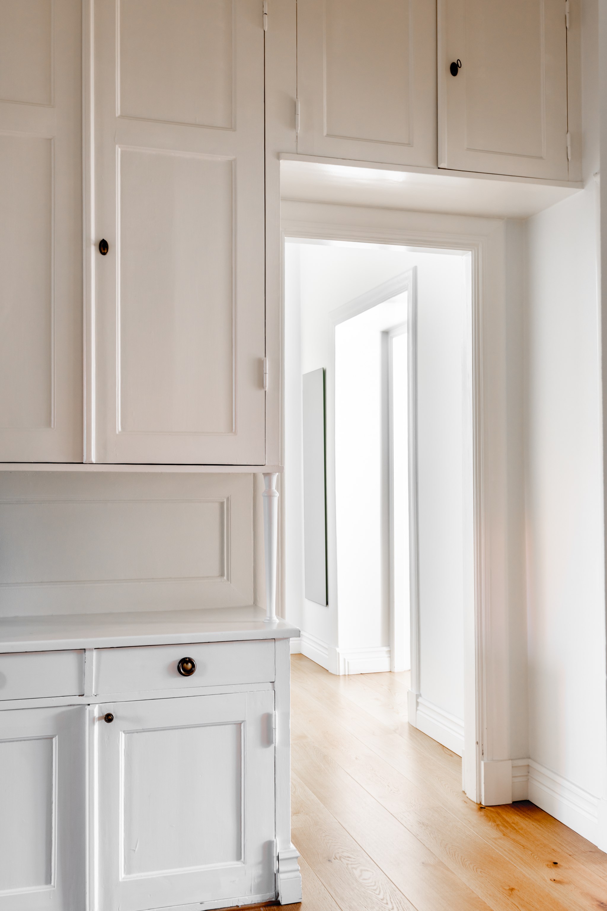 Lägenheten präglas av generös takhöjd, originalgolv i brädor och fiskbensparkett, bevarade listverk, djupa fönsternischer och vackra spegeldörrar. Även den klassiska serveringsgången finns kvar i originalutförande med skåp från golv till tak – både praktisk och vacker. Elsystemet har uppdaterats med strömbrytare och uttag i tidstypisk stil.