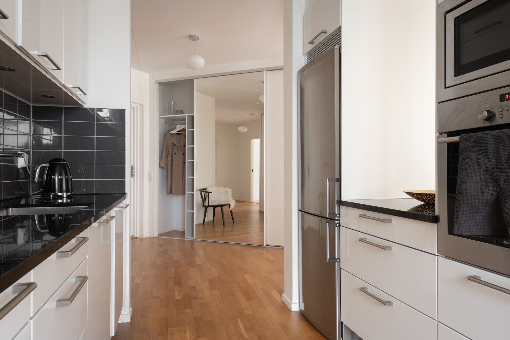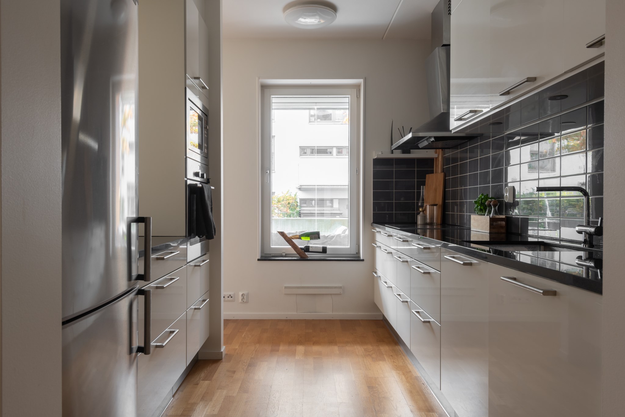 Köket är stilrent, välplanerat och fullt av karaktär – med vita högblanka luckor, rostfria vitvaror och mörkt kakel som skapar en elegant kontrast.