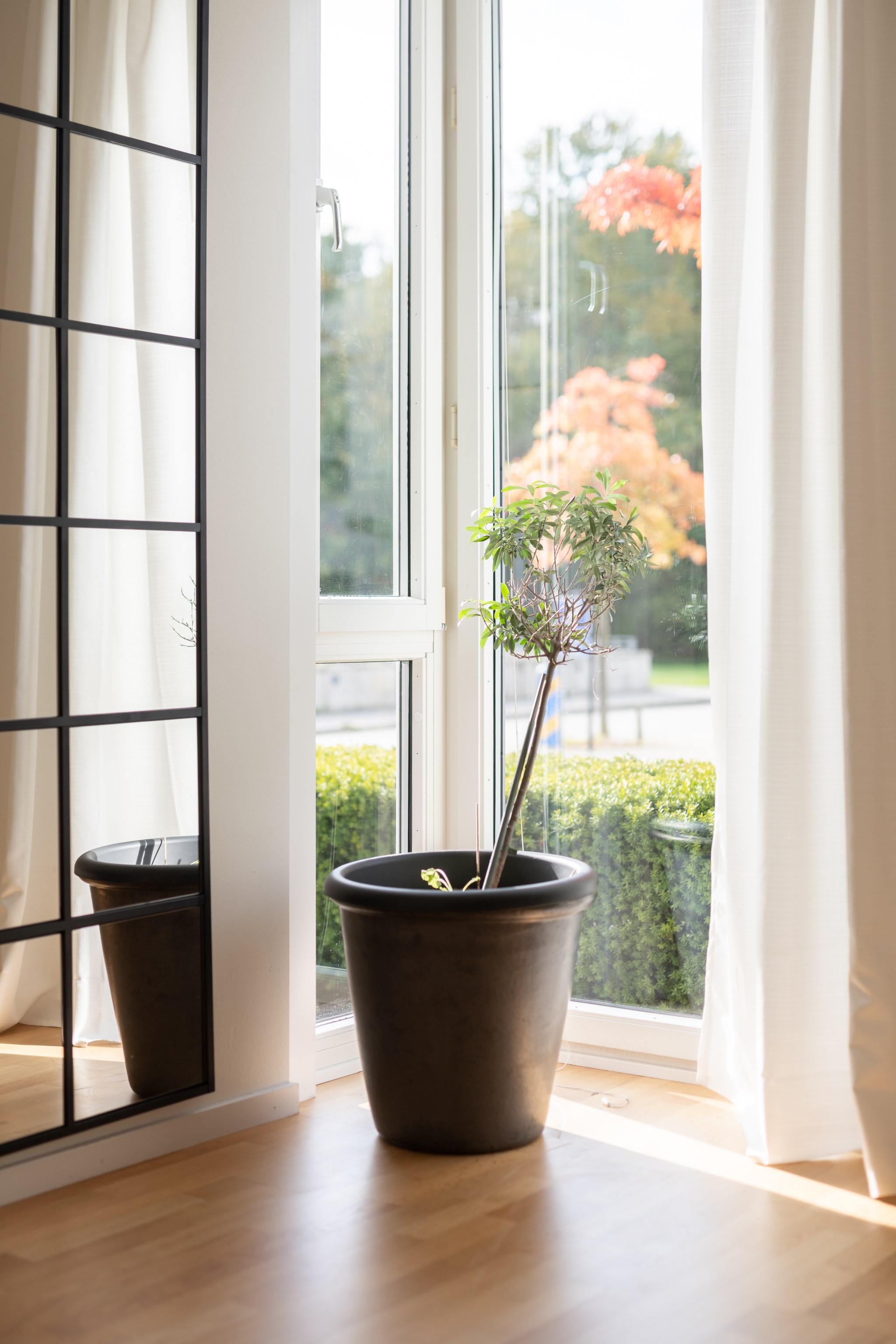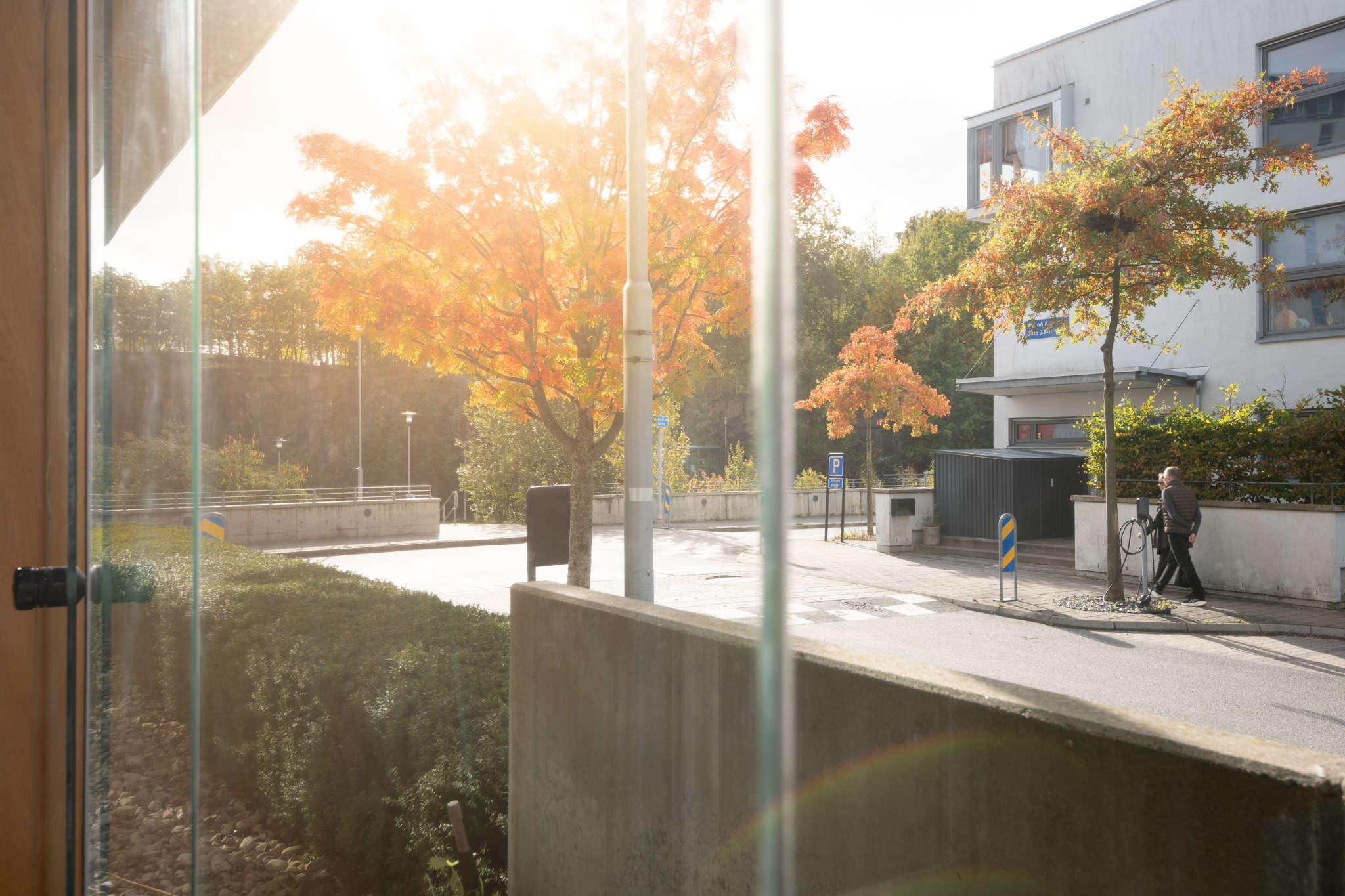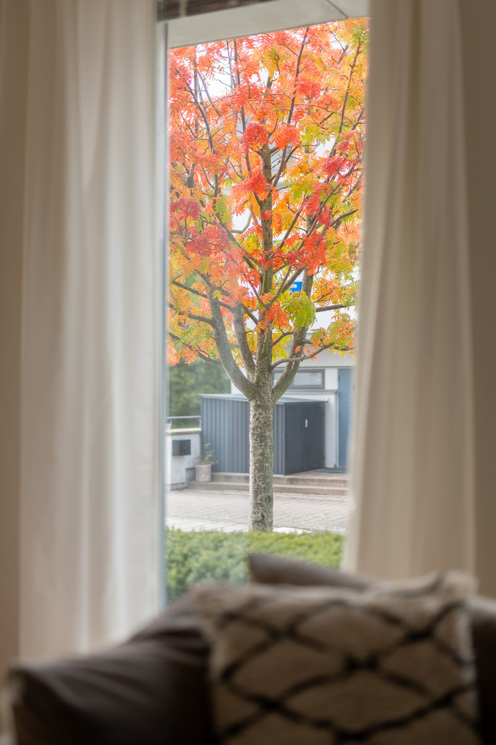 Genom fönstren flödar ljuset in tillsammans med blicken mot grönskan utanför, vilket skapar en lugn och naturlig koppling mellan ute och inne – som om naturen själv vore en del av inredningen. Från vardagsrummet kliver du dessutom rakt ut till den inglasade uteplatsen som förlänger rummet och ger plats för både vila och gemenskap i solens varma sken.