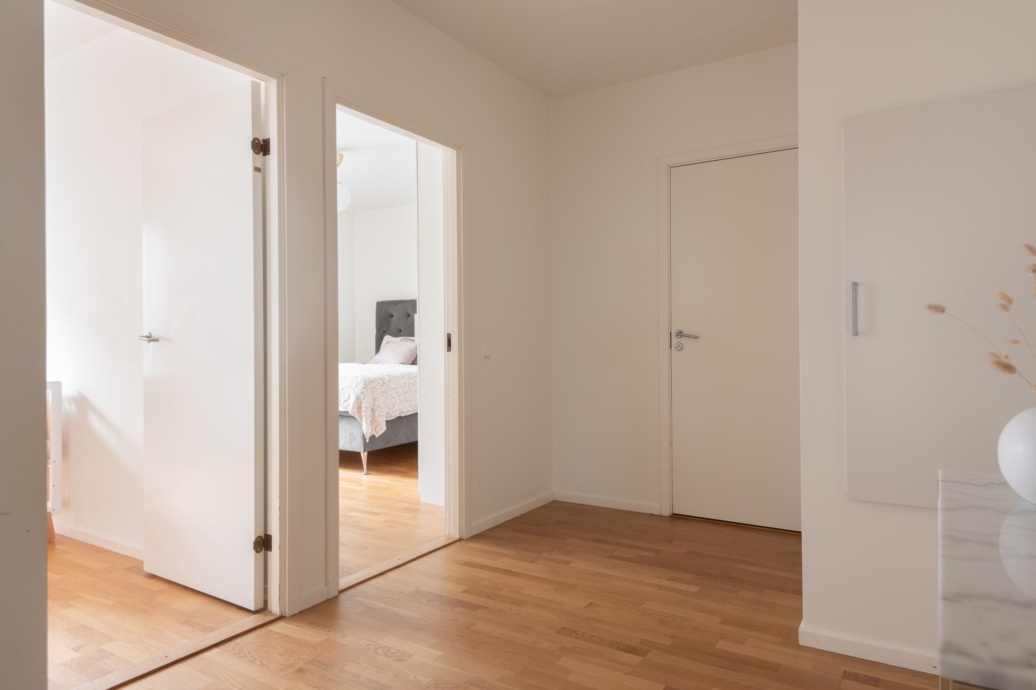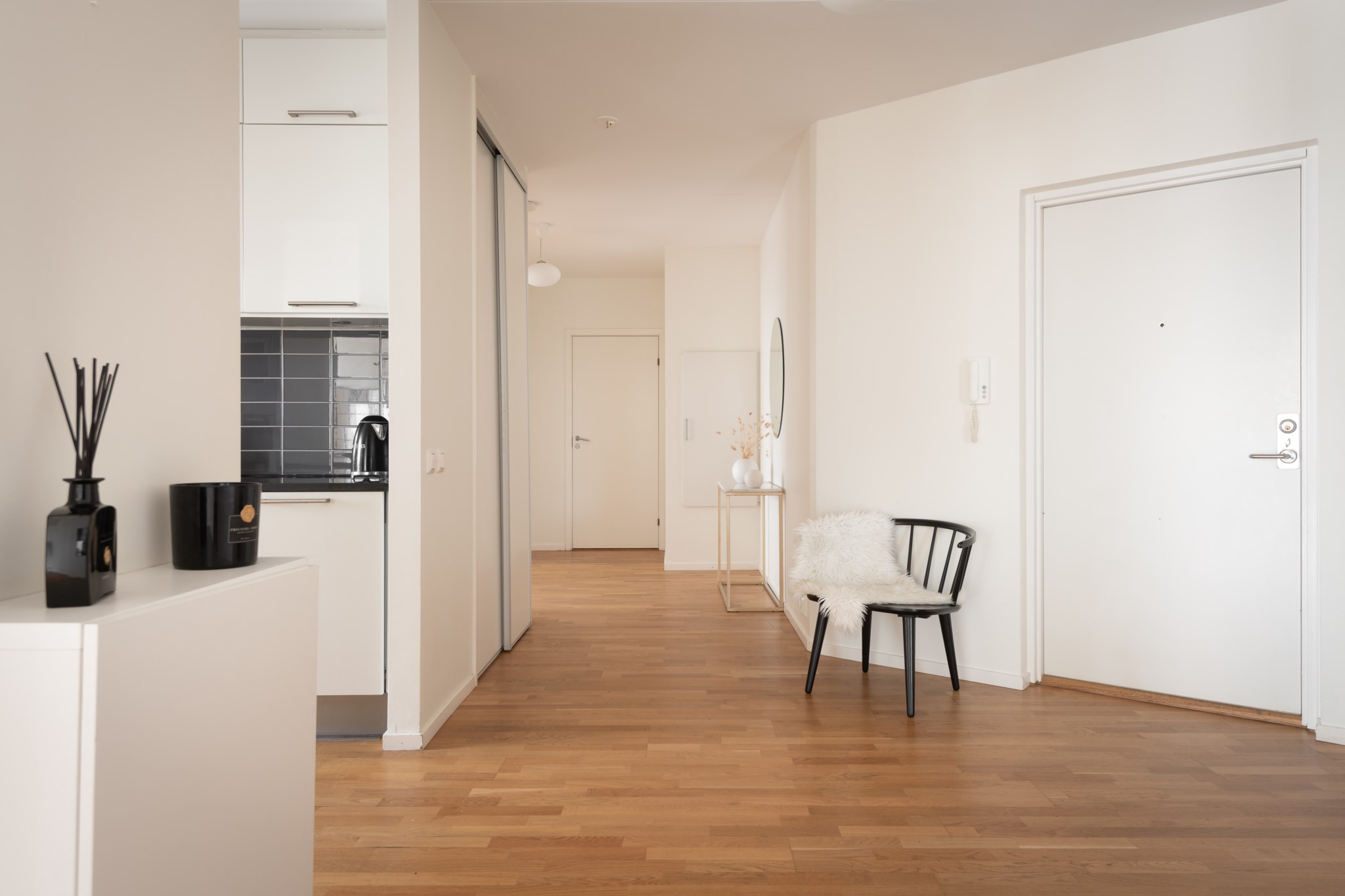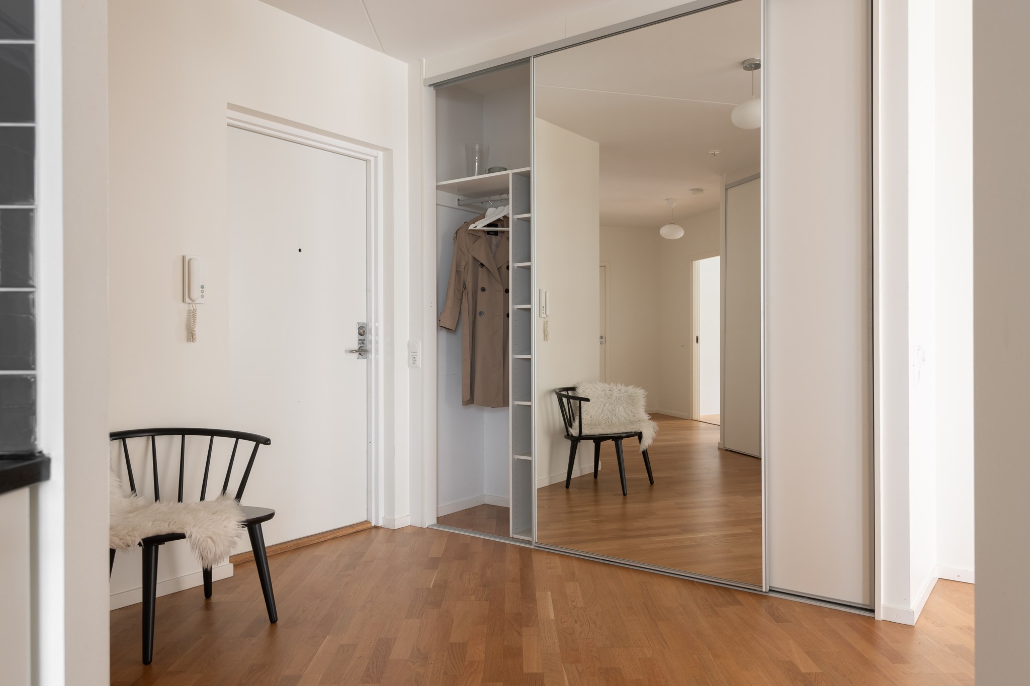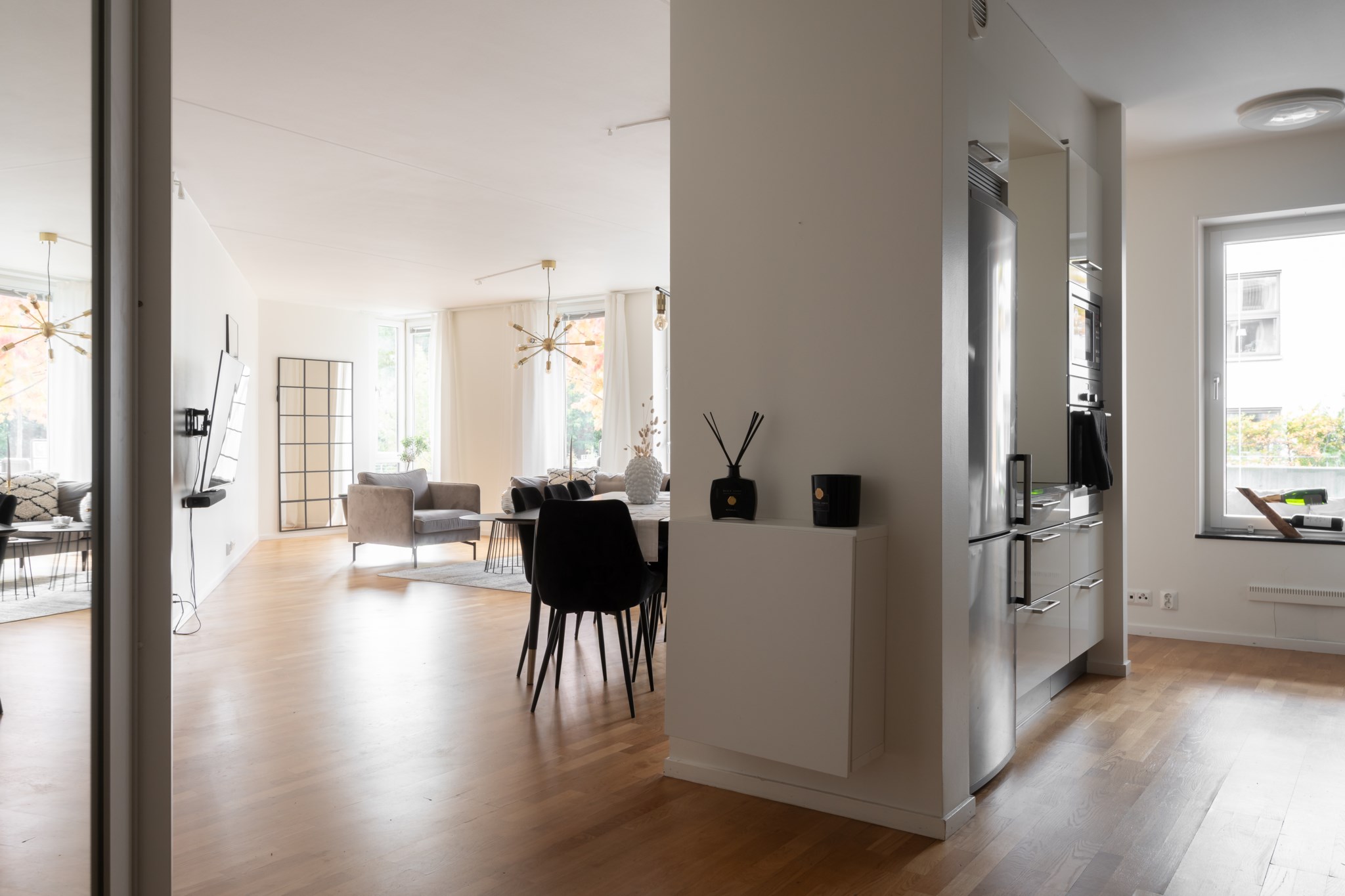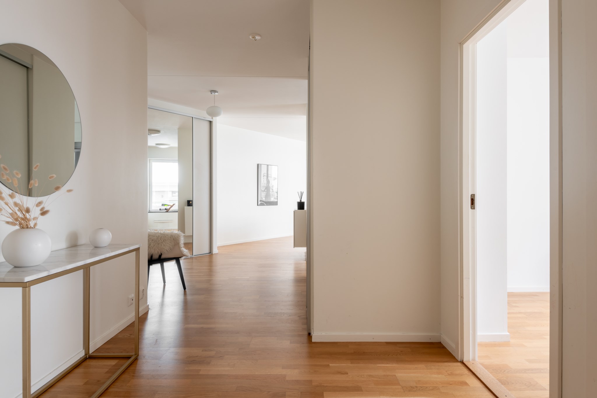 När du kliver in möts du av ett hem som andas ljus och harmoni. Den generösa planlösningen bjuder på öppna sociala ytor, stora fönsterpartier och en atmosfär som känns både elegant och avslappnad. Här flödar dagsljuset in från flera håll och skapar en varm, välkomnande känsla genom hela bostaden. Här finns gott om plats för avhängning och förvaring, samtidigt som hallen binder samman bostadens alla delar på ett naturligt och inbjudande sätt.