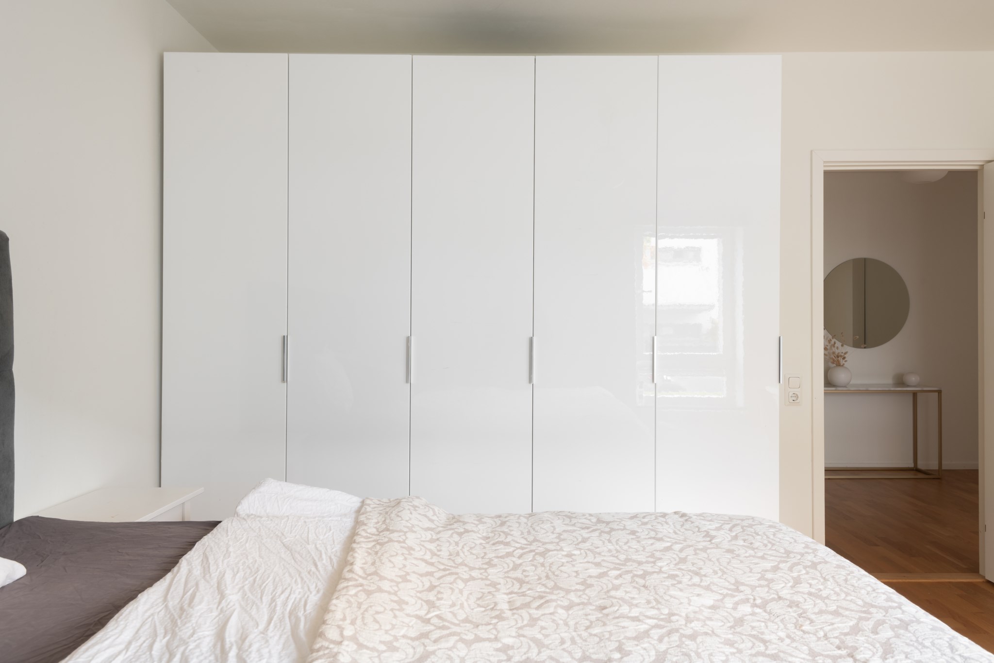Ett harmoniskt och trivsamt sovrum med plats för dubbelsäng, sängbord och gott om förvaring.