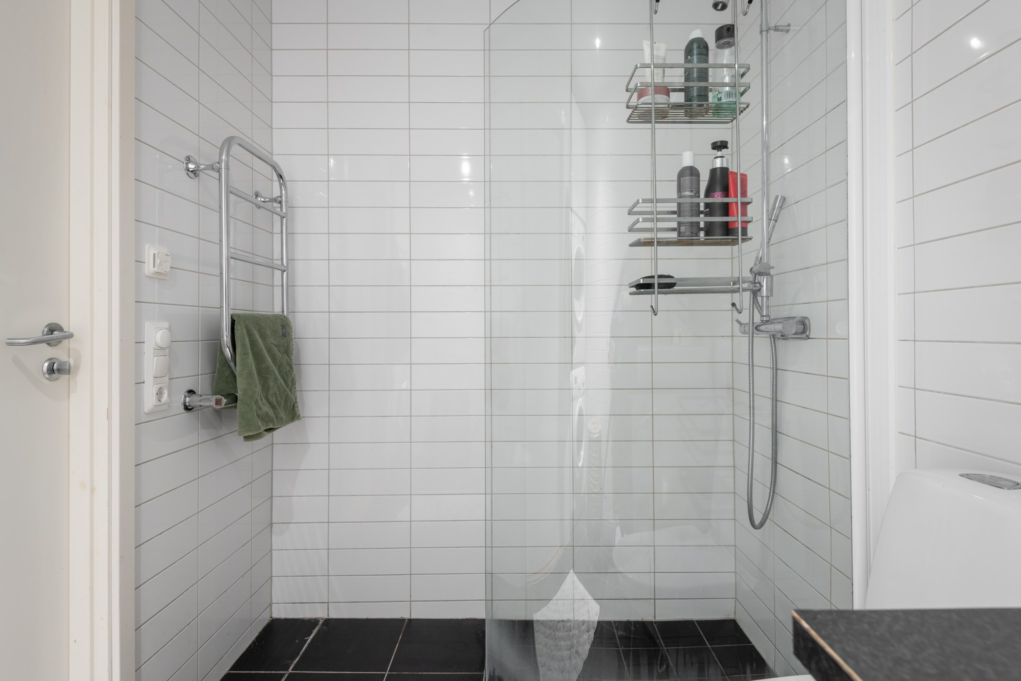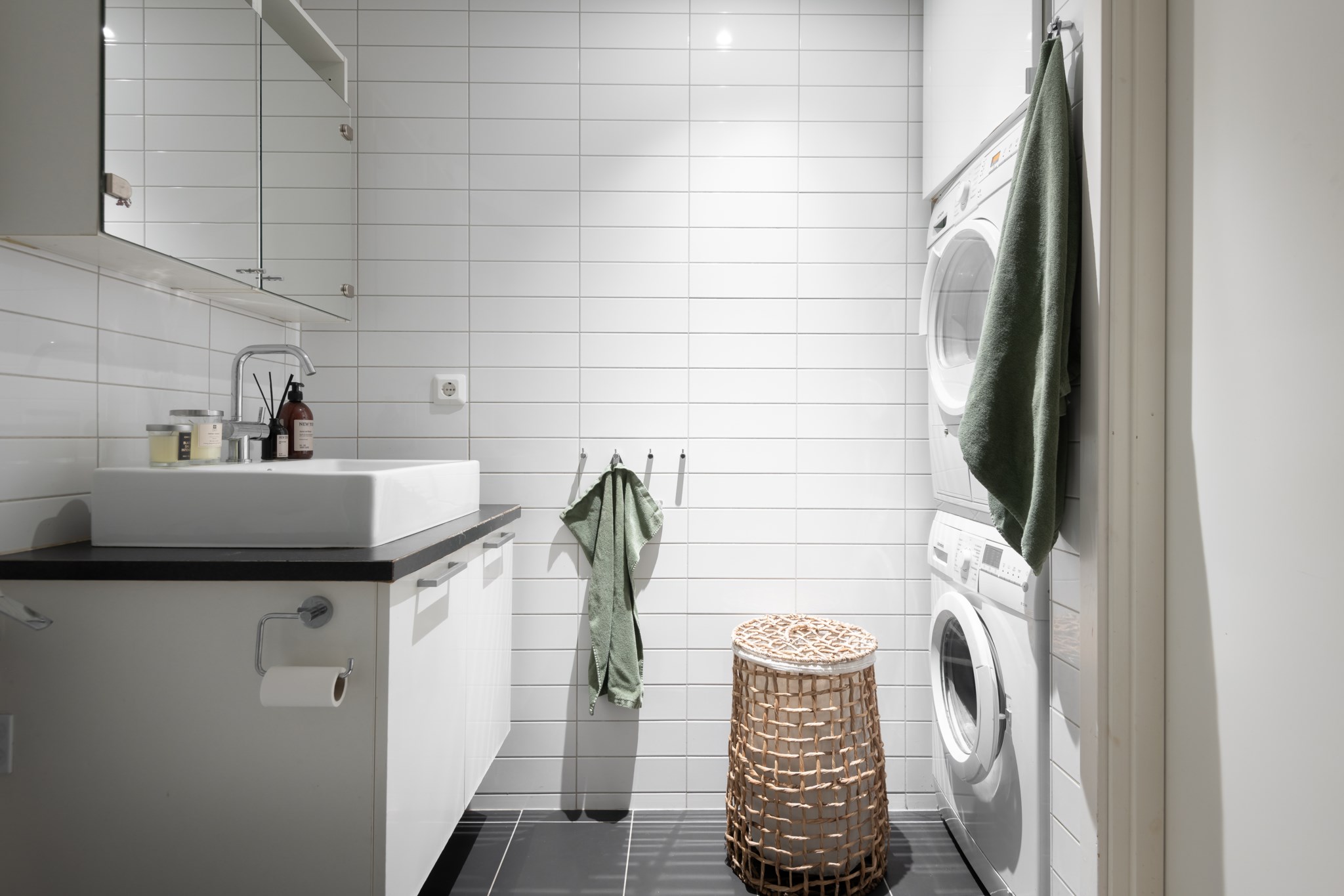 Det helkaklade badrummet är modernt och elegant med dusch och tvättavdelning med tvättmaskin samt torktumlare. Här möts stilrena detaljer och ljusa materialval som ger en känsla av både vardagslyx och funktionalitet. En plats där du startar dagen med energi och avslutar den i ro.