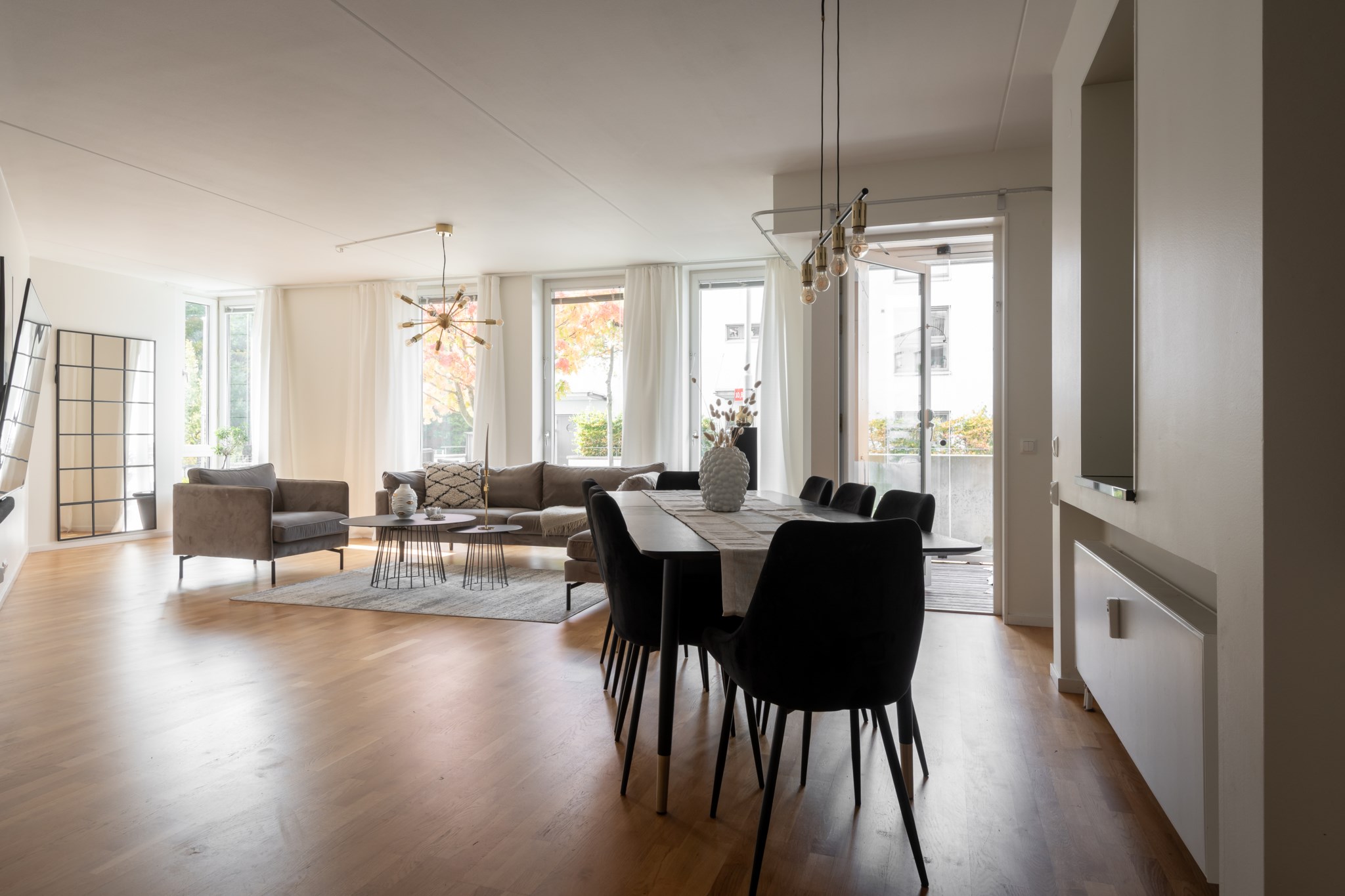 Här bjuder rummet på rymliga ytor med plats för både soffgrupp, fåtöljer och matsalsdel, och den öppna planlösningen mot köket gör att hemmet känns både socialt och harmoniskt.