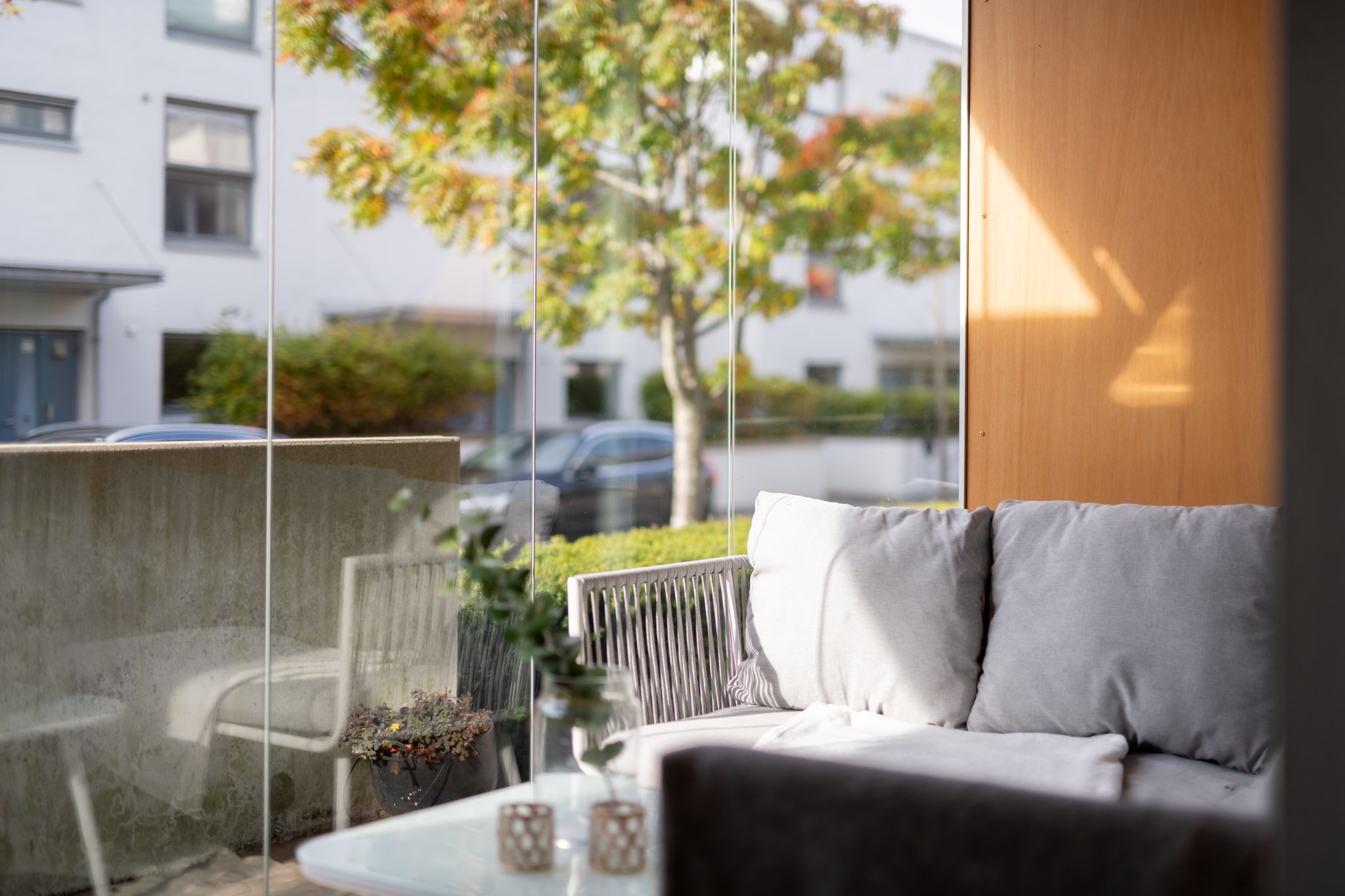 Den generösa inglasade uteplatsen i västerläge är ett av hemmets absoluta guldkorn. Här njuter du av solen från eftermiddag till sen kväll – året runt. De skjutbara glaspartierna gör att rummet kan användas under större delen av året, och du kan skapa din egen oas med loungemöbler, växter och textilier.