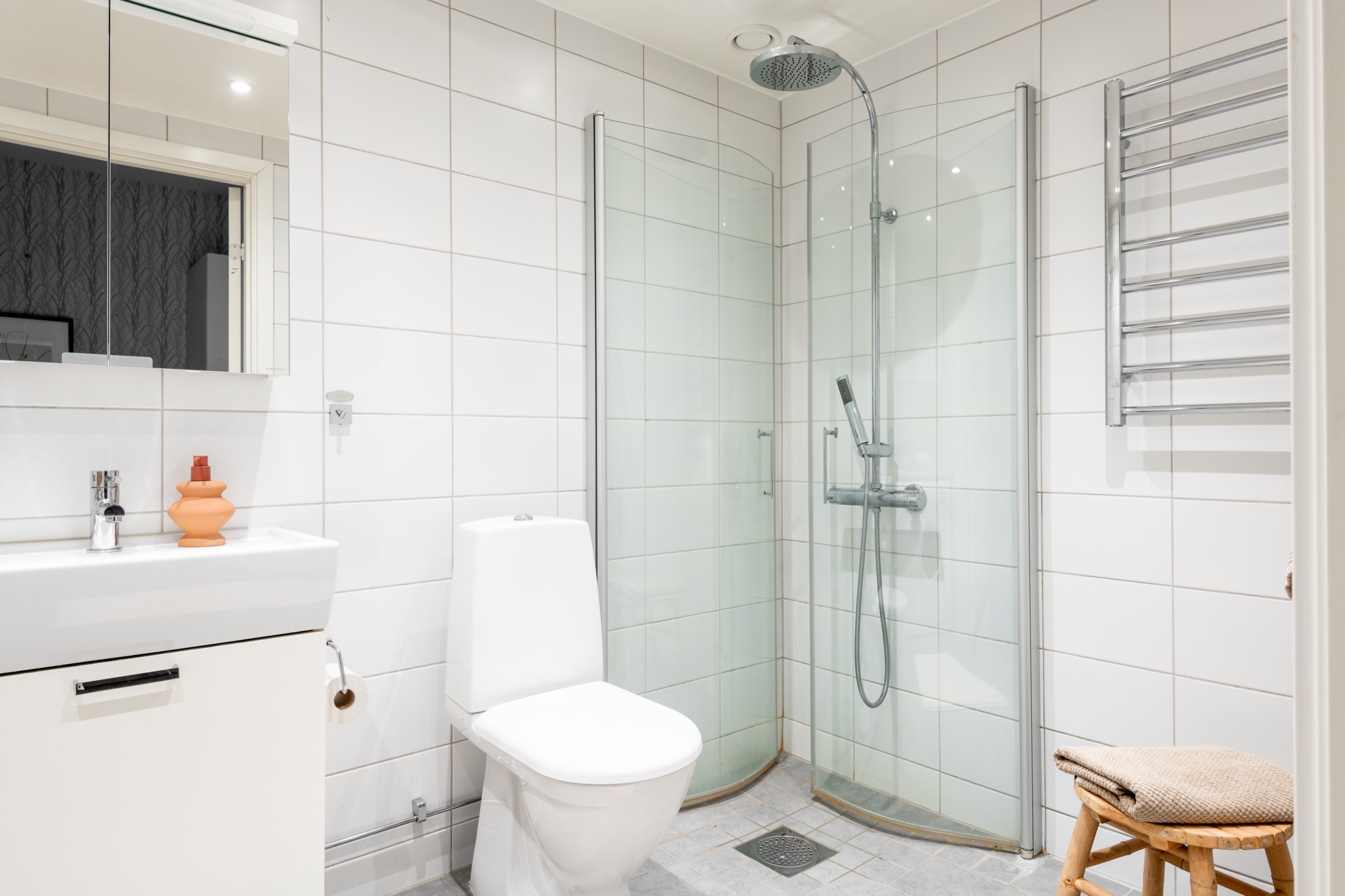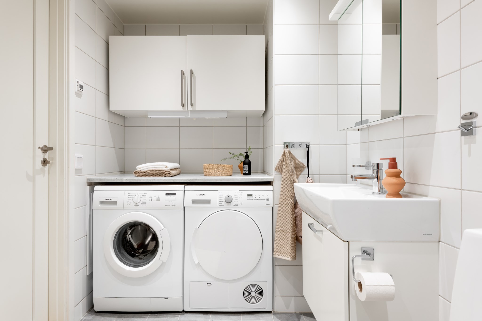 Det helkaklade badrumet är modernt utformat och utrustat med både tvättmaskin och torktumlare – ett uppskattat inslag i vardagen som gör livet lite enklare.