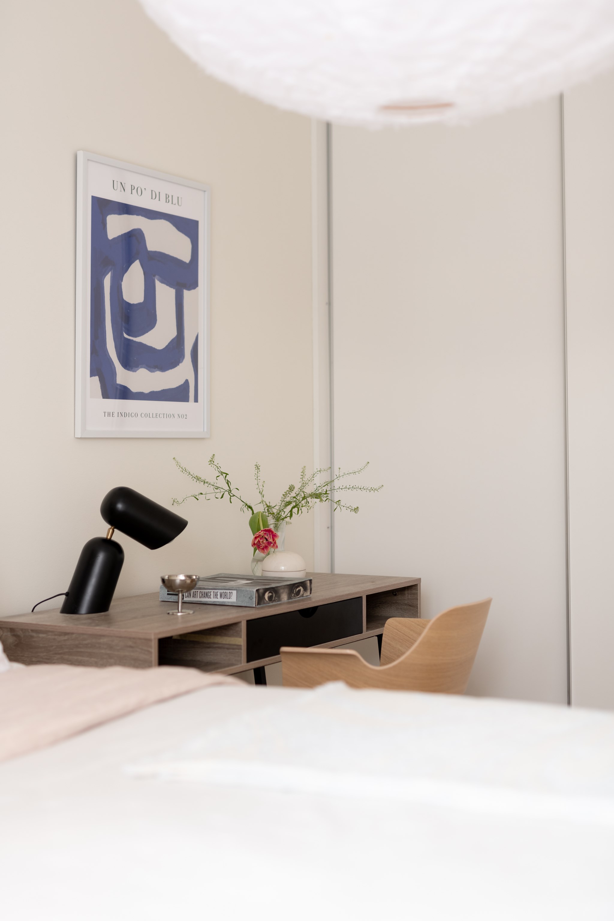 Det rofyllda sovrummet ligger avskilt och erbjuder gott om förvaring. Här får du en plats att landa, stänga om dig och bara vara.