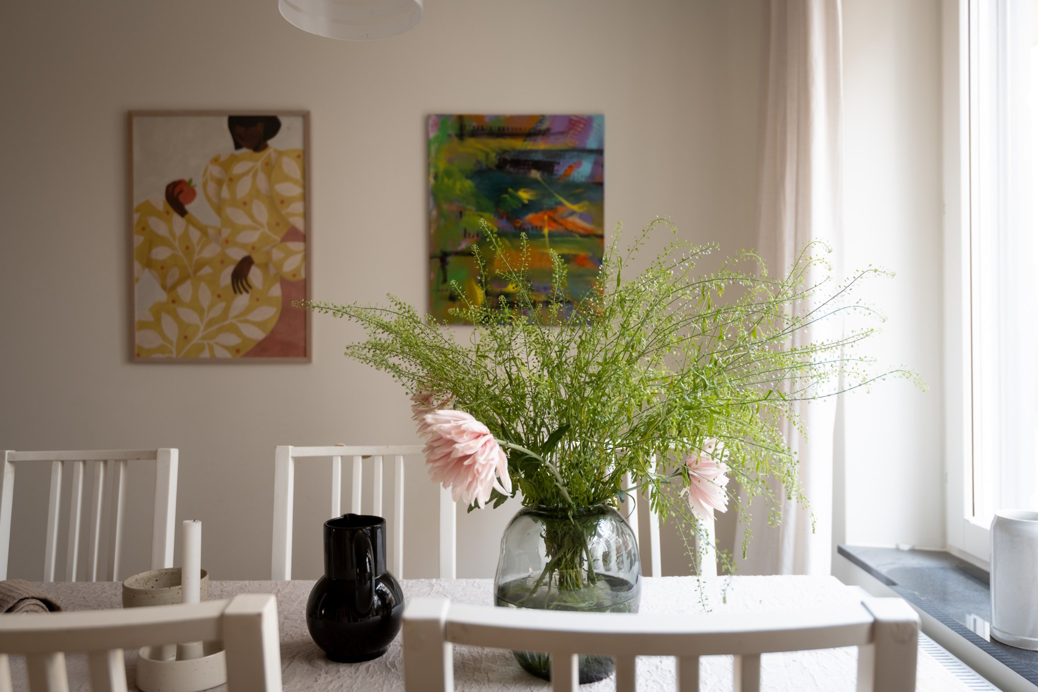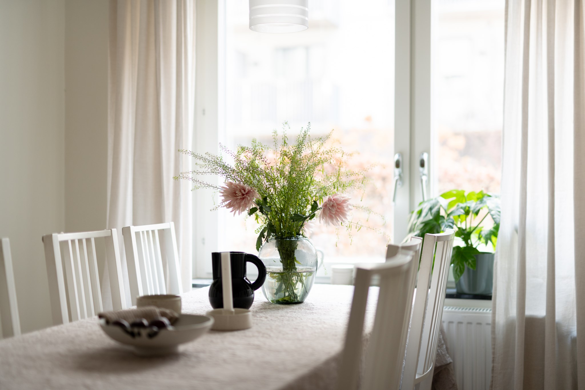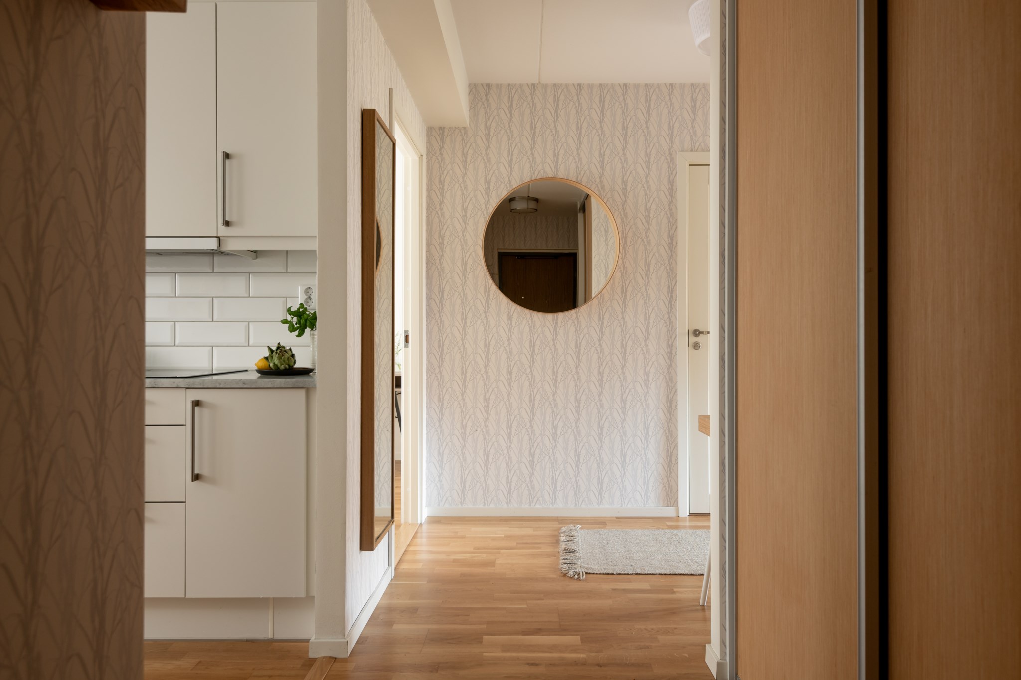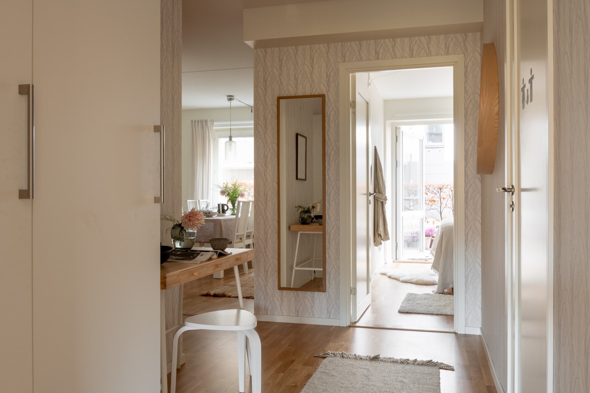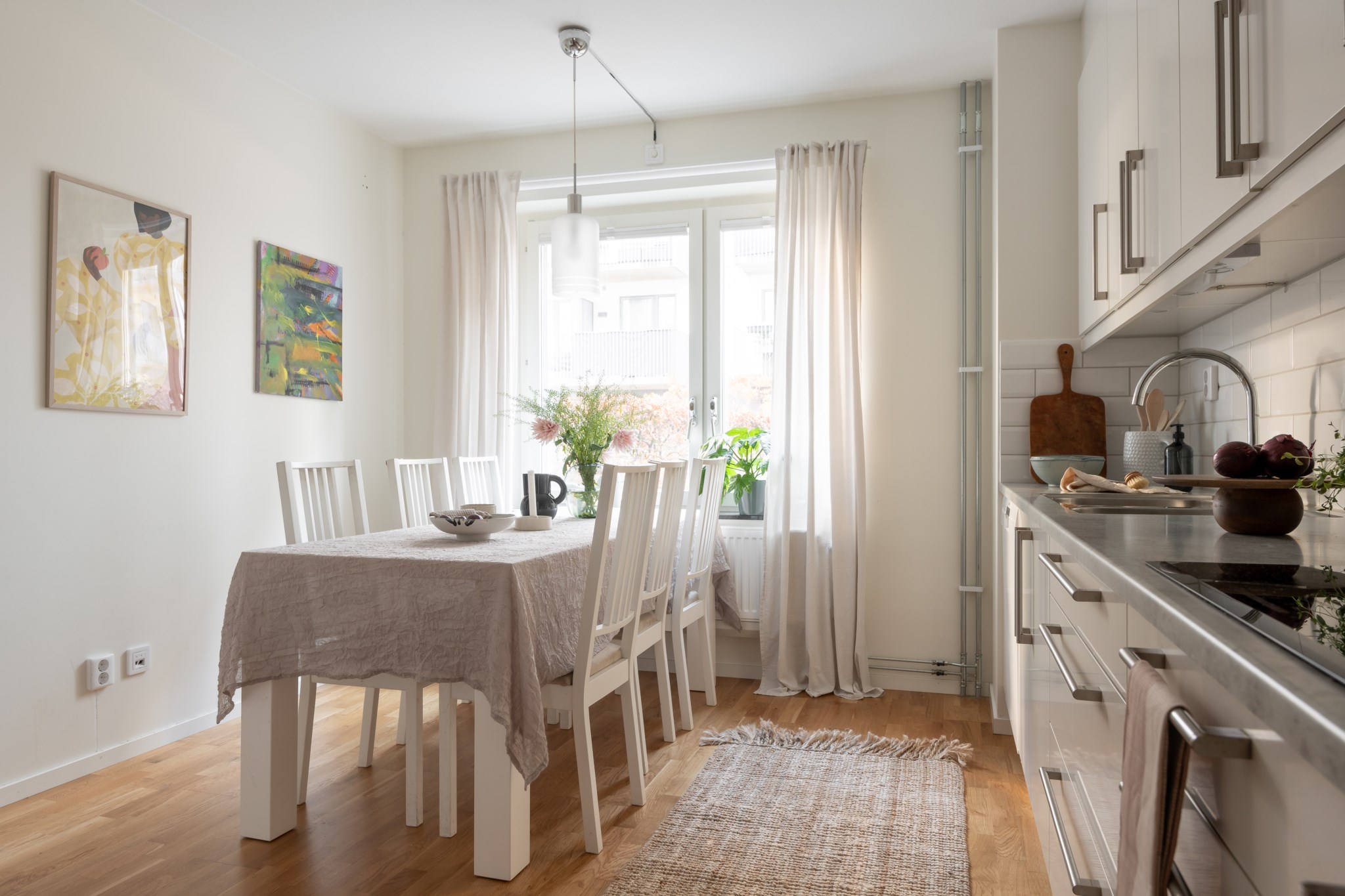 Bostadens 63 kvadratmeter är smart disponerade och präglas av ljusa ytskikt, fina materialval och en känsla av rymd. Det stilrena köket från HTH smälter samman i genomgång med vardagsrummet och skapar en social och inbjudande yta där både stora middagar och lugna hemmakvällar känns helt rätt.