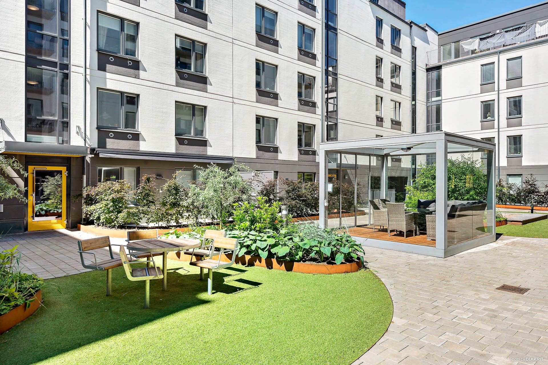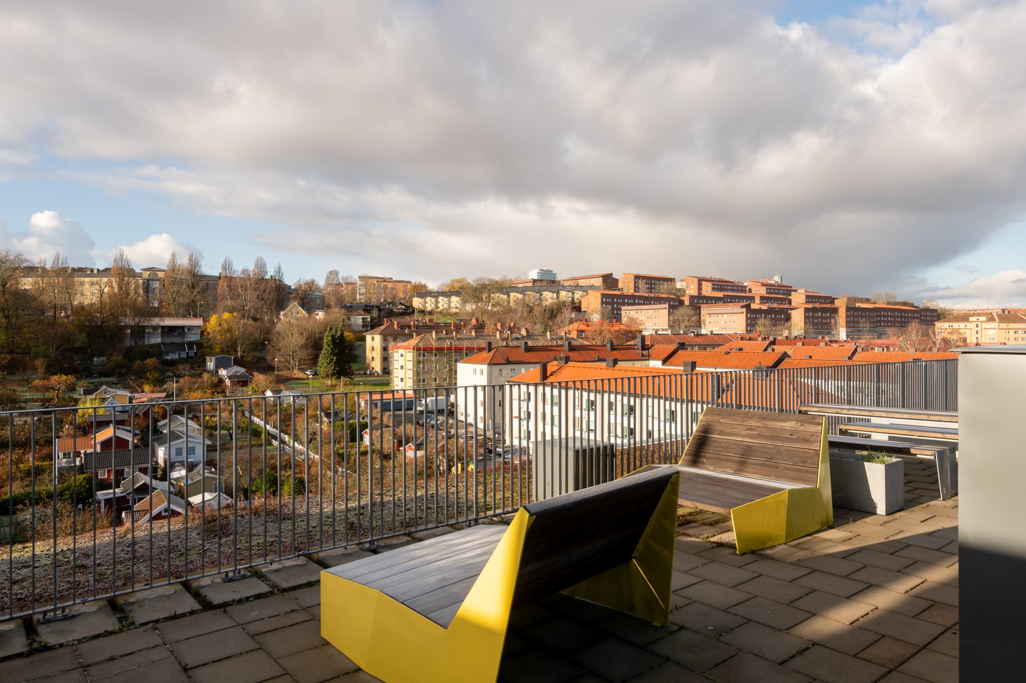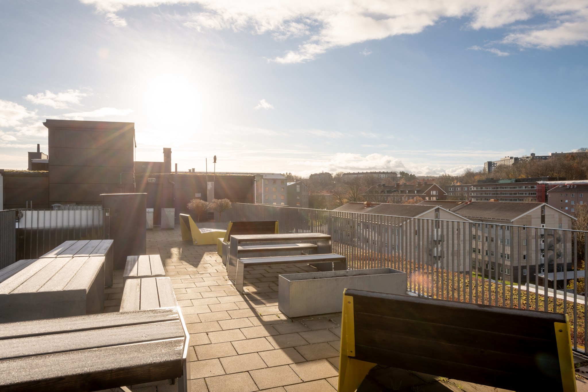 Föreningens stora takterrass om hela 165 kvm finns bara några våningar upp. En självklar plats för dig som vill njuta av kvällssolen, umgås med vänner eller se dagen sakta klinga av över kvarteret.